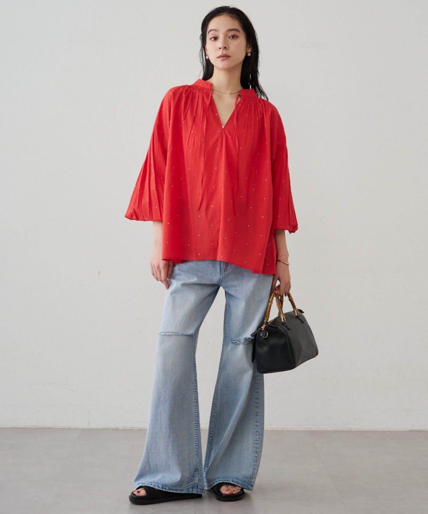 首元は程よく抜け感の出るスキッパーデザインで、甘さを抑えた大人の印象に。