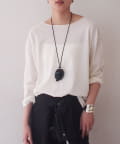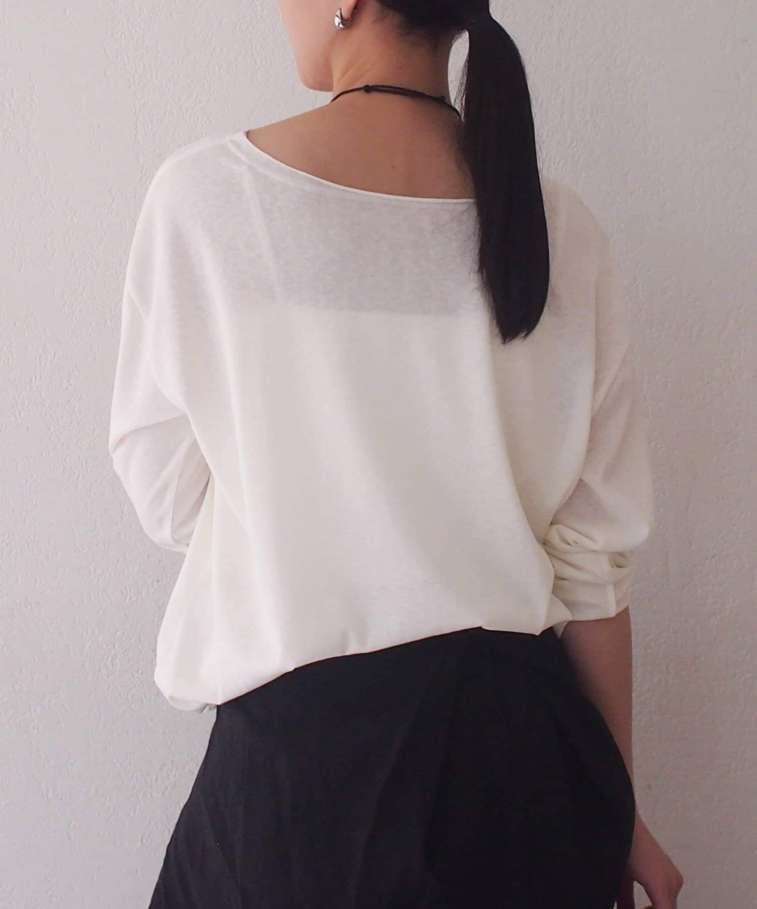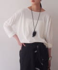 ふんわりとした柔らかな生地がシンプルなデザインに奥行きをプラスします。さらりとした肌触りで着心地も良く、程よくゆとりのあるシルエットが体のラインを拾わずリラックス感のある着こなしに。デイリーにもおうち時間にも活躍する一枚です。