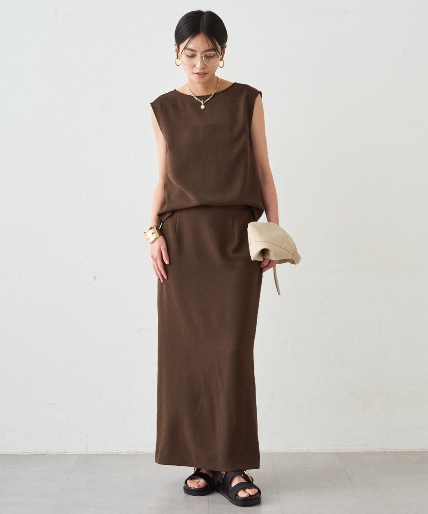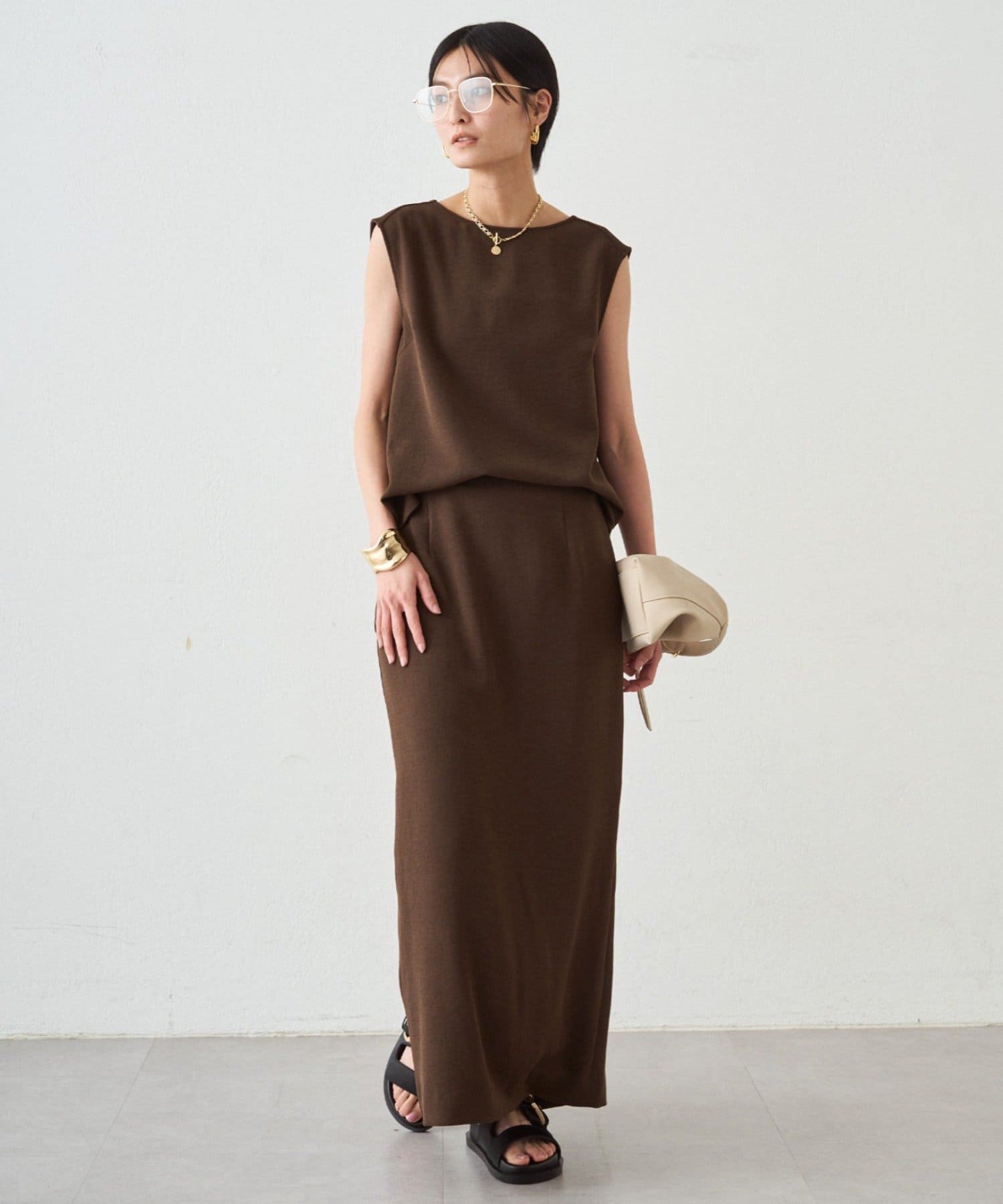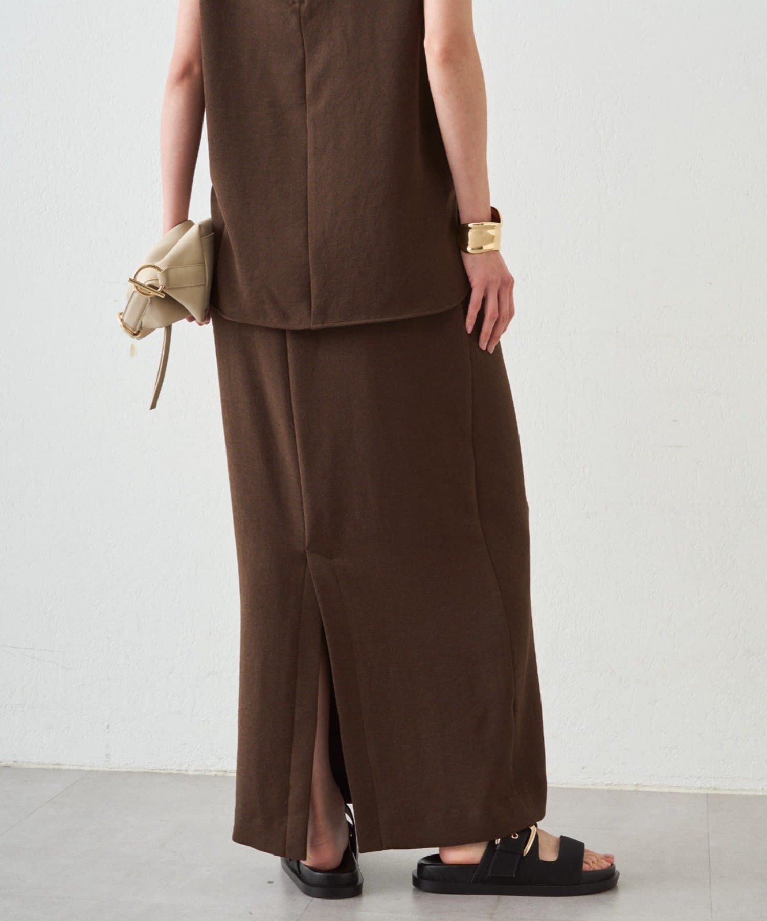 同シリーズのダブルジョーゼットノースリブラウスとセットアップでの着用もおすすめです。
