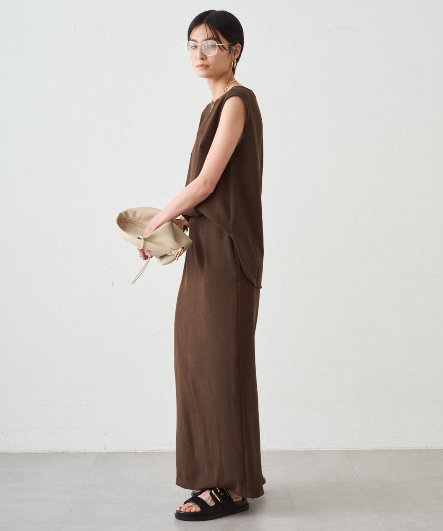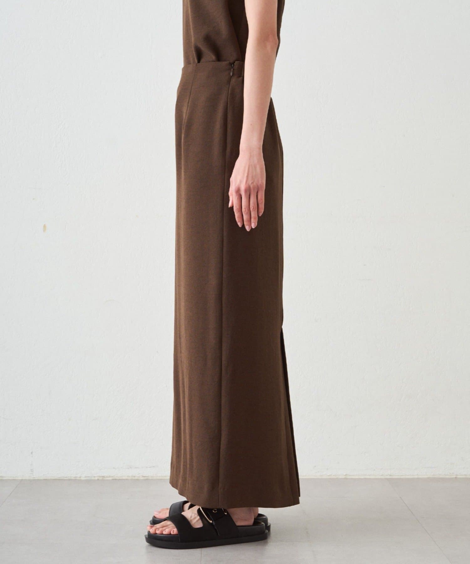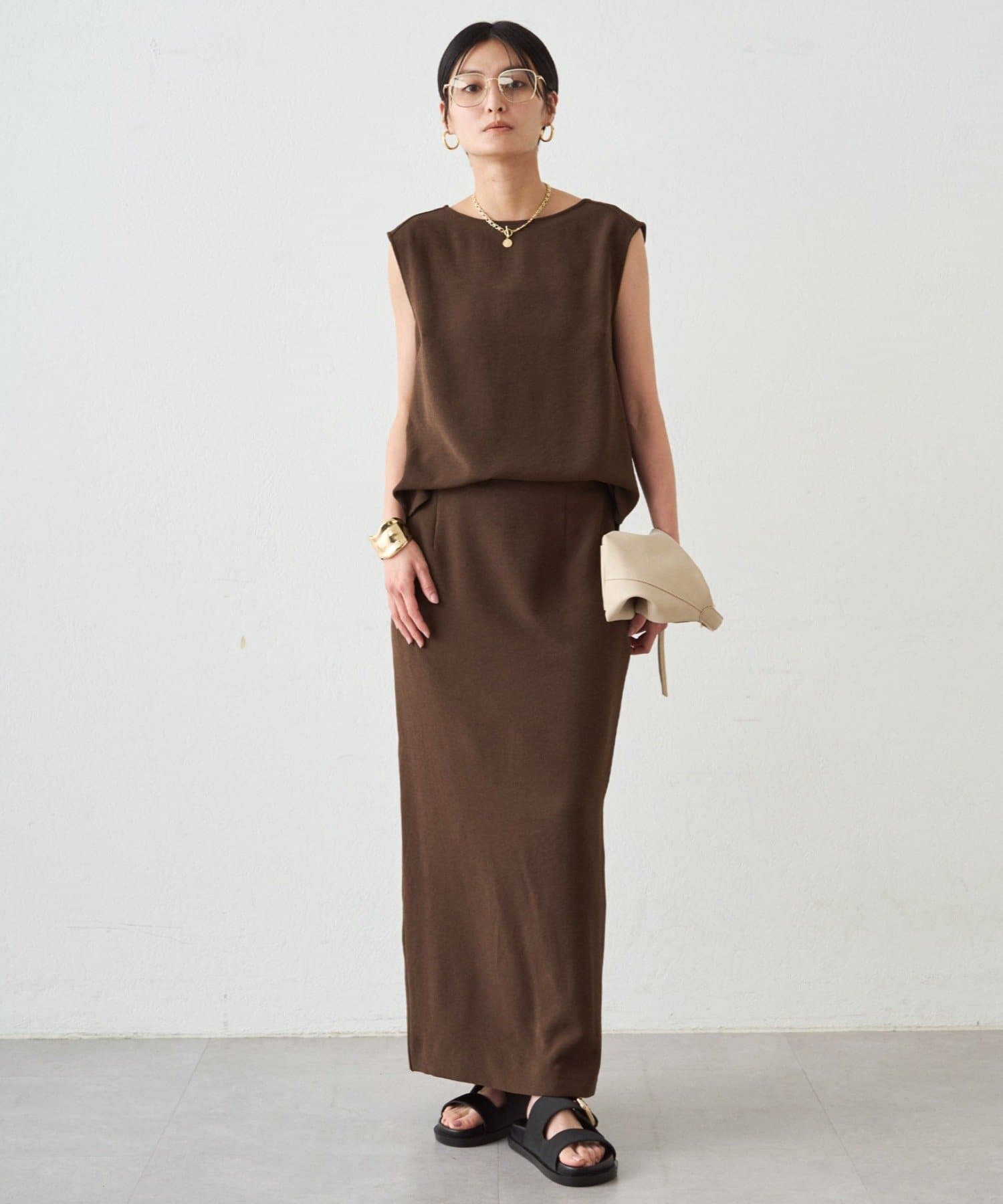 同シリーズのダブルジョーゼットノースリブラウスとセットアップでの着用もおすすめです。