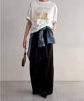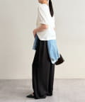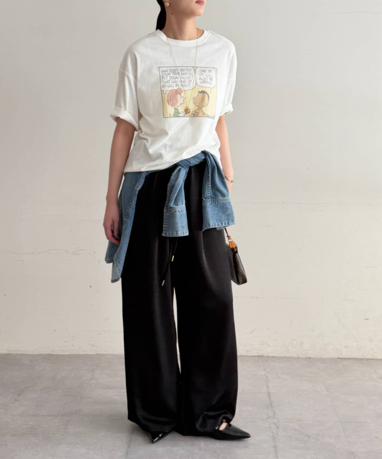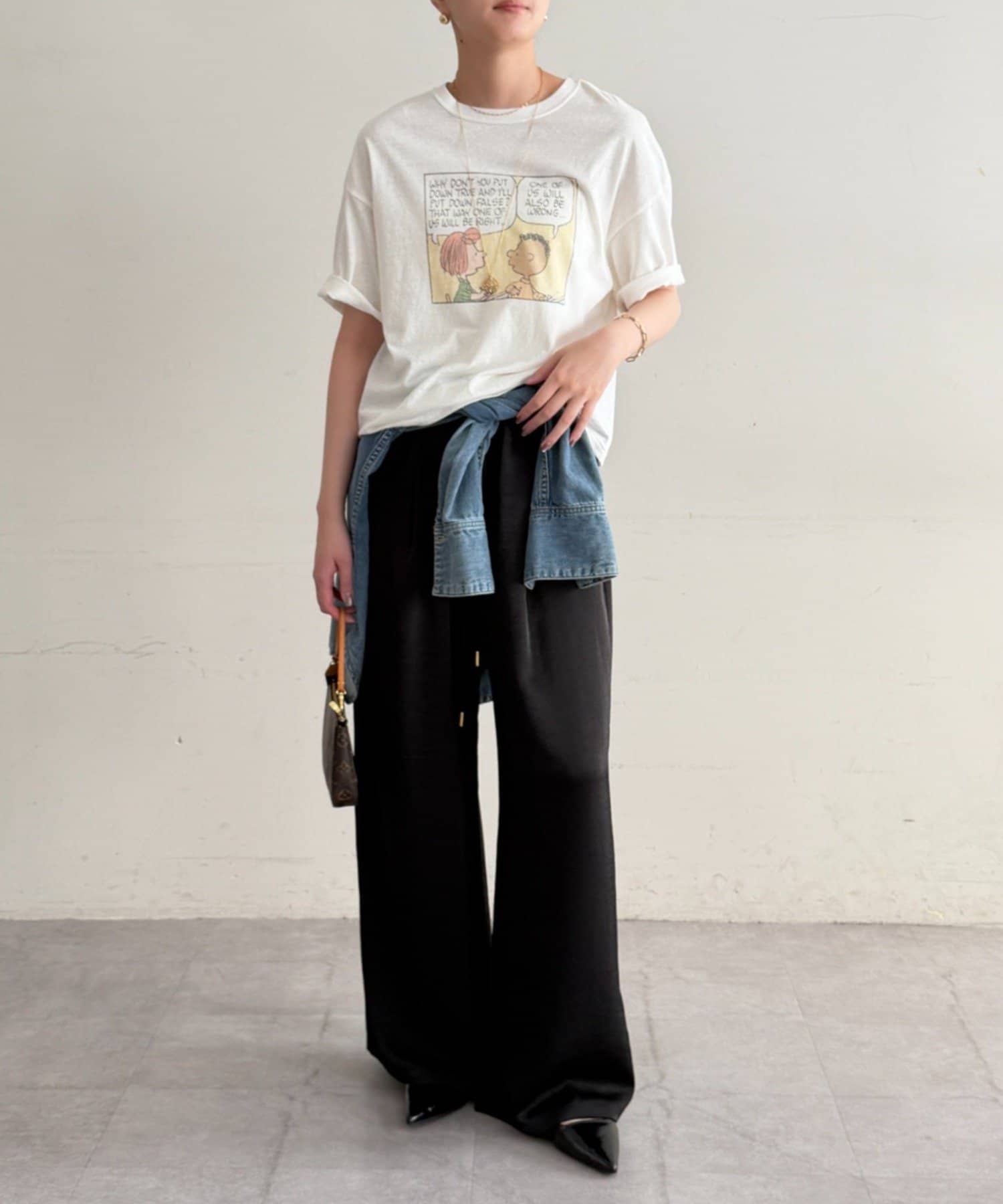 ウエストは紐で調整可能で、リラックス感とすっきり見えを両立。ワイドシルエットで体型カバーも叶う一着です。