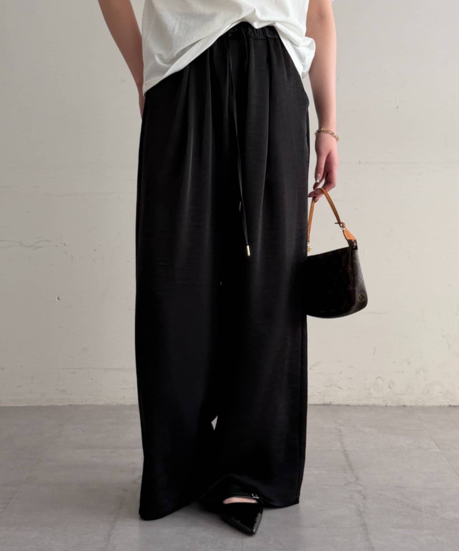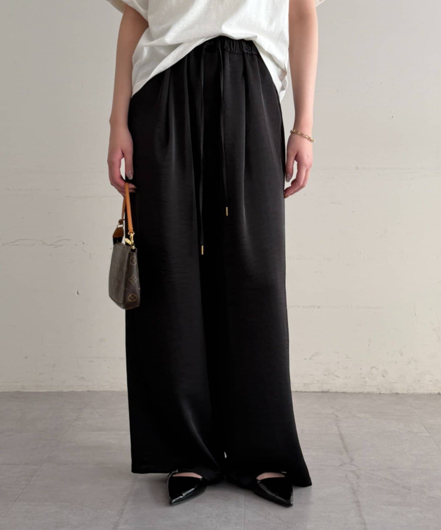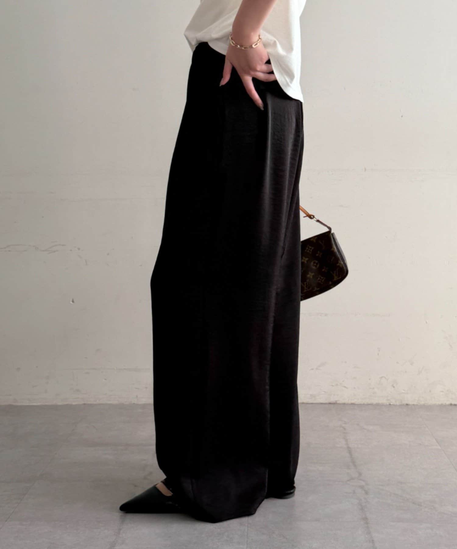 上品な光沢感をまとって、大人の余裕を演出するサテンワイドイージーパンツ。
