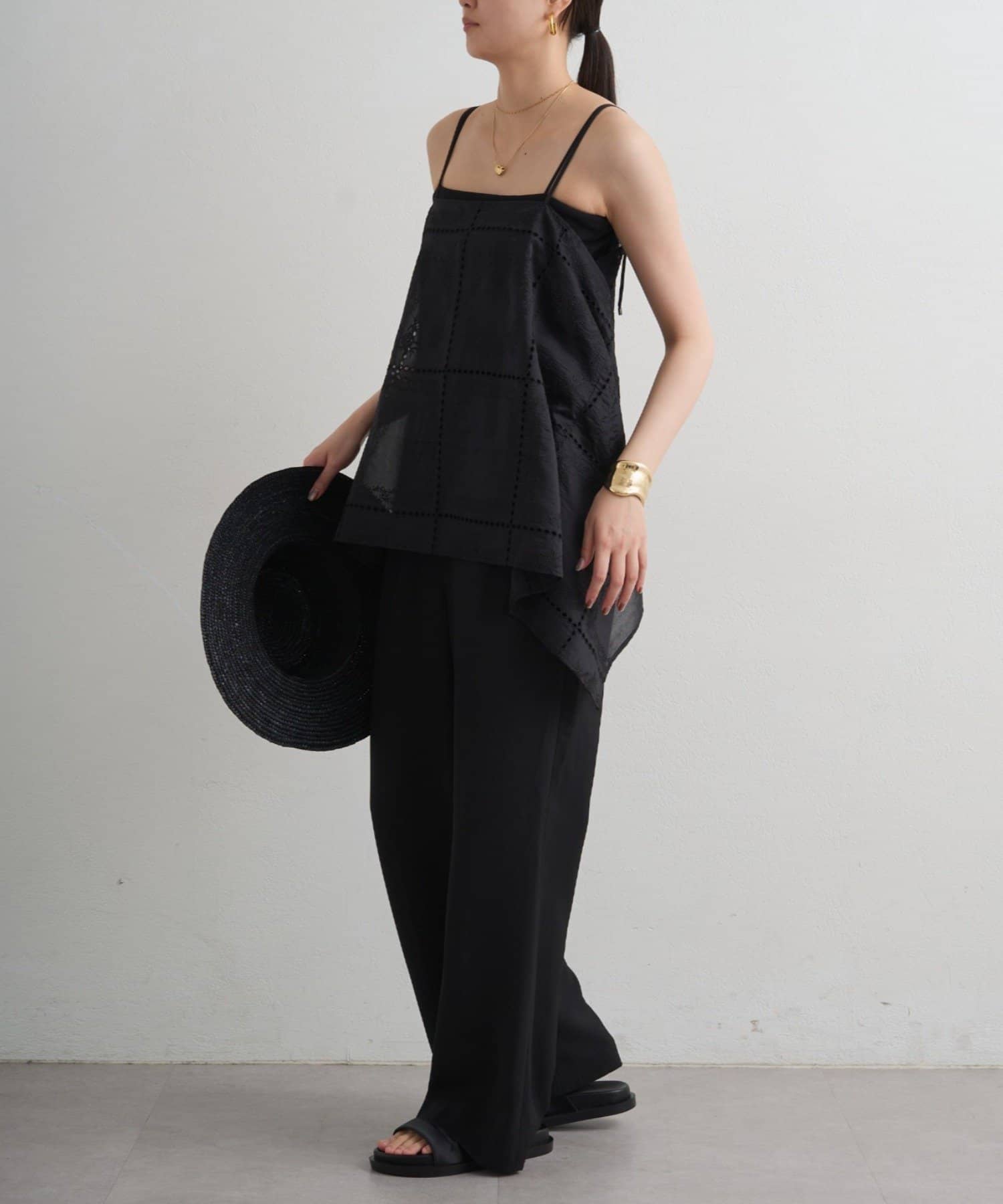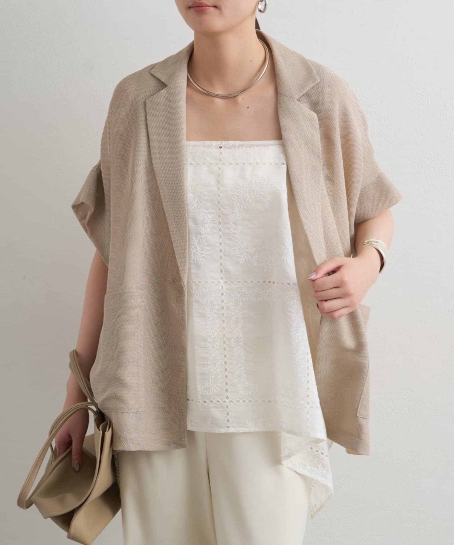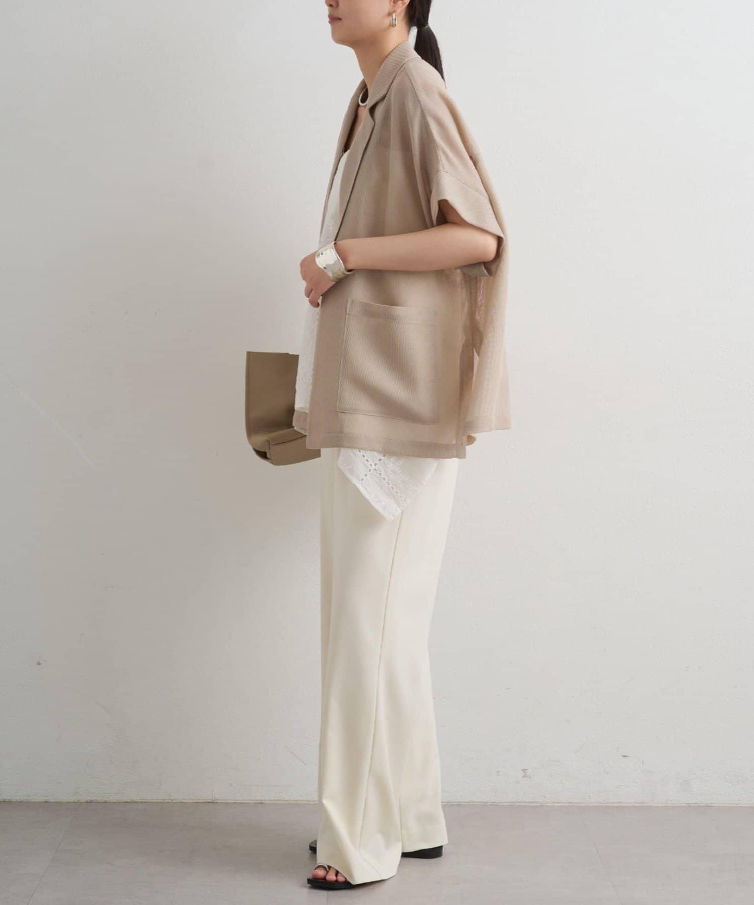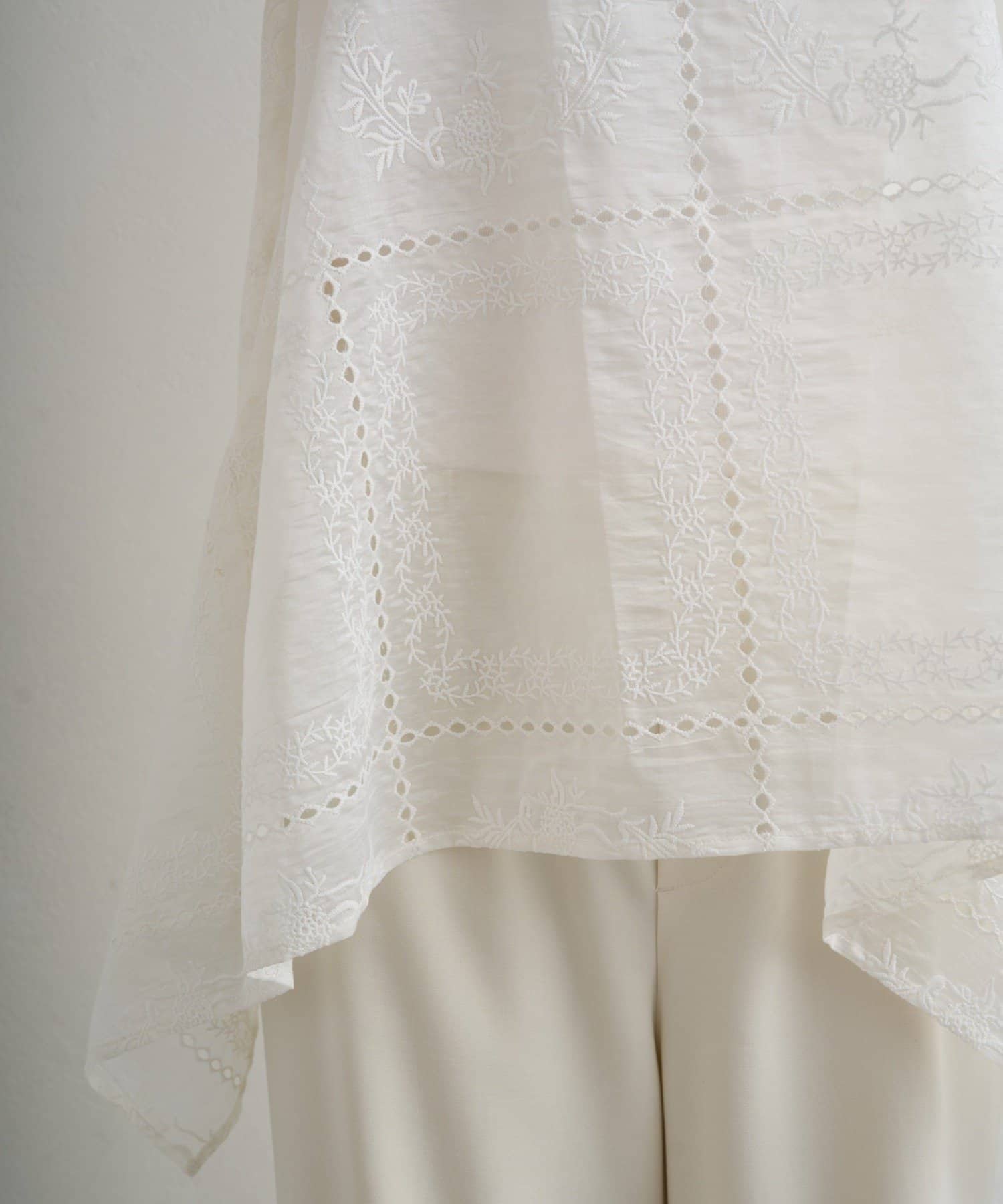 目を惹くパネルレース刺繍が繊細で上品な印象を演出し、シアーな素材感が涼しげで軽やかな抜け感をプラス。