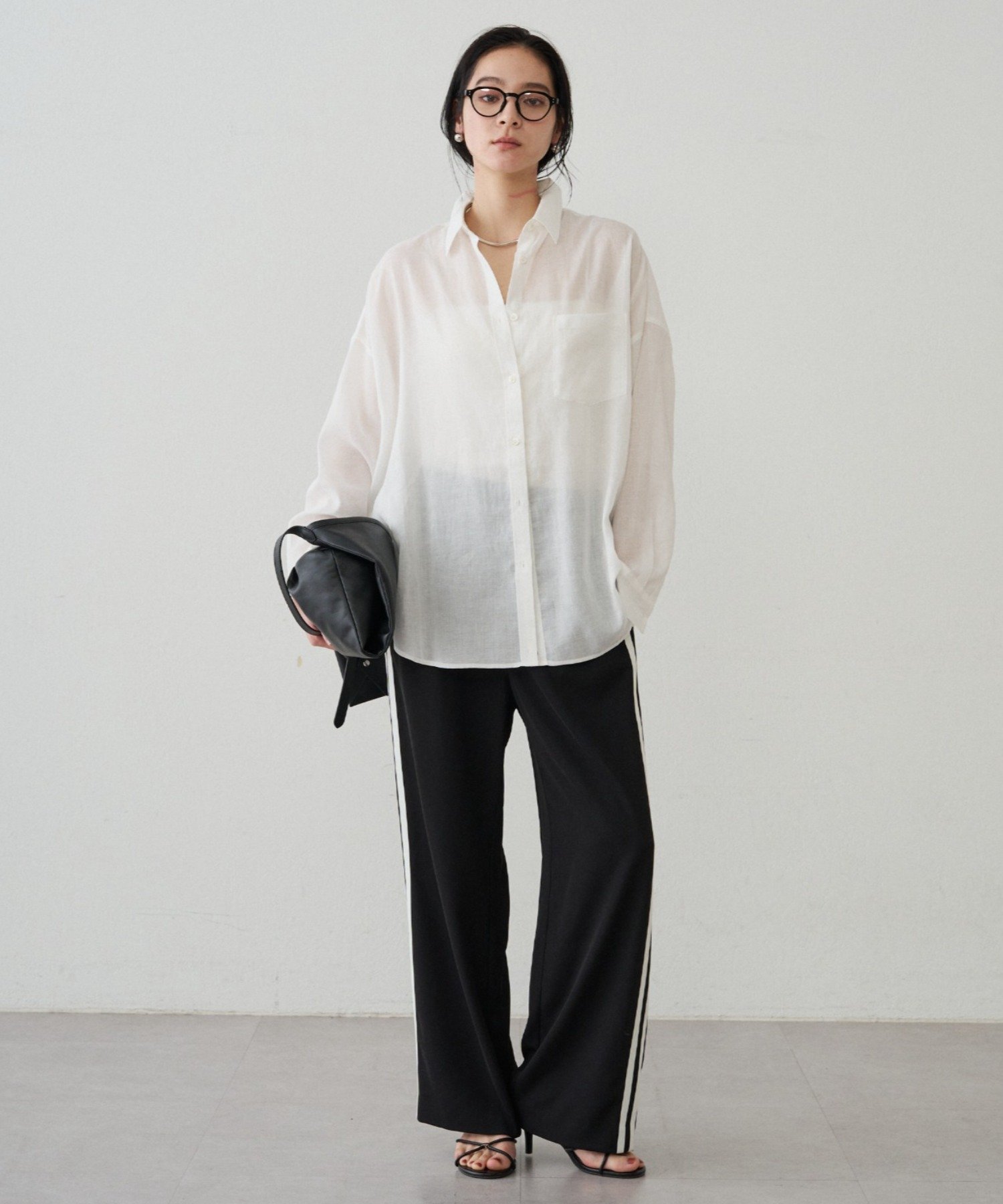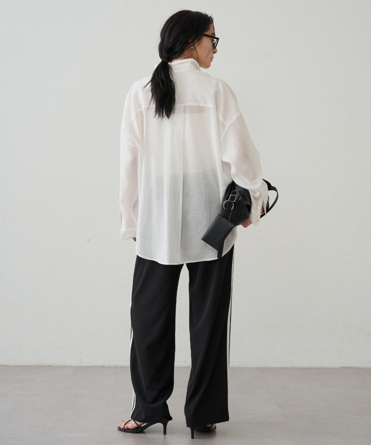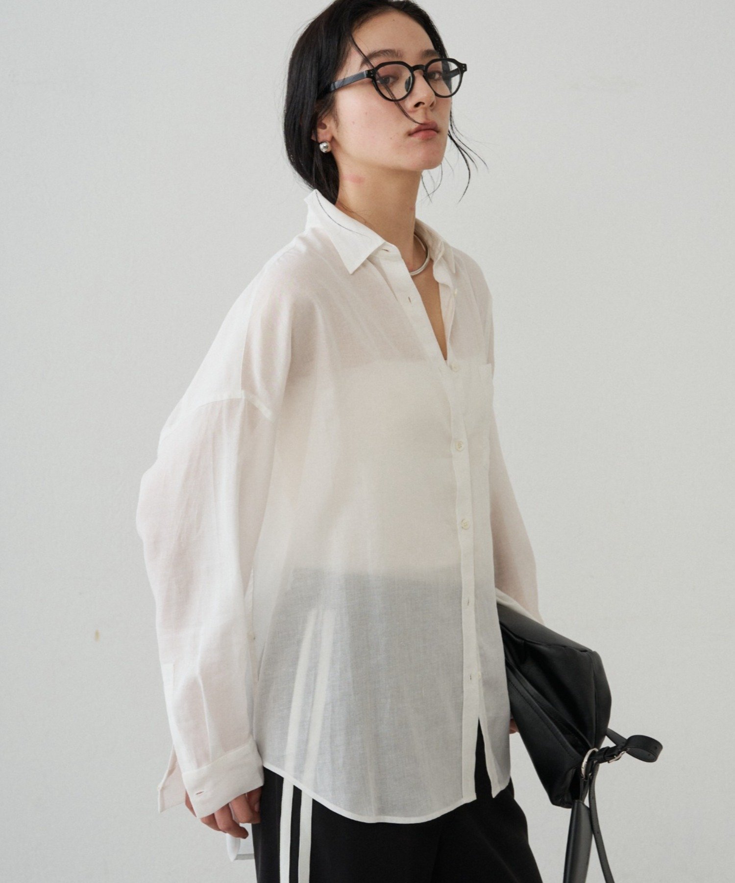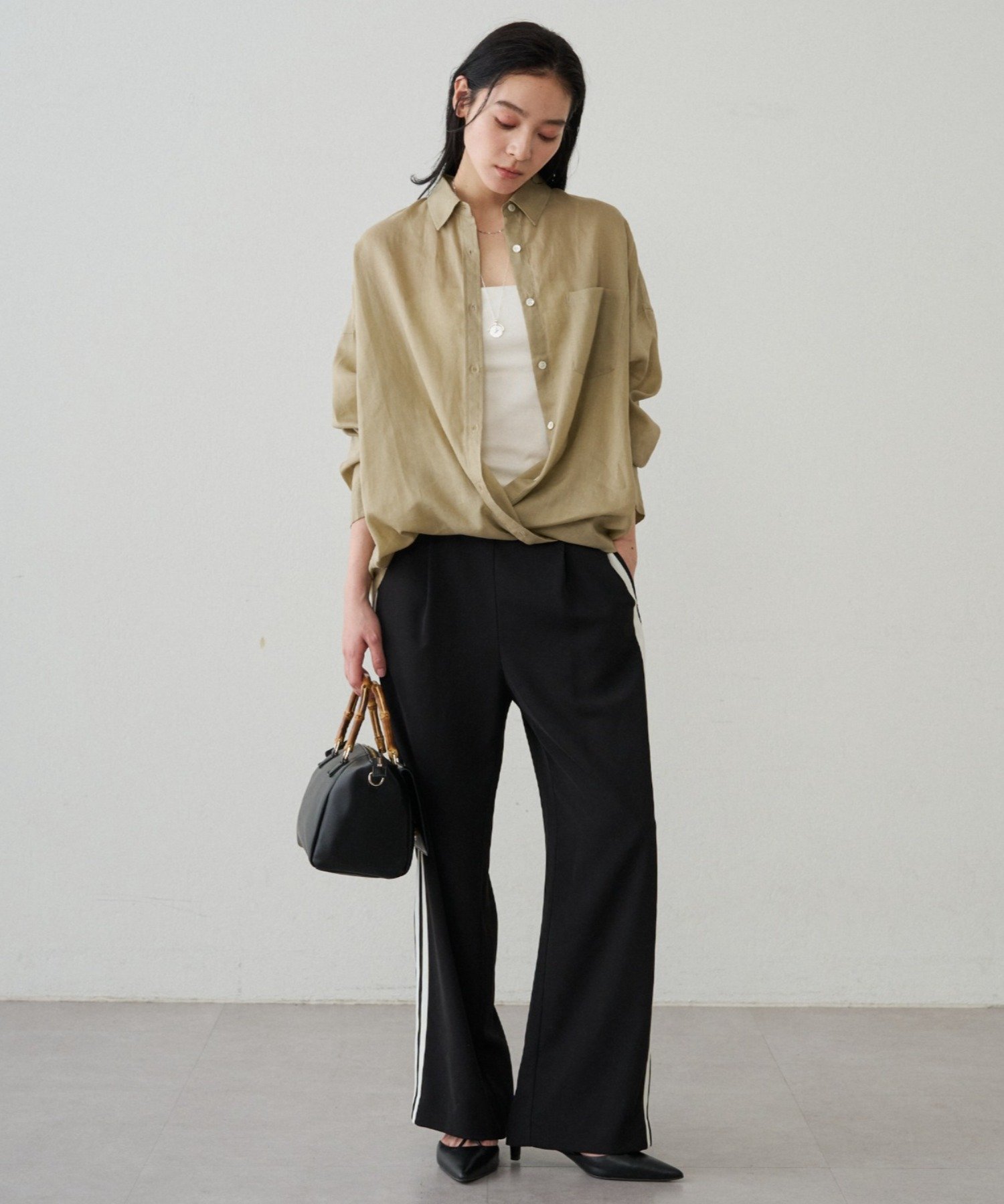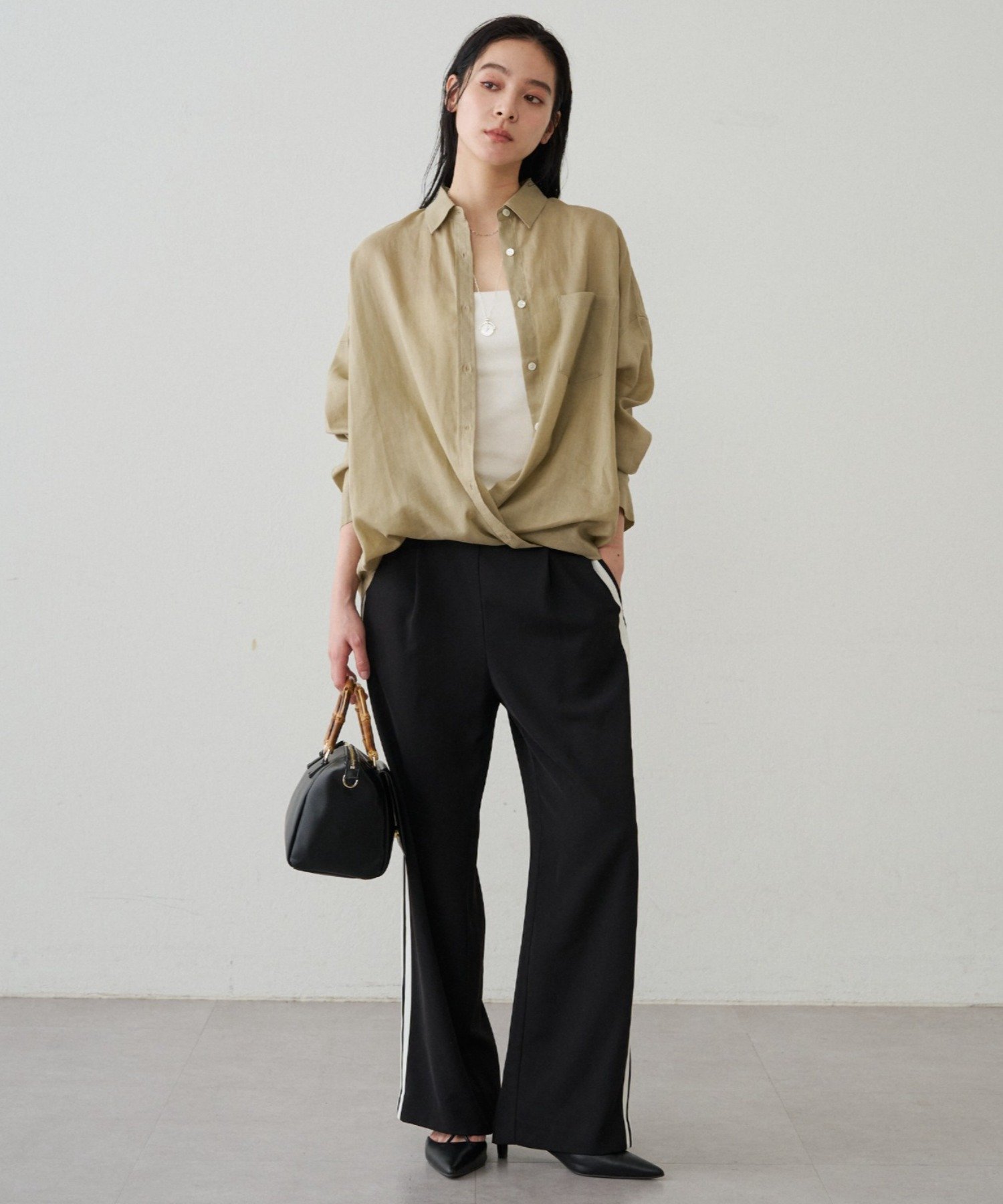 ボタンを留めてベーシックなシャツとして着るのはもちろん、ボタンを外してカシュクール風にアレンジすれば、ぐっと女性らしい印象に。