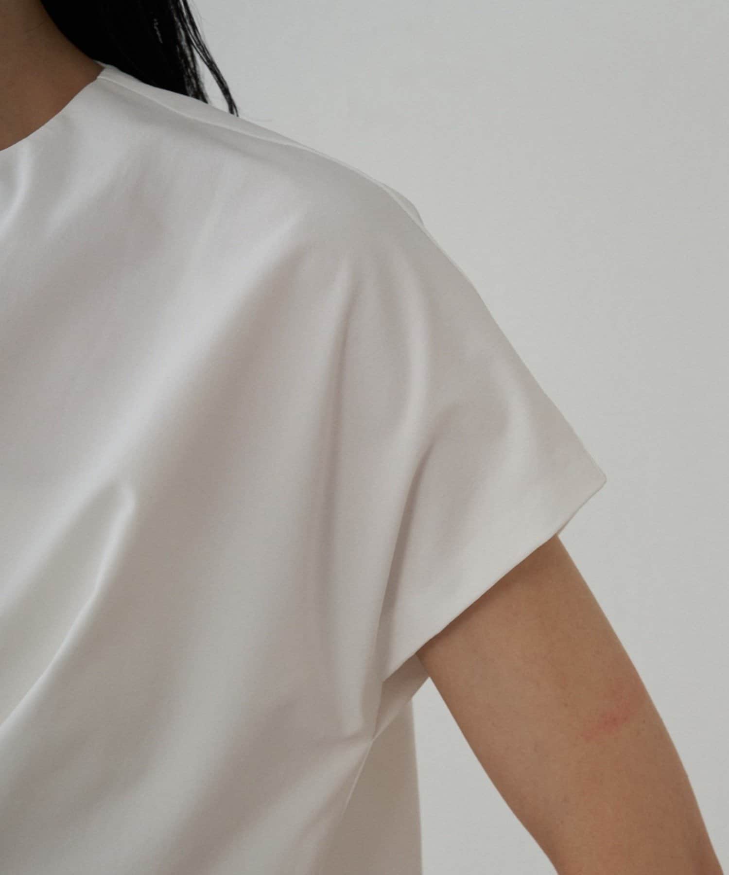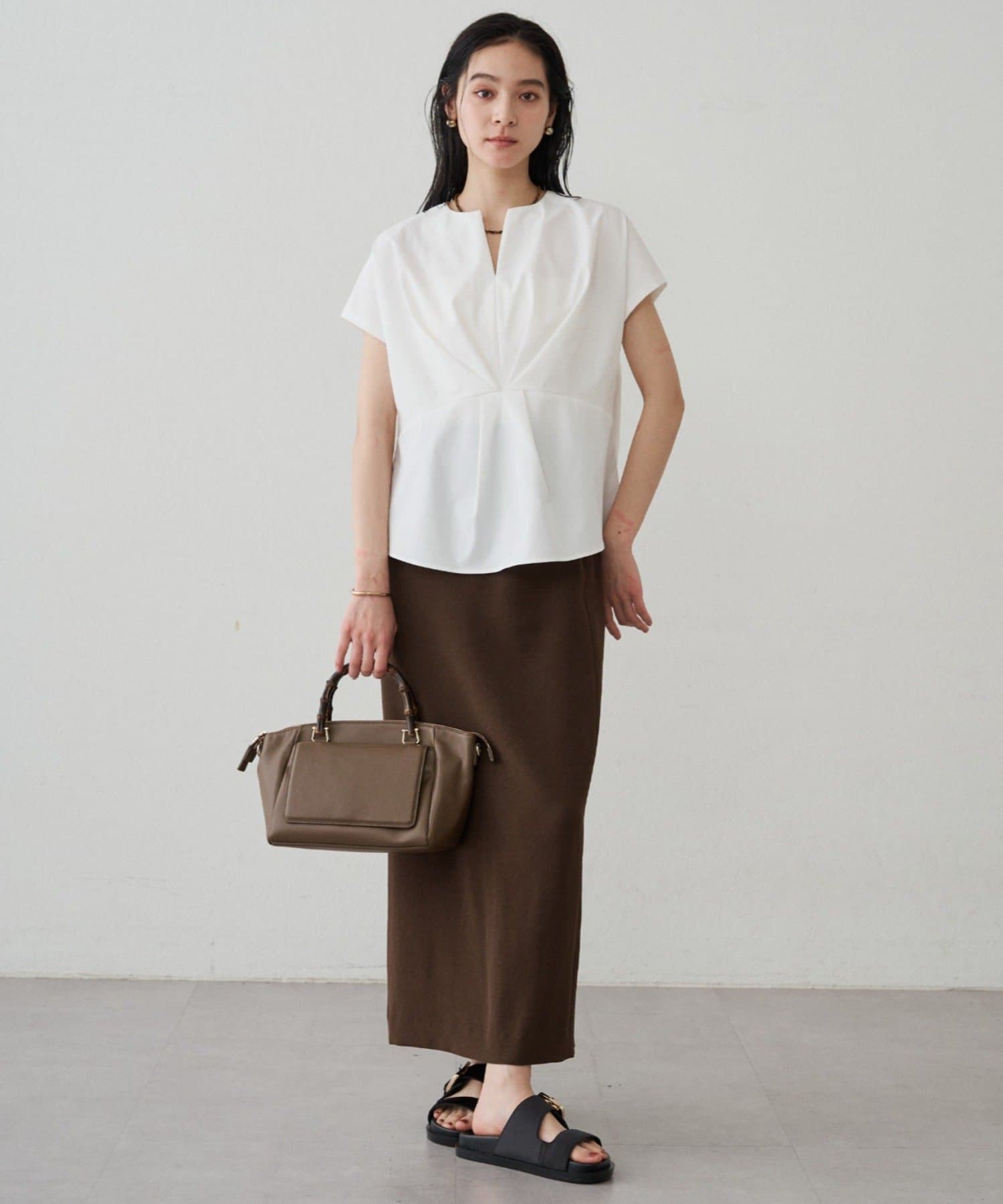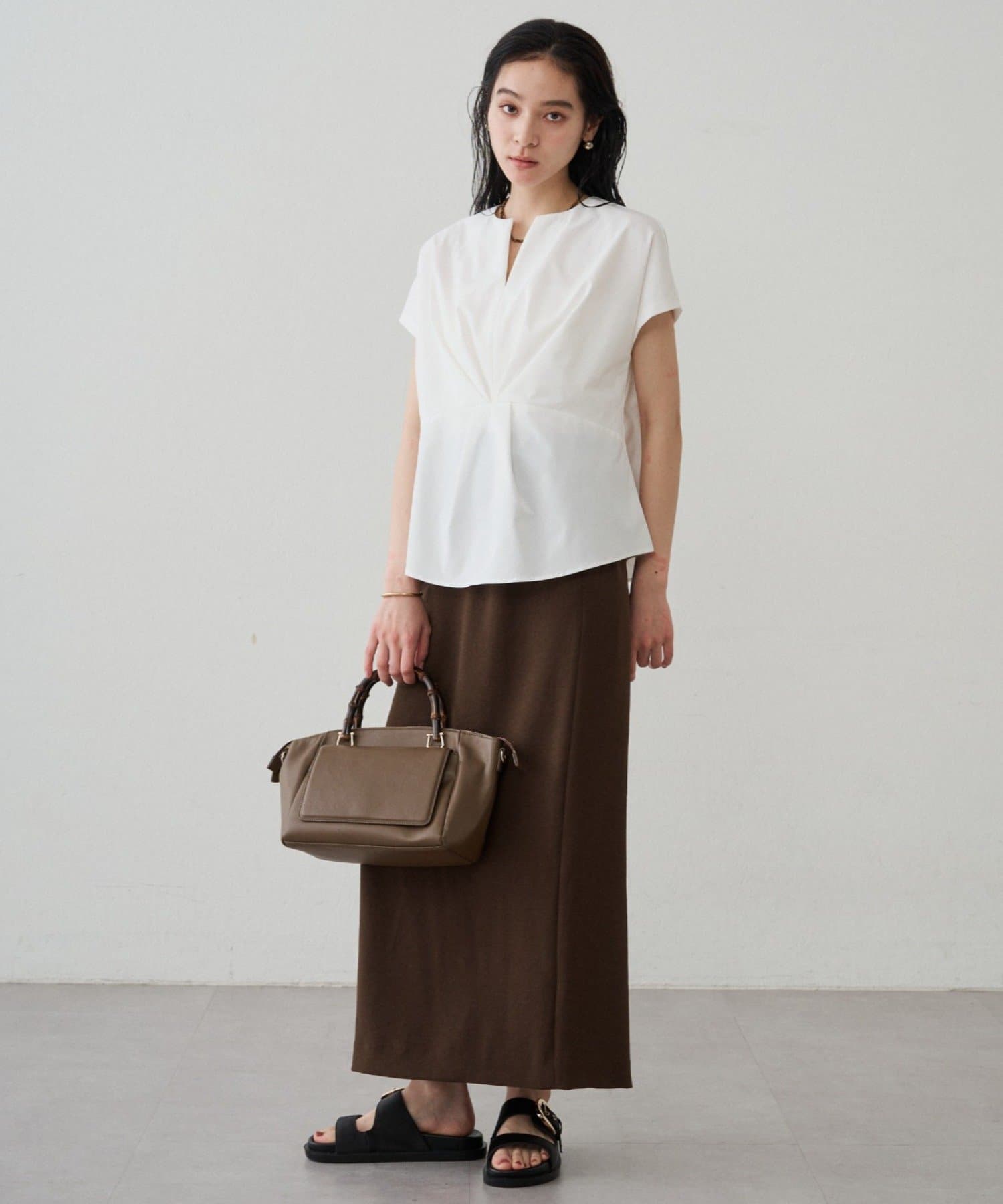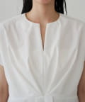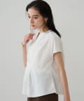 Vスリットネックで上品な抜け感と、ウエスト位置で切り替えたペプラムシルエットがスタイルアップ効果も。