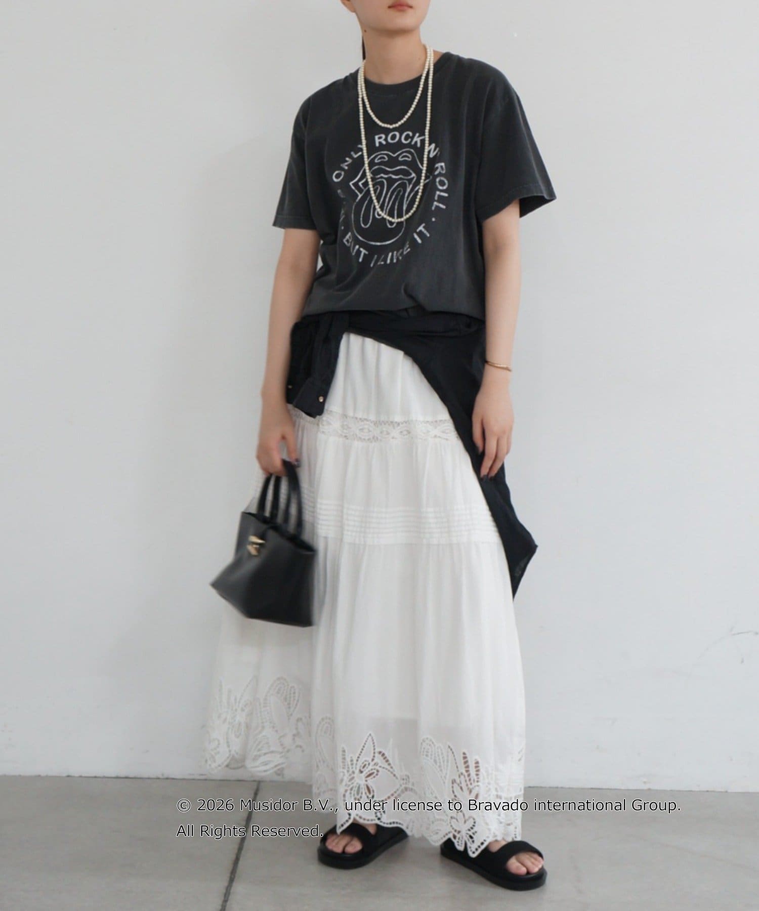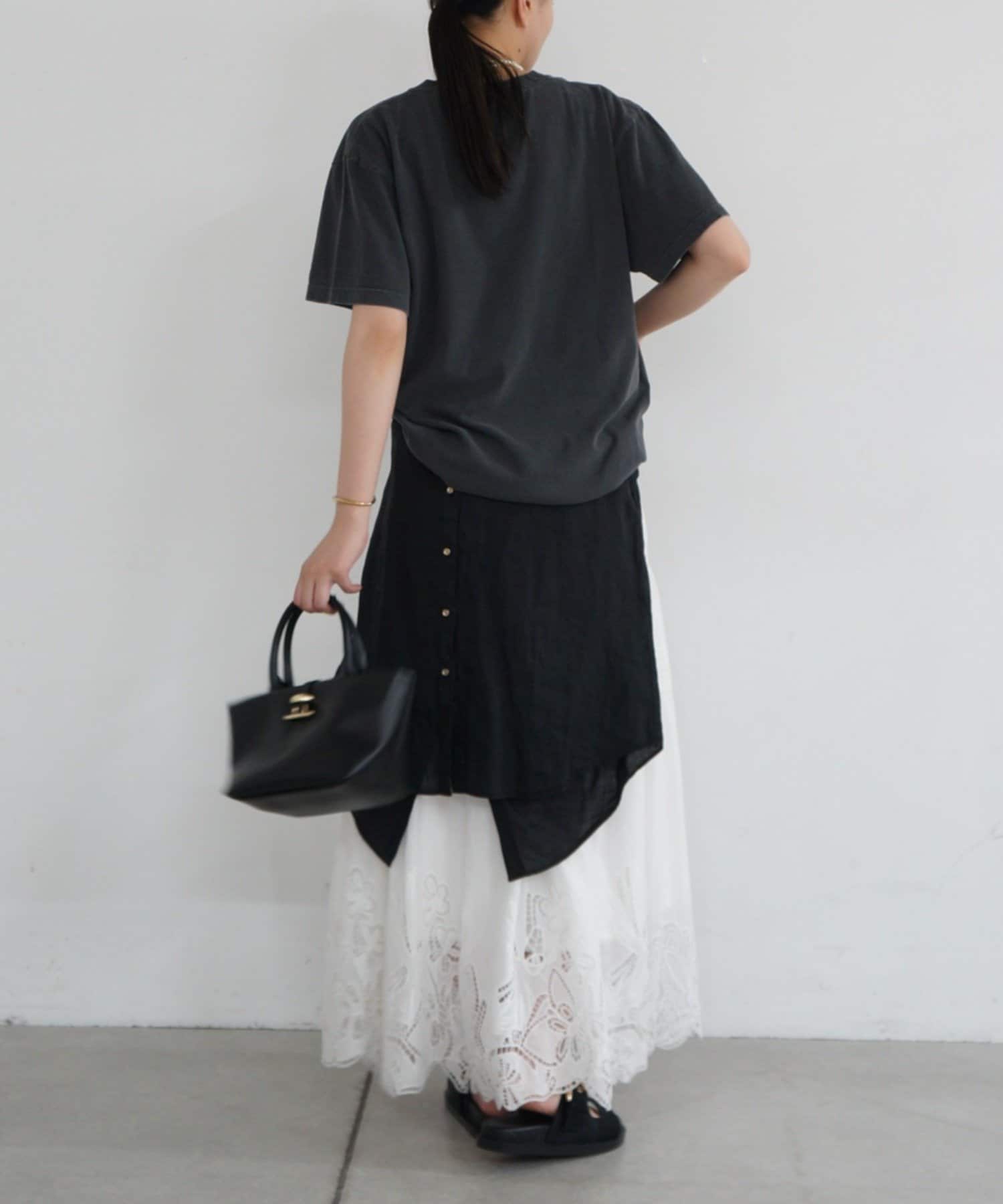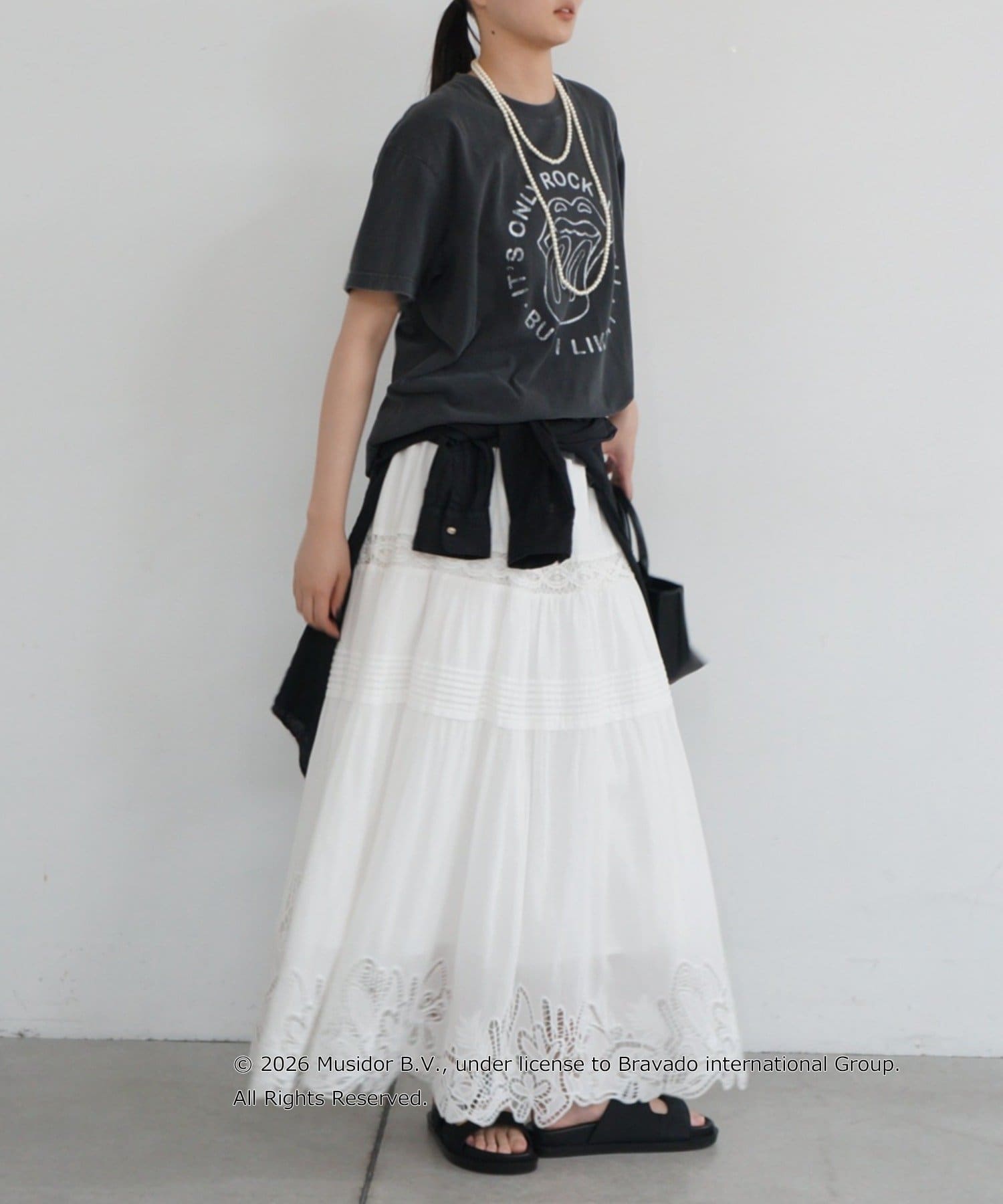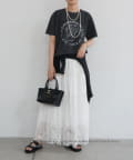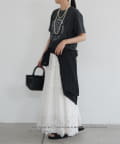 あえてフェミニンなスカートやアクセサリーと合わせることで、甘辛ミックスの洗練されたスタイルが完成。