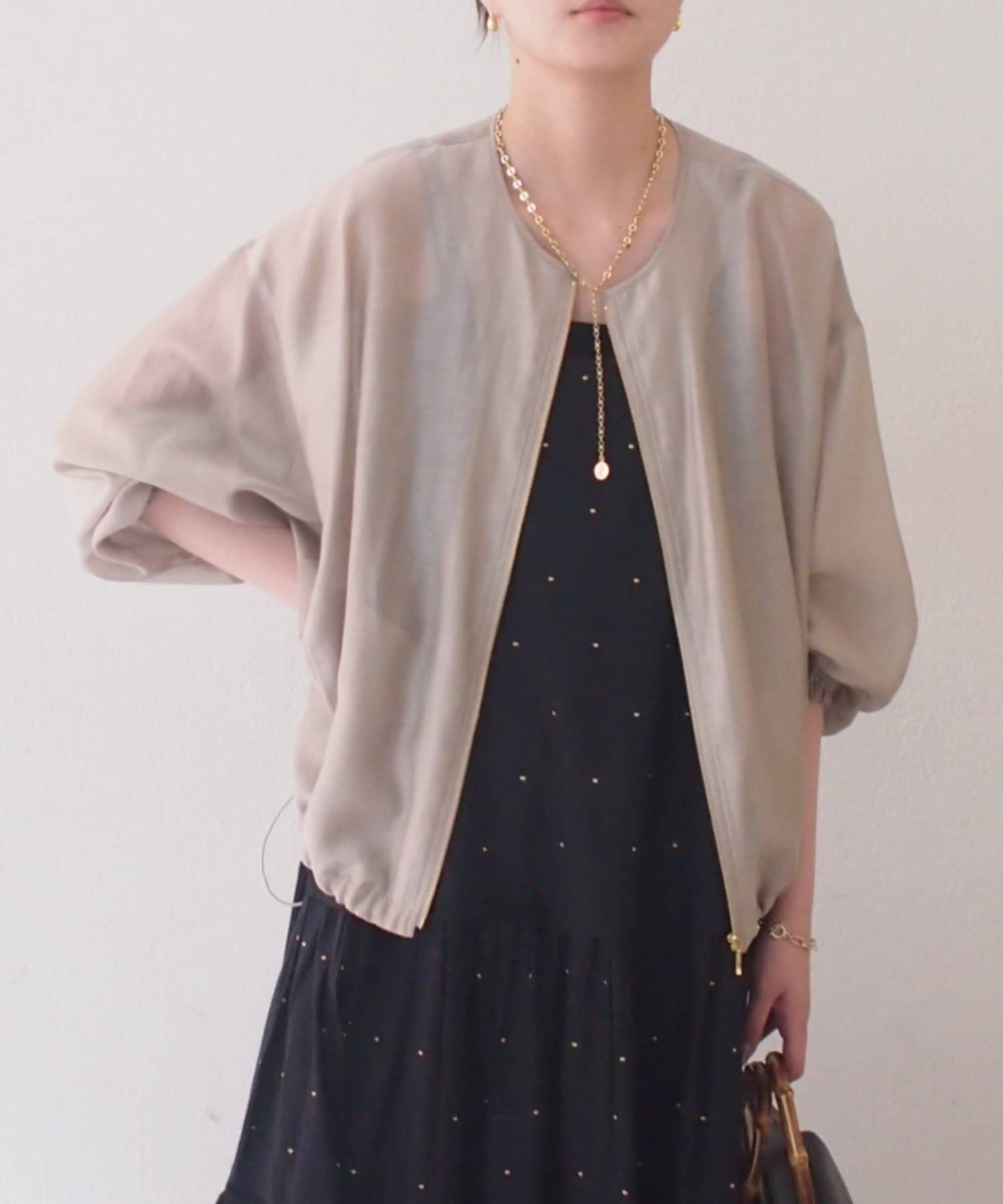 ほんのりツヤ感のある上品なシアー素材を使用した、大人の女性にぴったりのブルゾン。