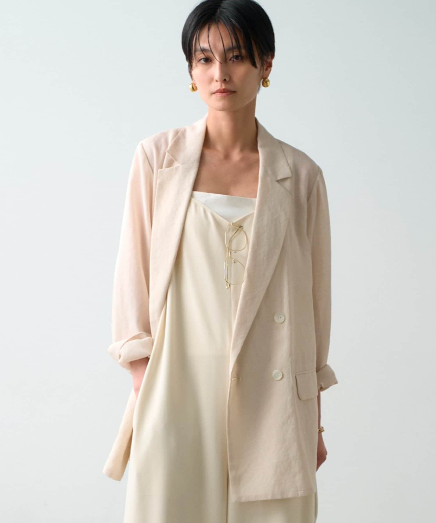ダブルブレストの上品なデザインと、顔周りをすっきり見せるテーラードカラーで、羽織るだけで洗練された印象に。