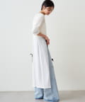 スリットから覗くボトムスが、コーディネートに奥行きを与えます。