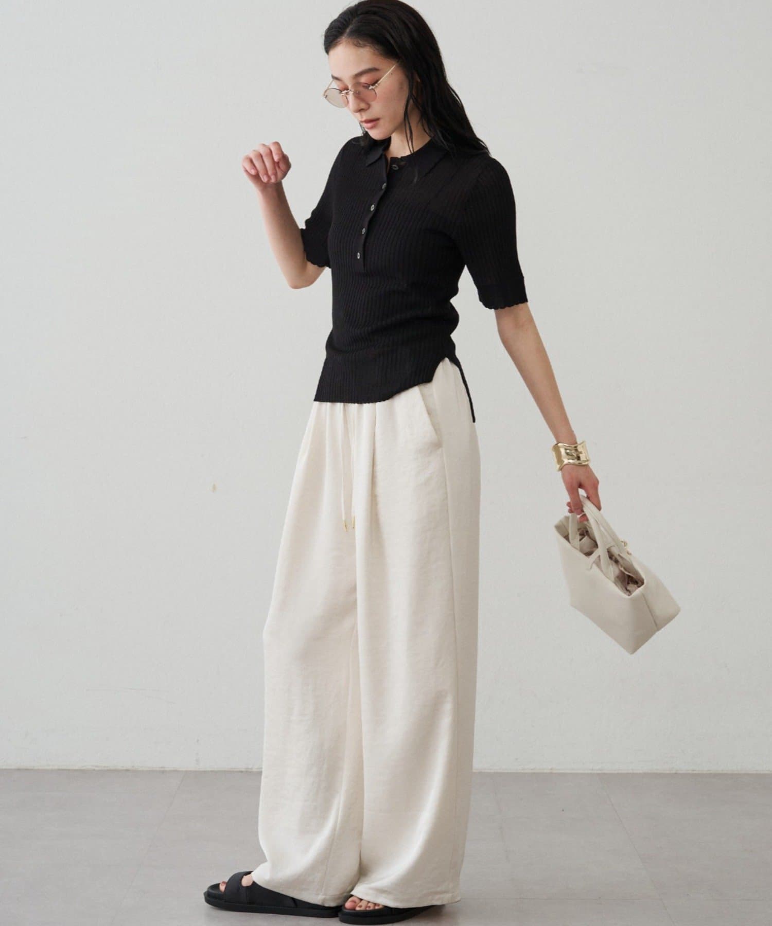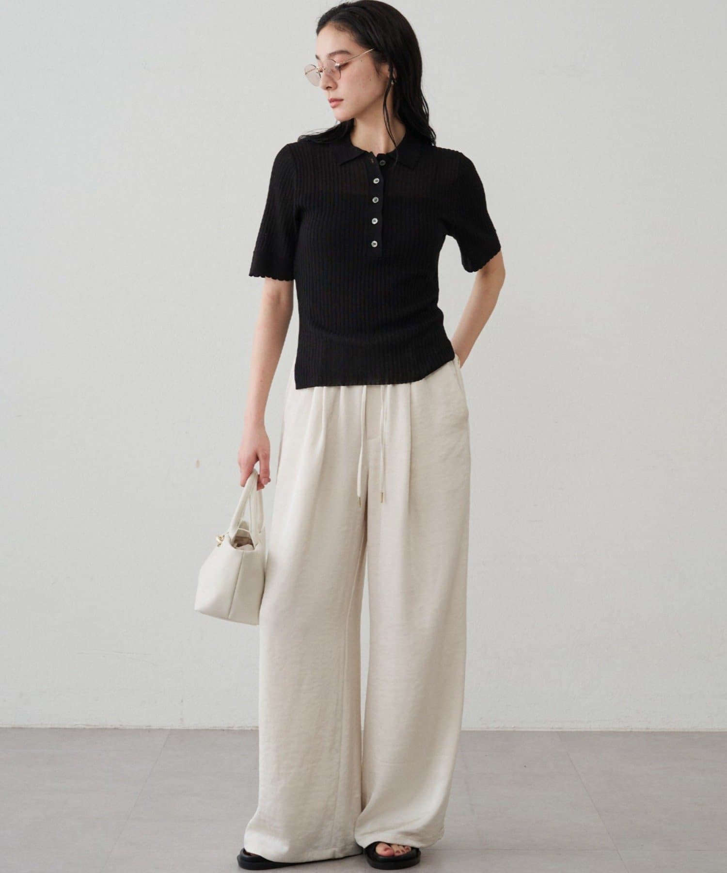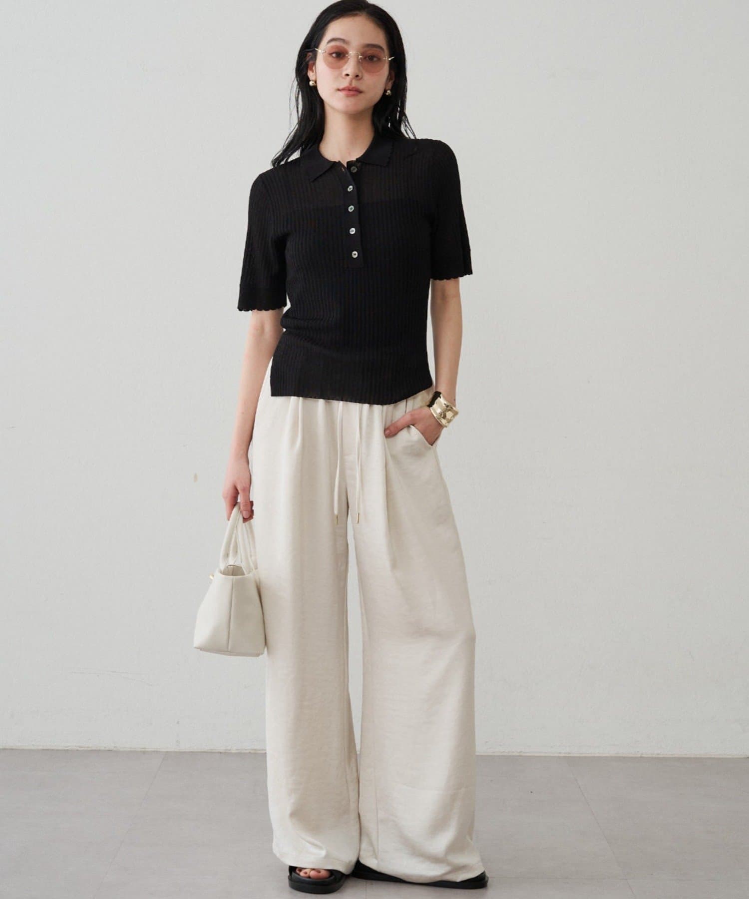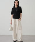 オフィスシーンでは、ベージュやホワイトのパンツやスカートと合わせて、きちんと感のあるスタイルに。