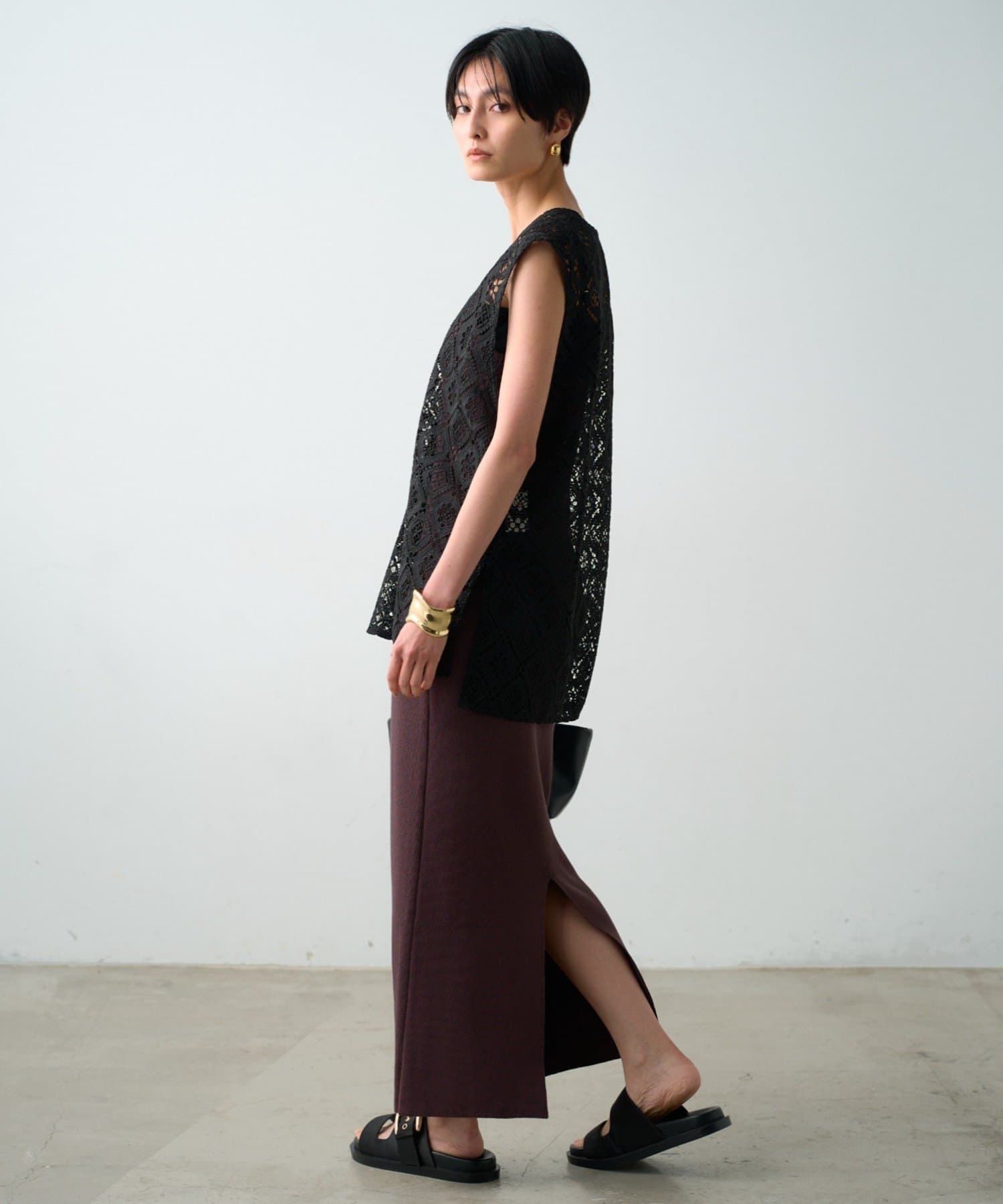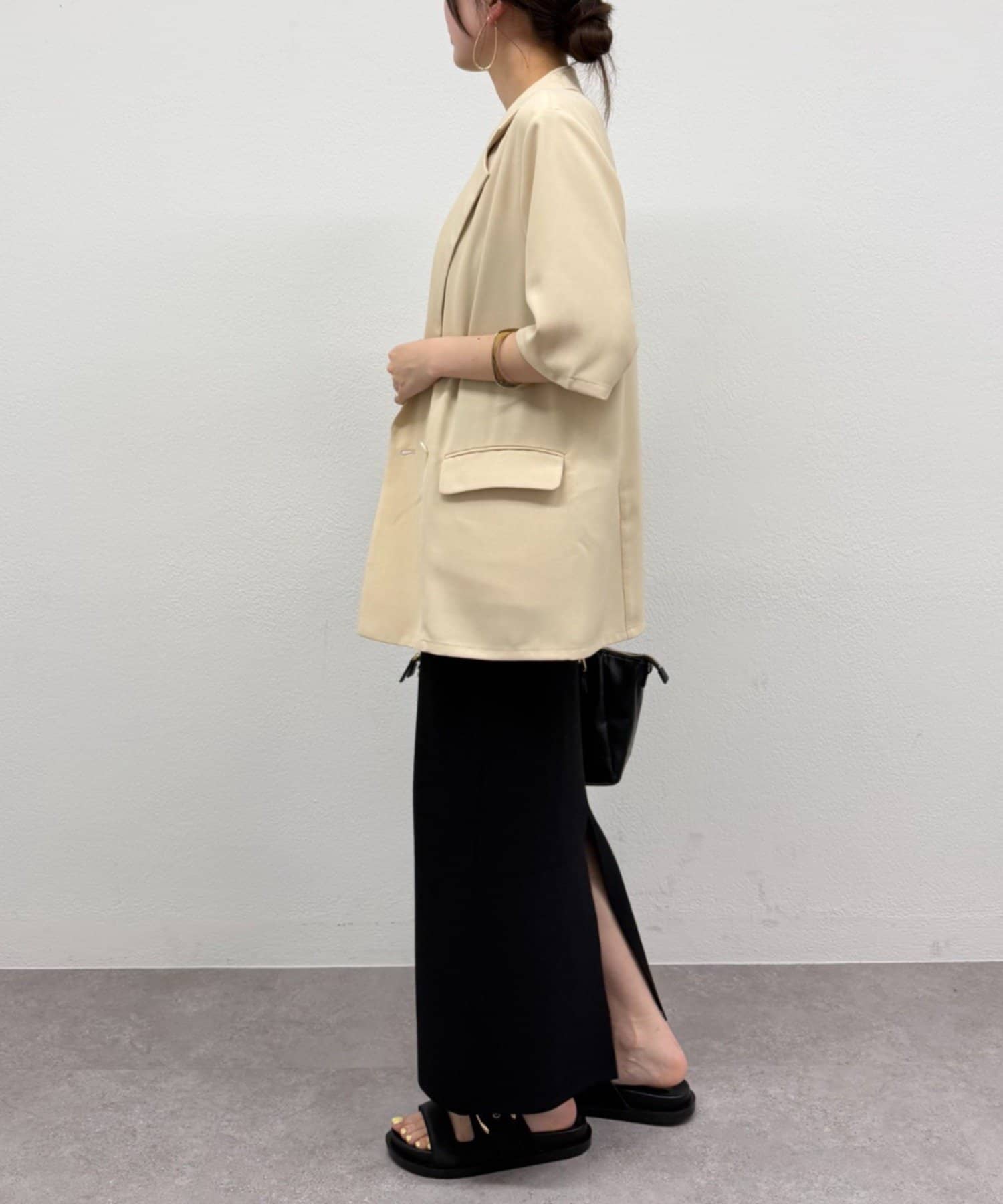 大人っぽく落ち着いた印象で着こなせるロング丈。足元にスリットが入っていることで、抜け感をプラスし、動きやすさも実現しました。