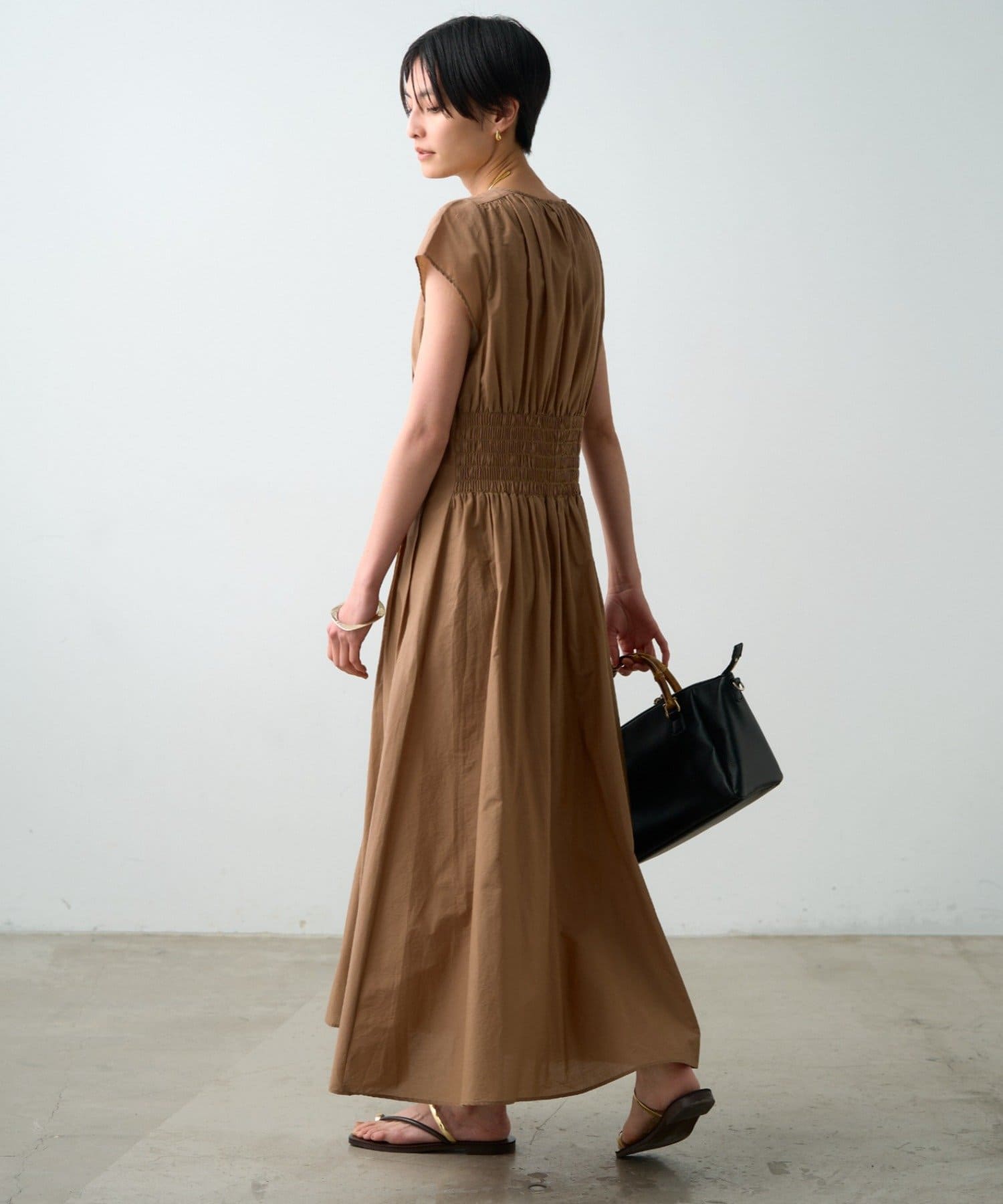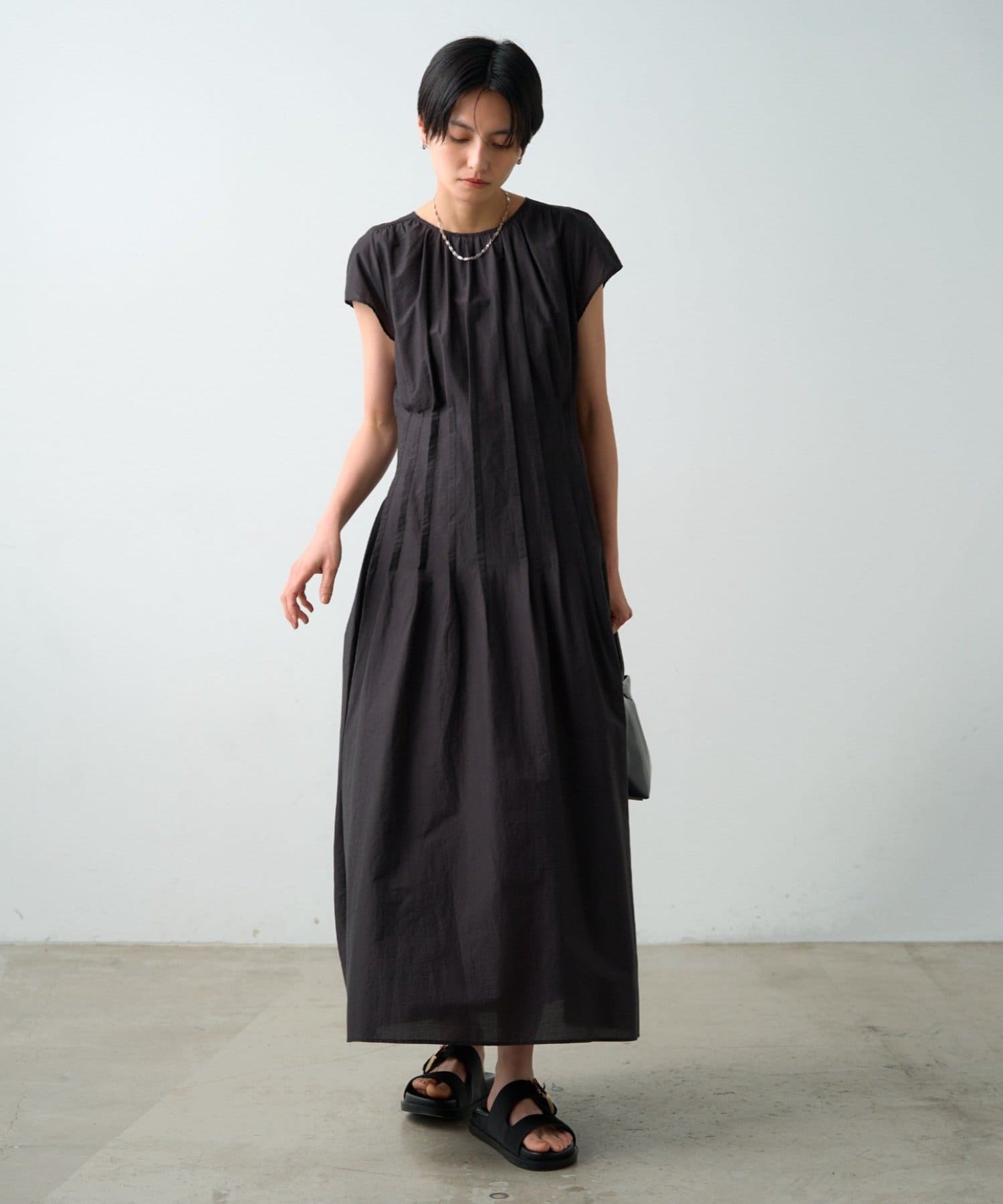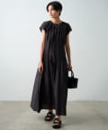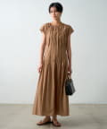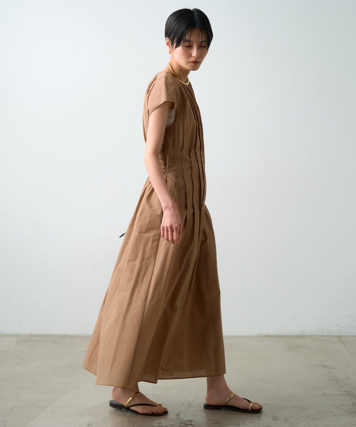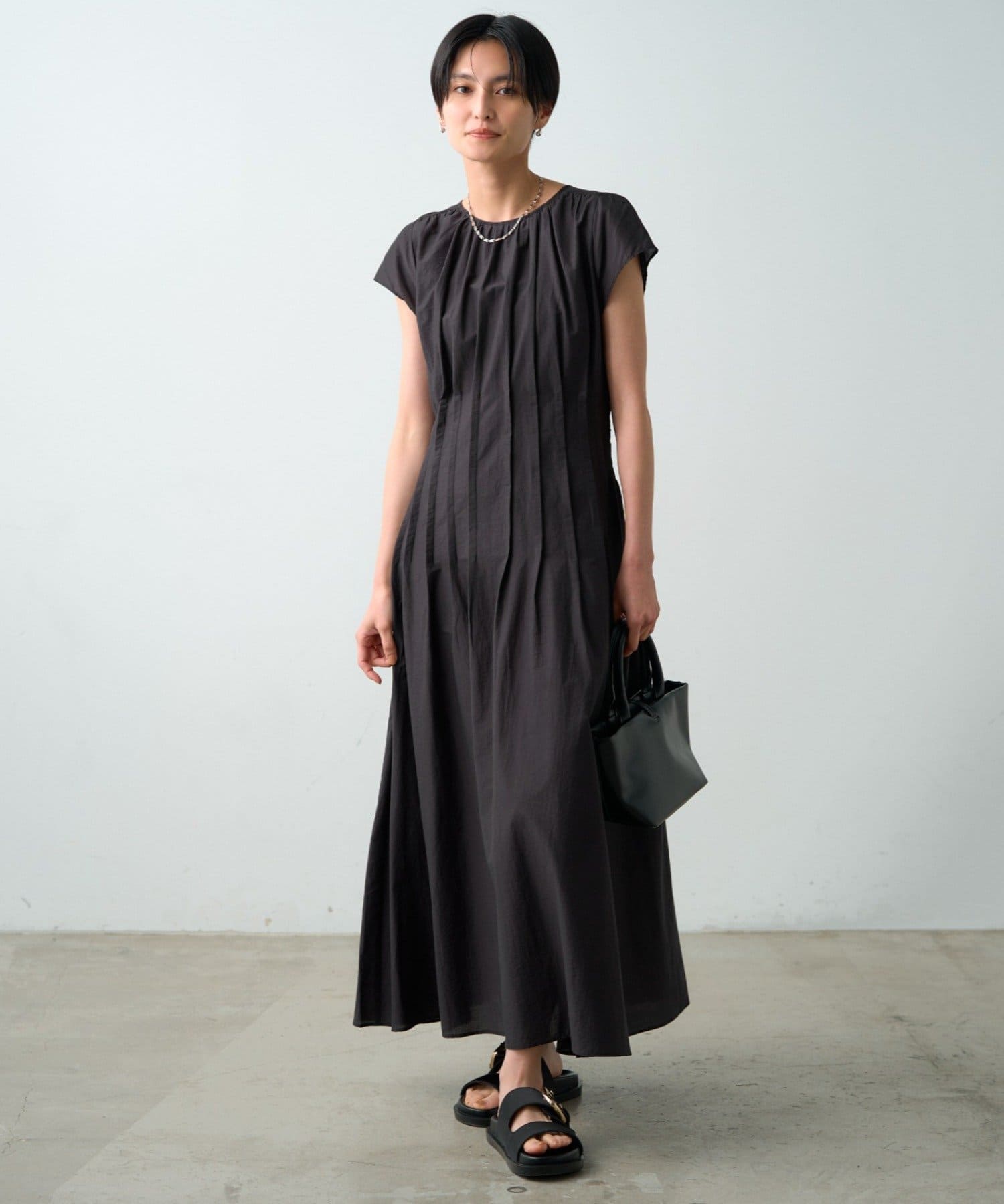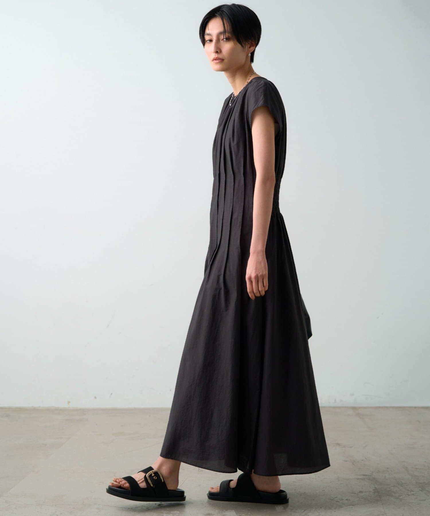 ストンと落ちるシルエットと裾に広がるフレアが、大人の女性らしさを引き立てるタックフレアワンピース。