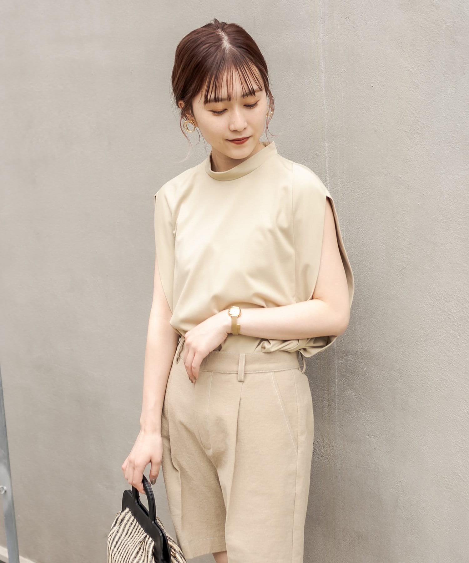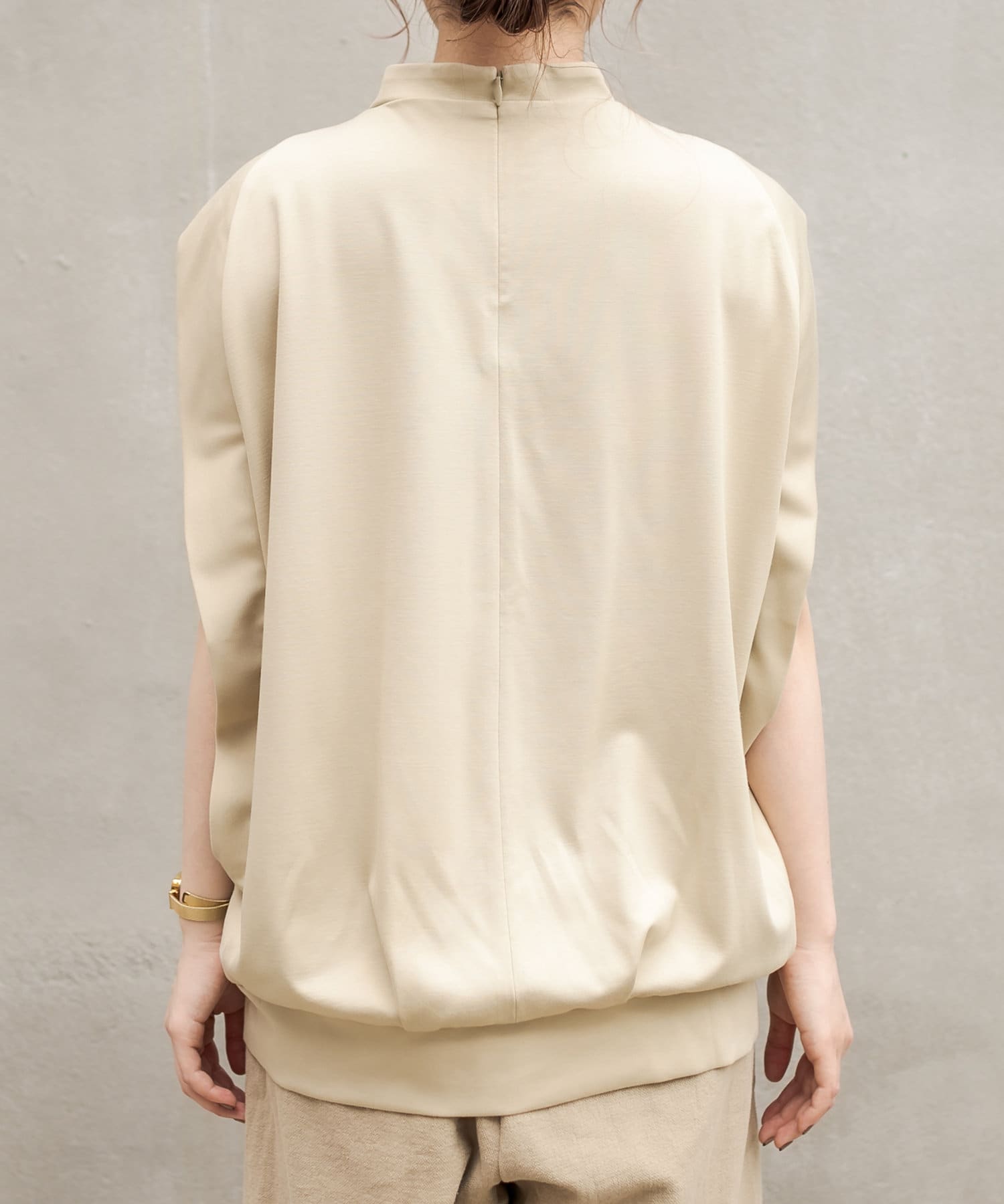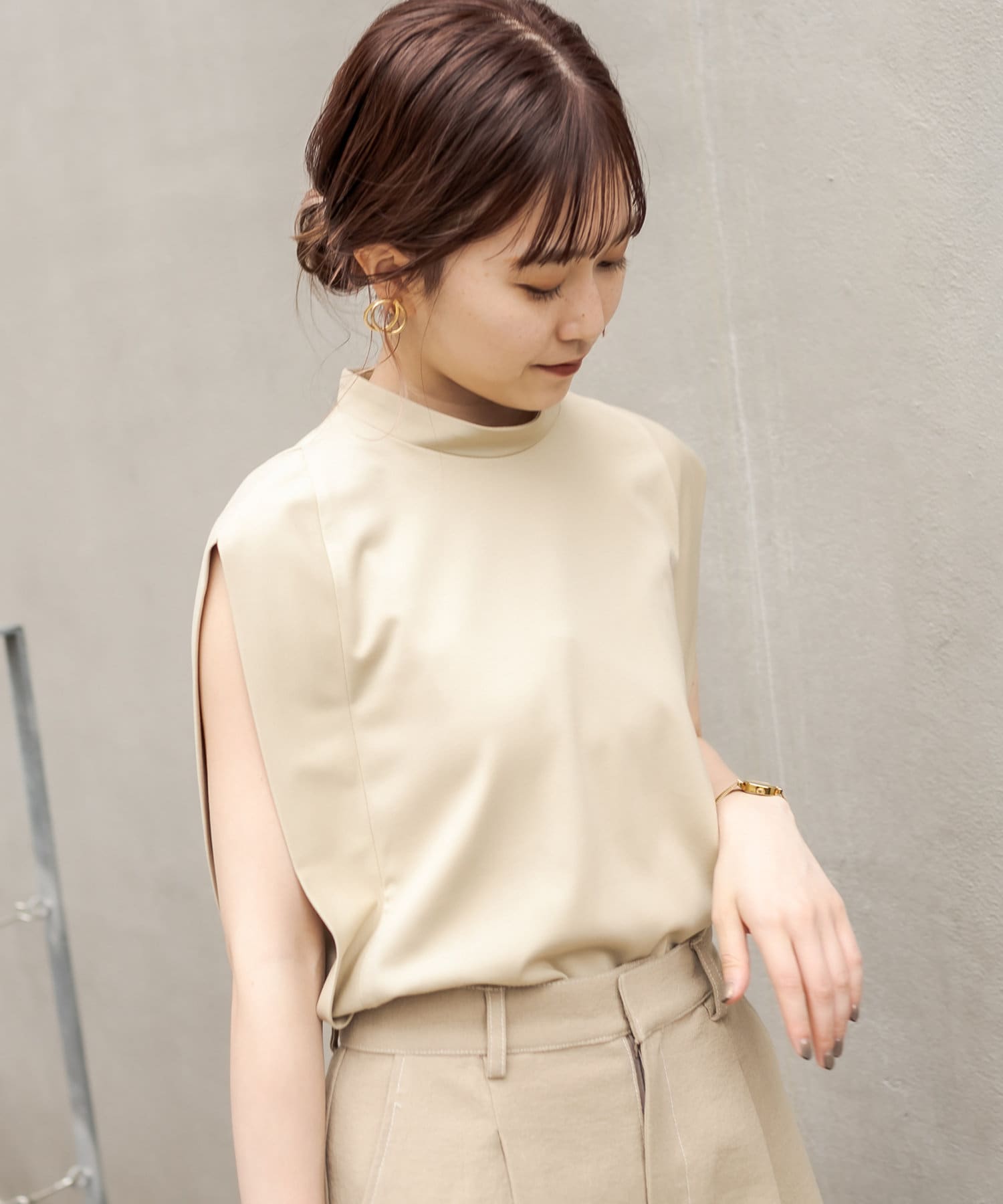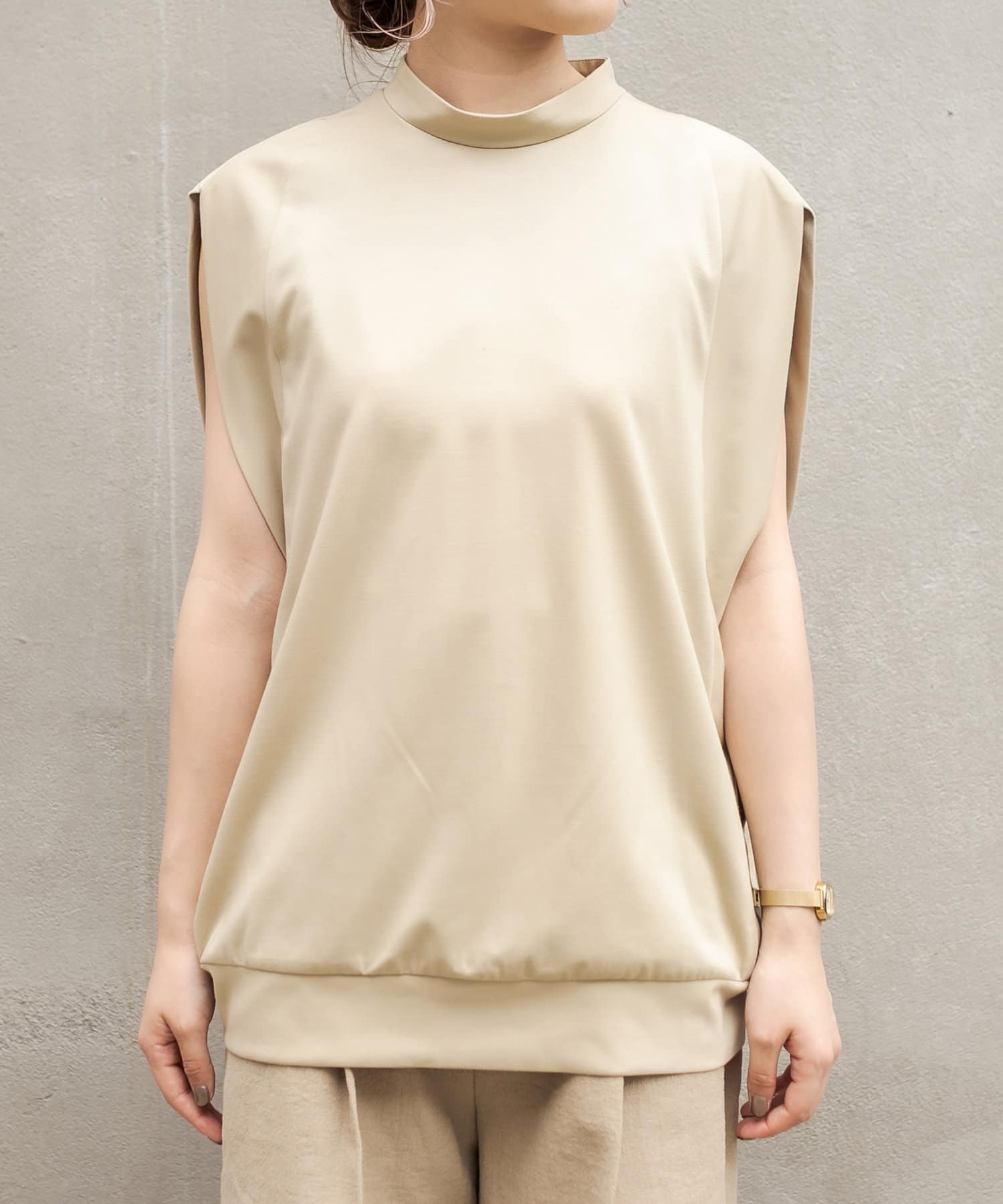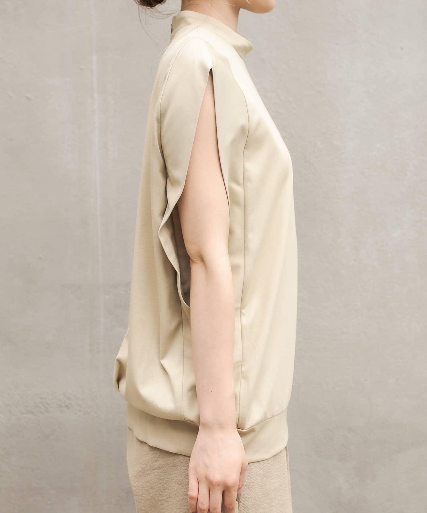 シルクのような手触りの上品な生地感のノースリーブTシャツ。