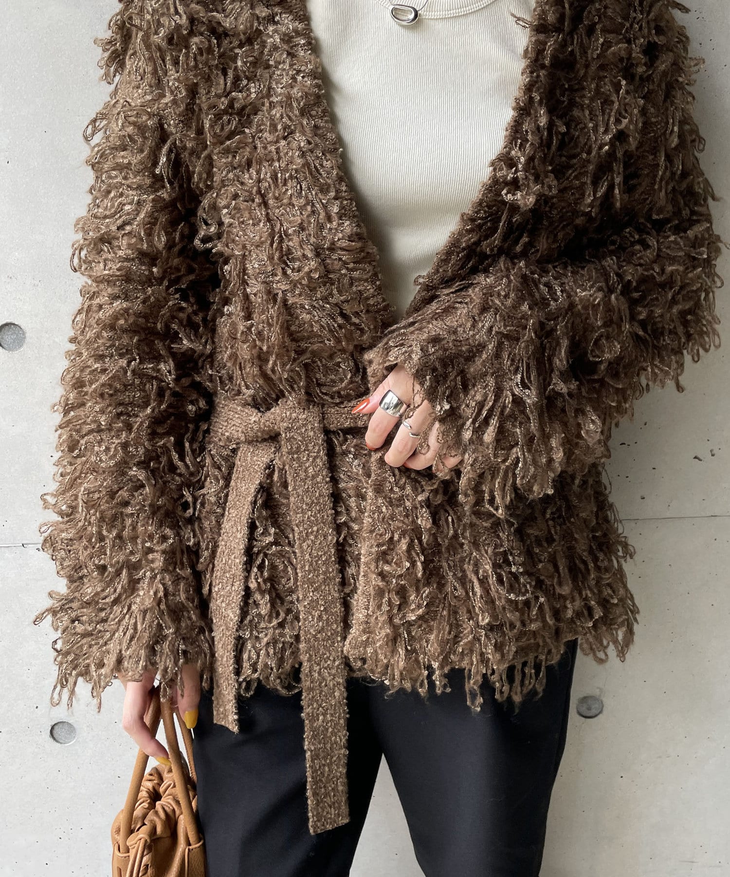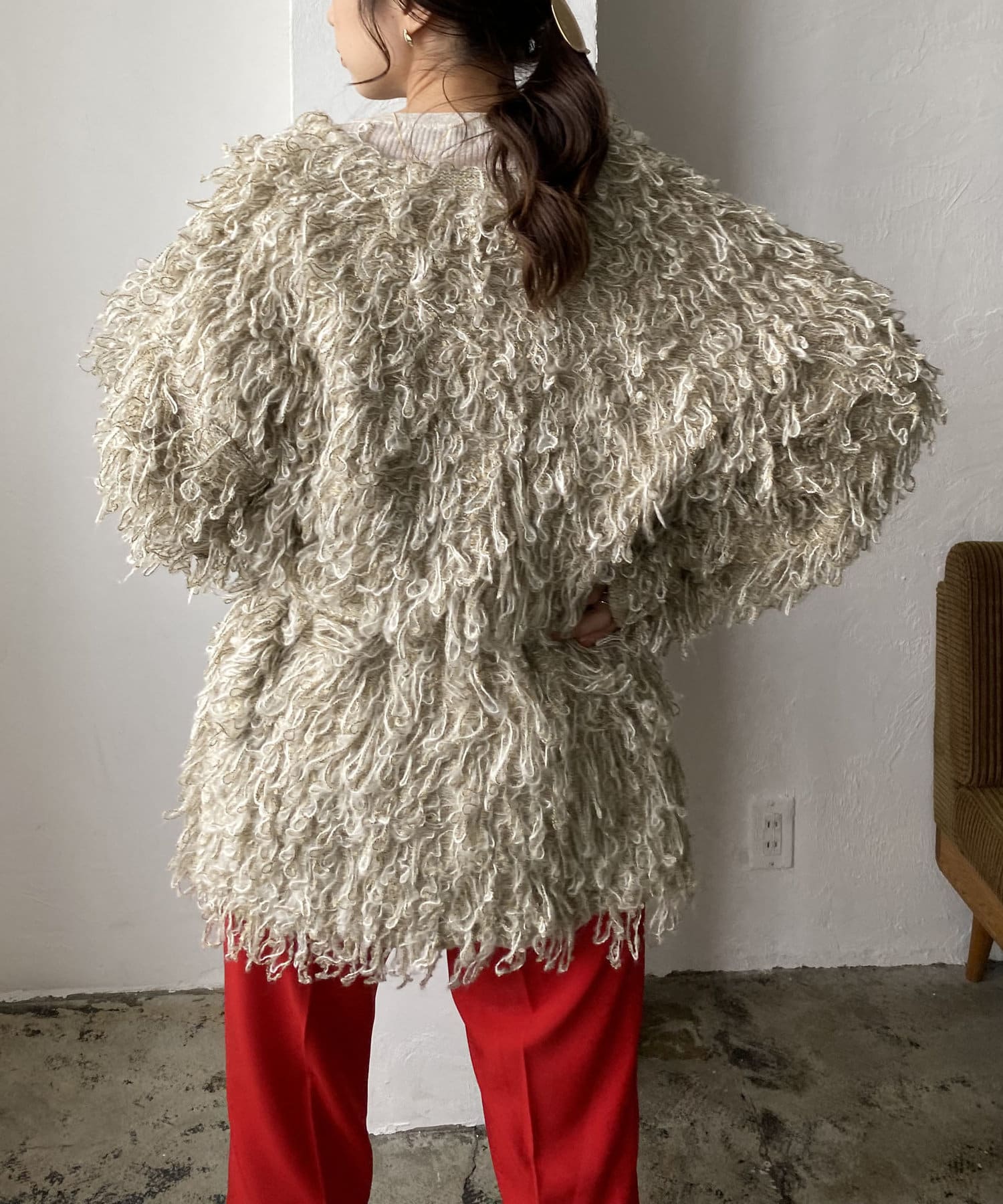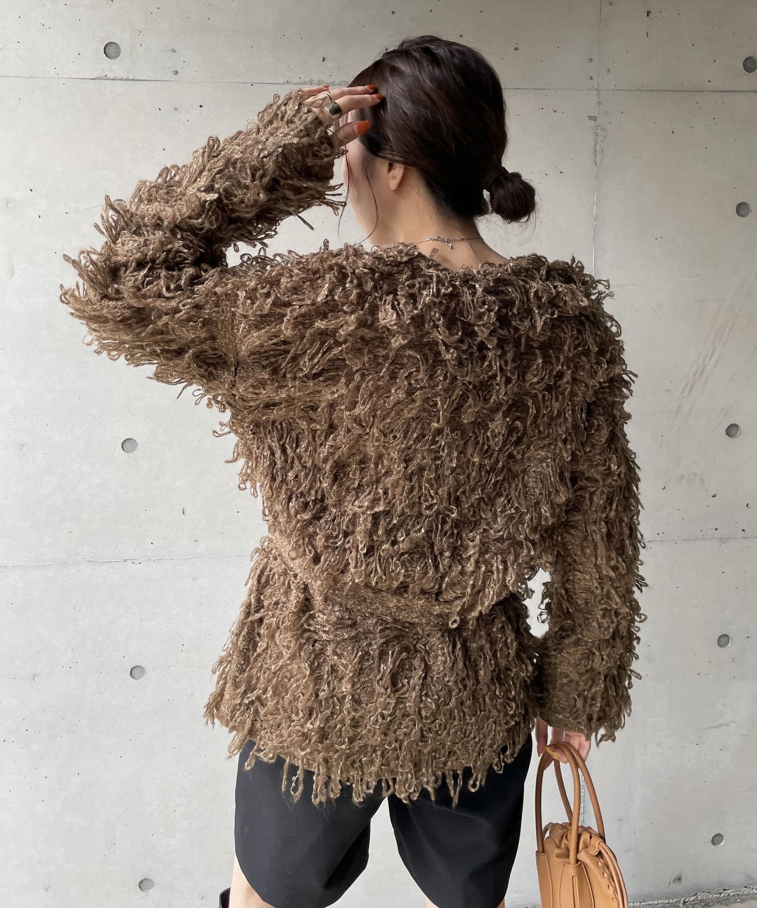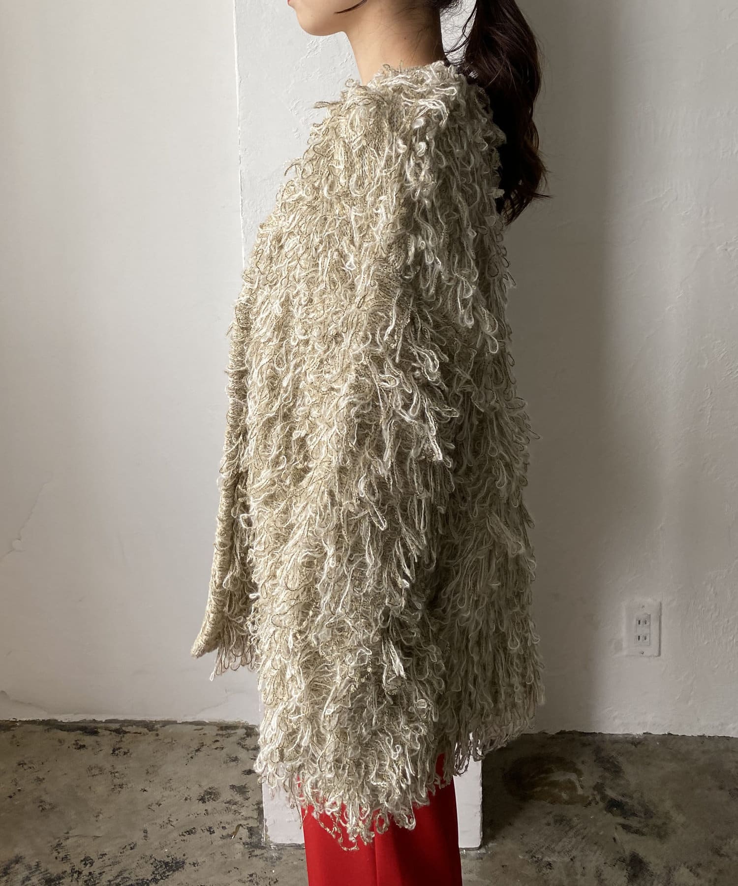 毛足の長いループフリンジが前面に施された目を惹くデザイン。