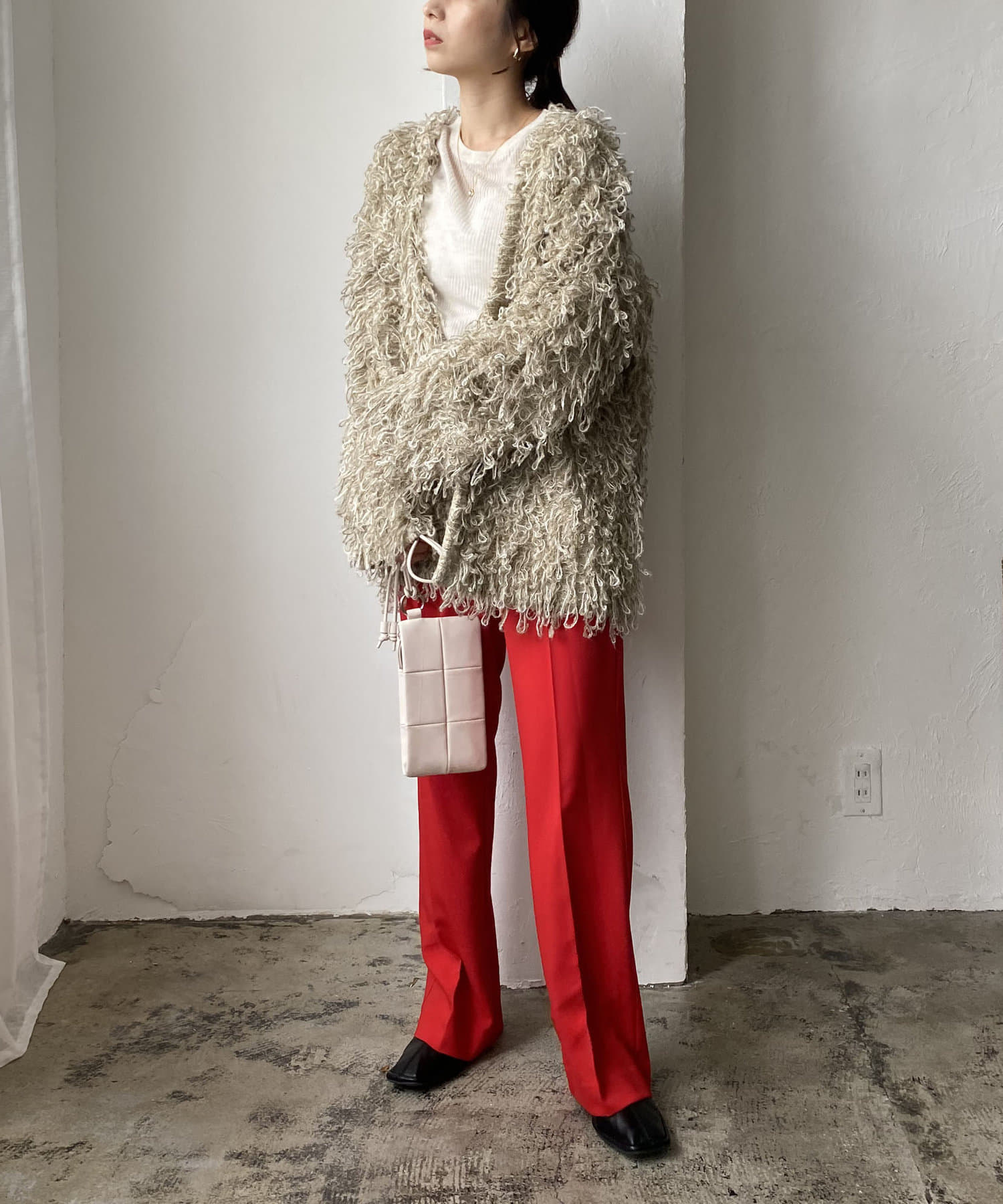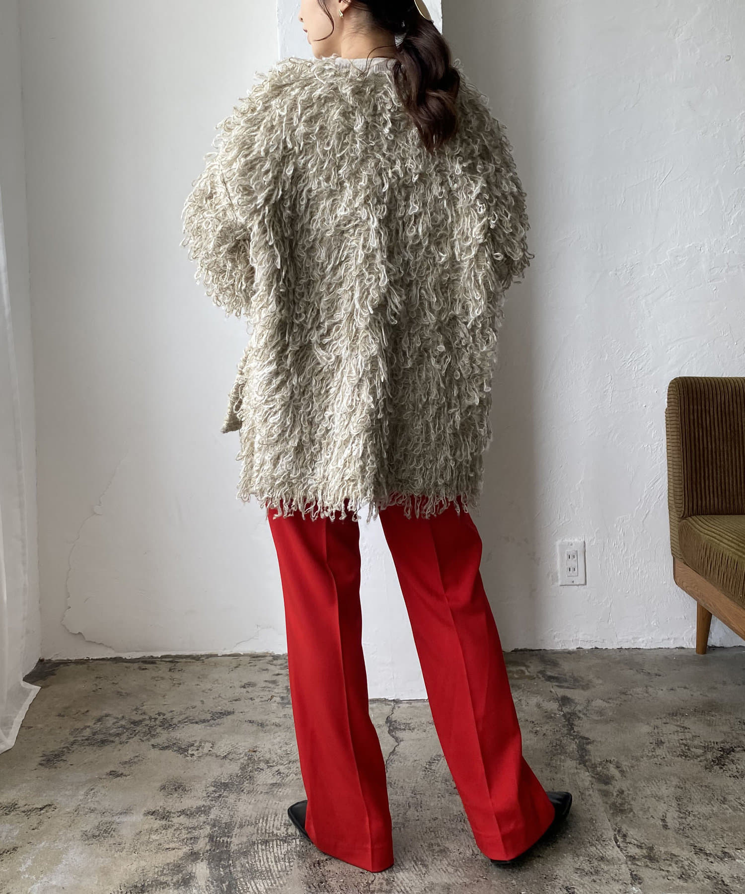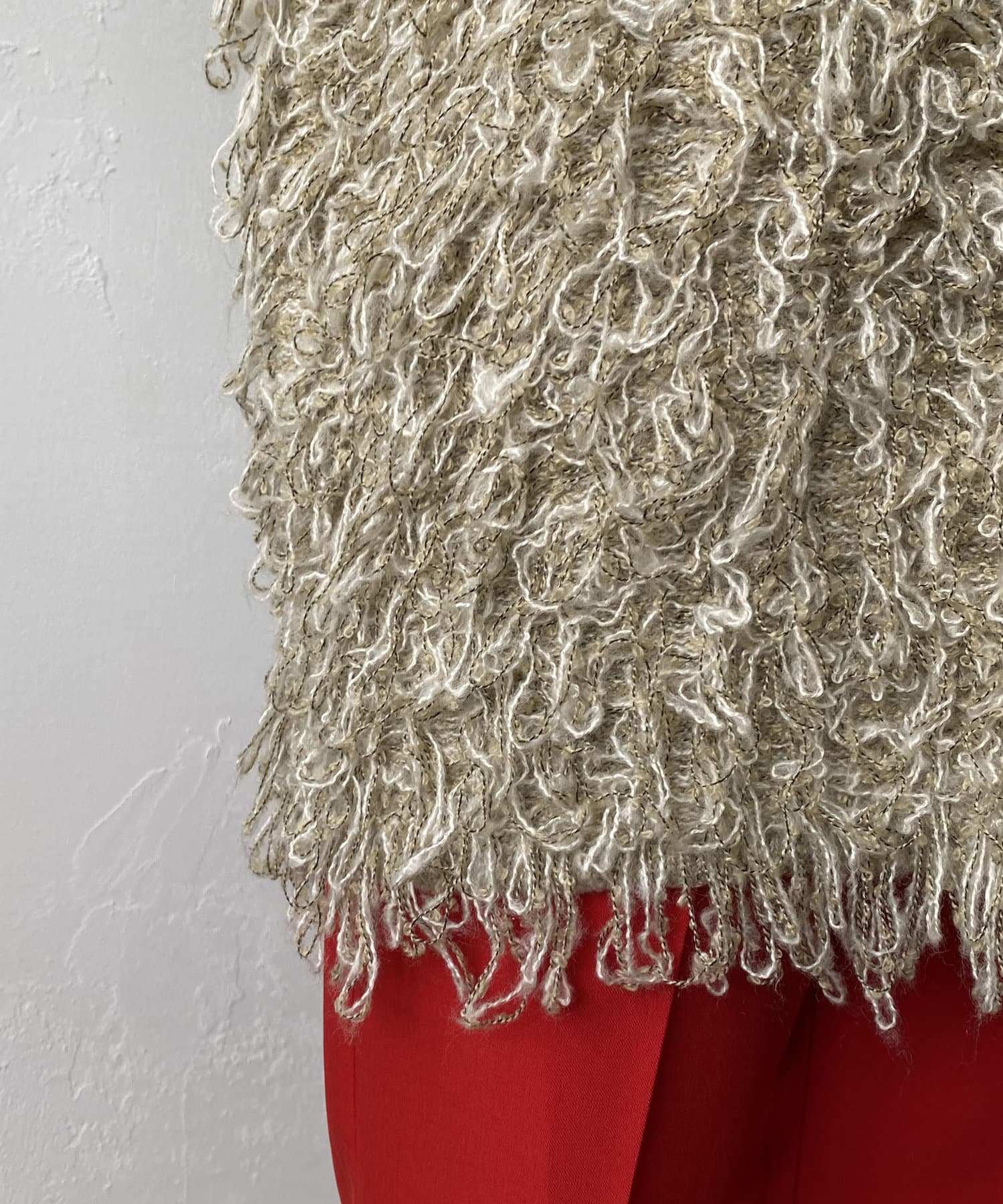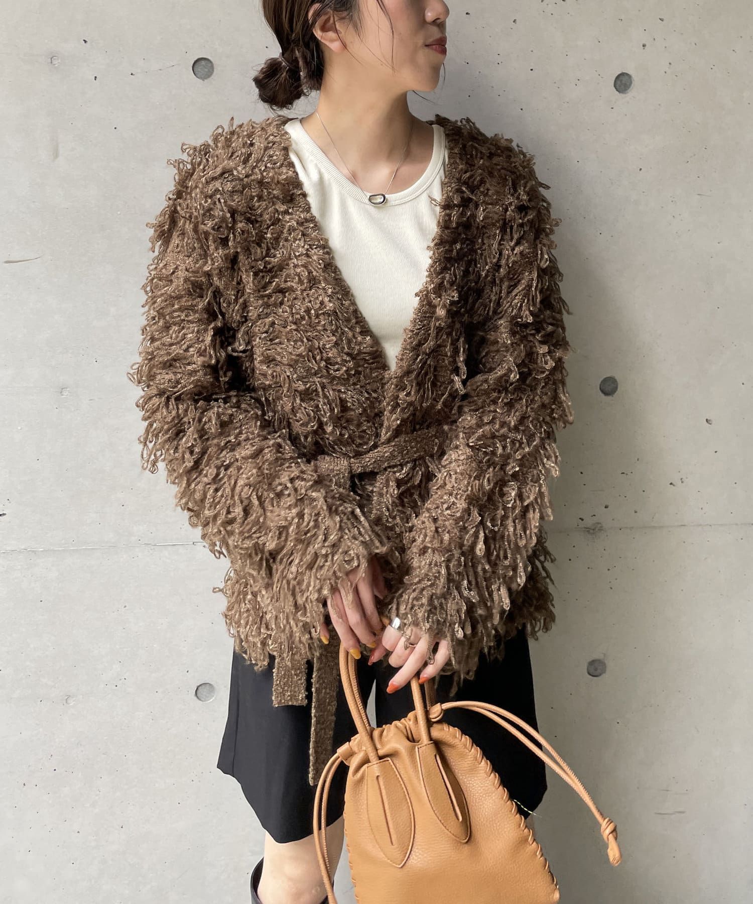 毛足の長いループフリンジが前面に施された目を惹くデザイン。