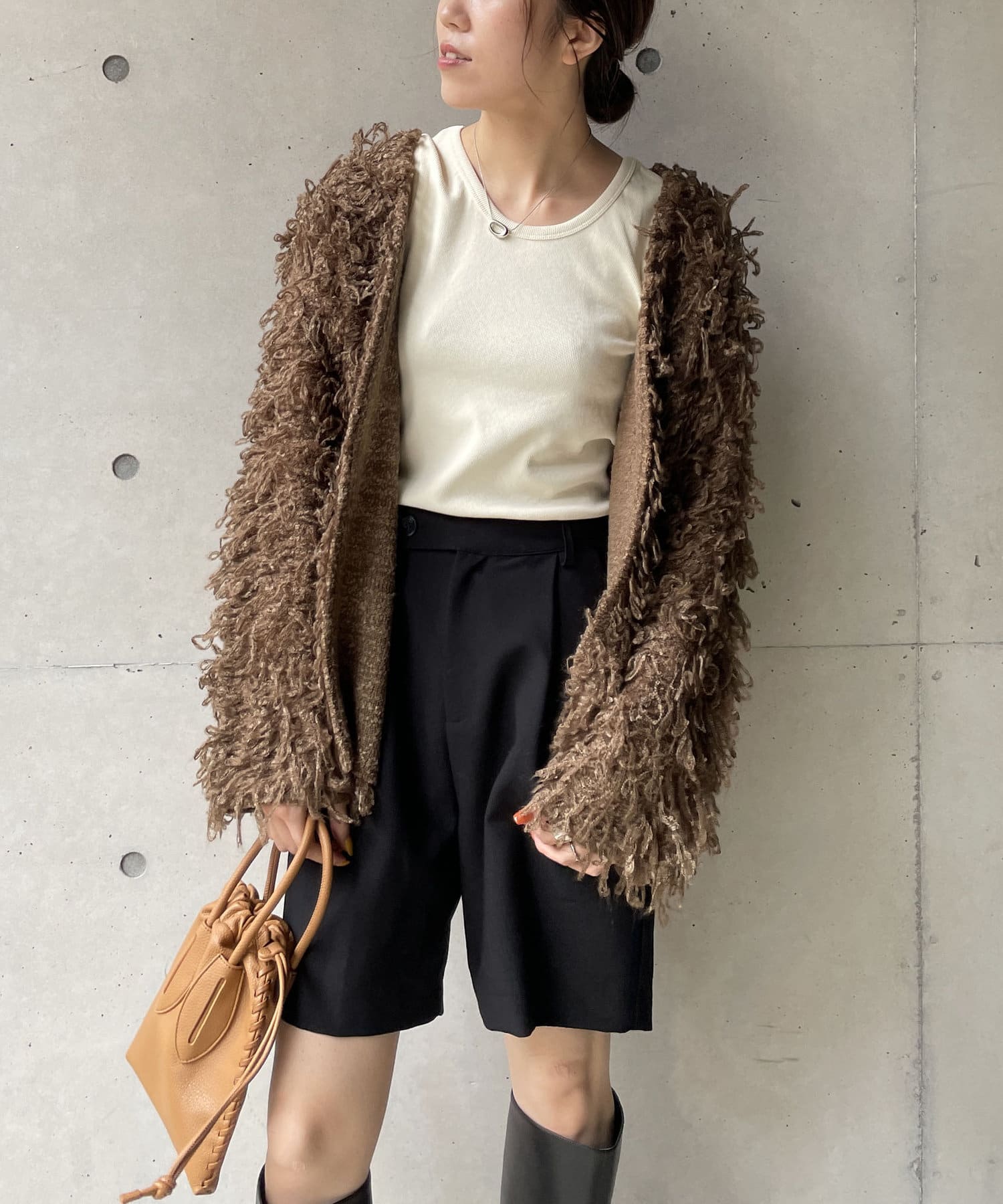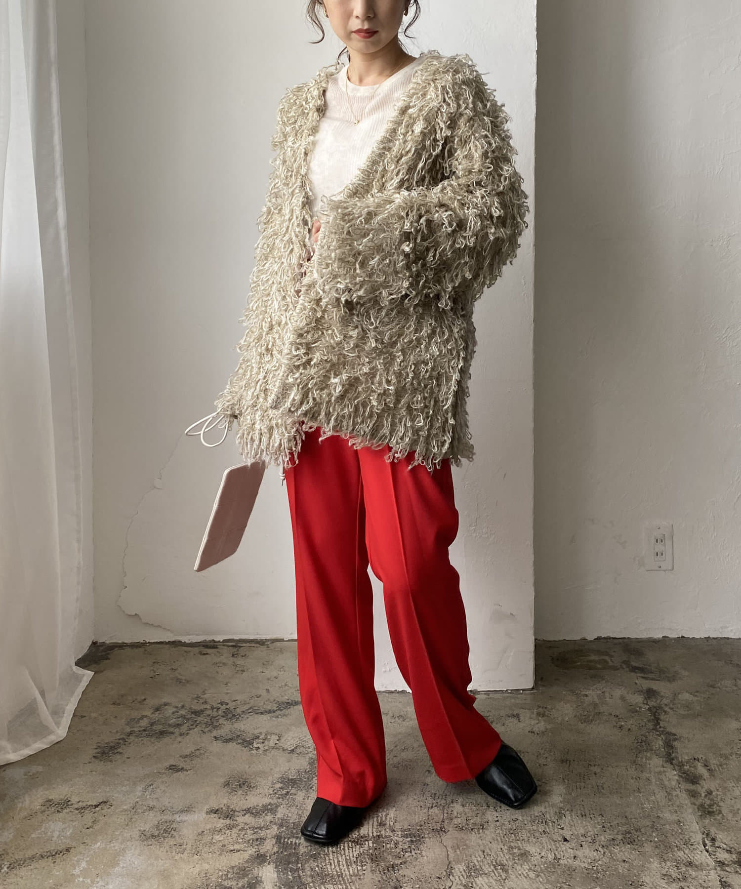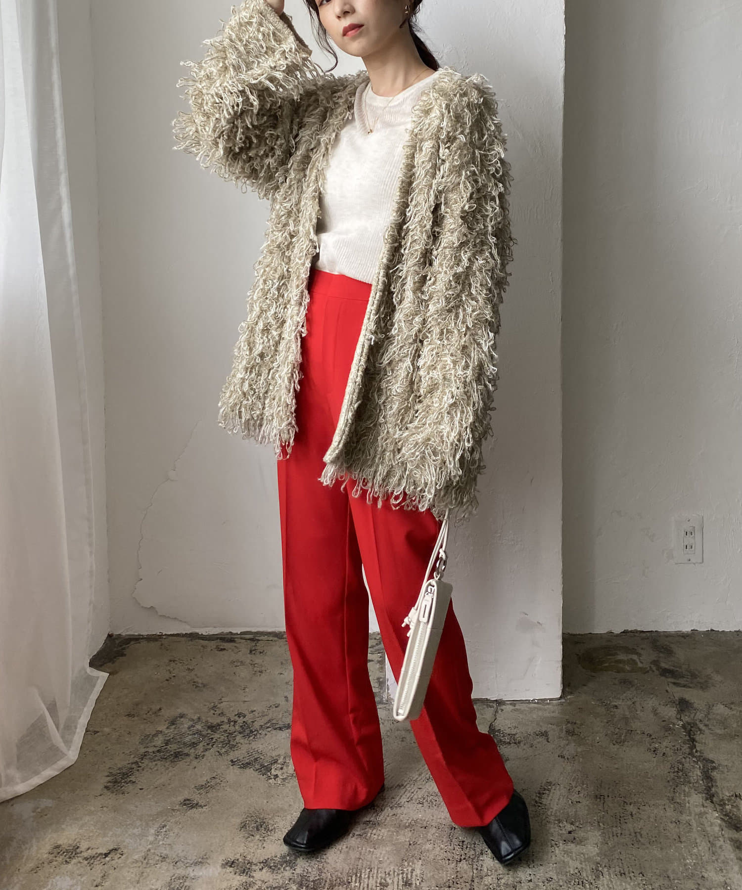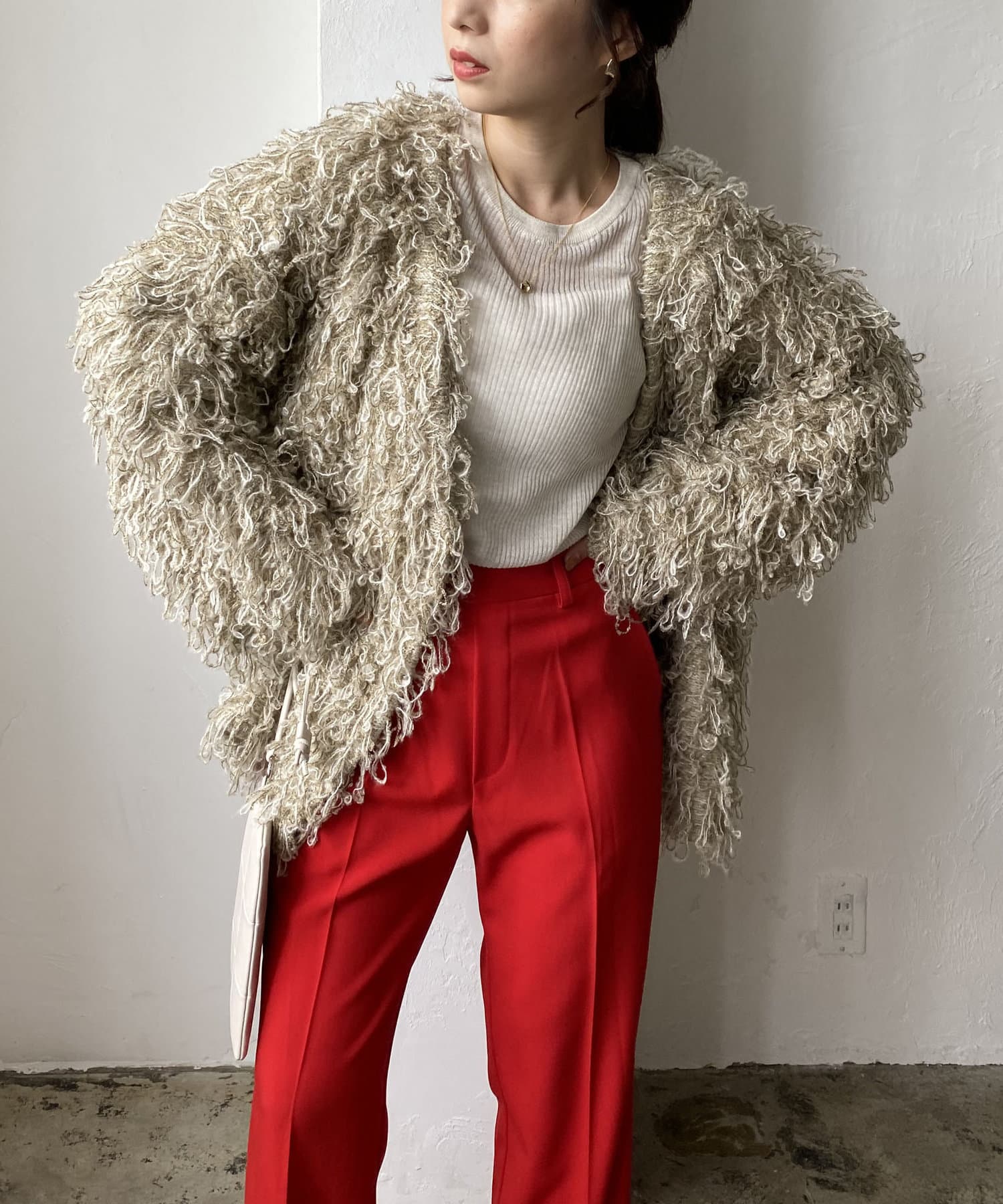 毛足の長いループフリンジが前面に施された目を惹くデザイン。
