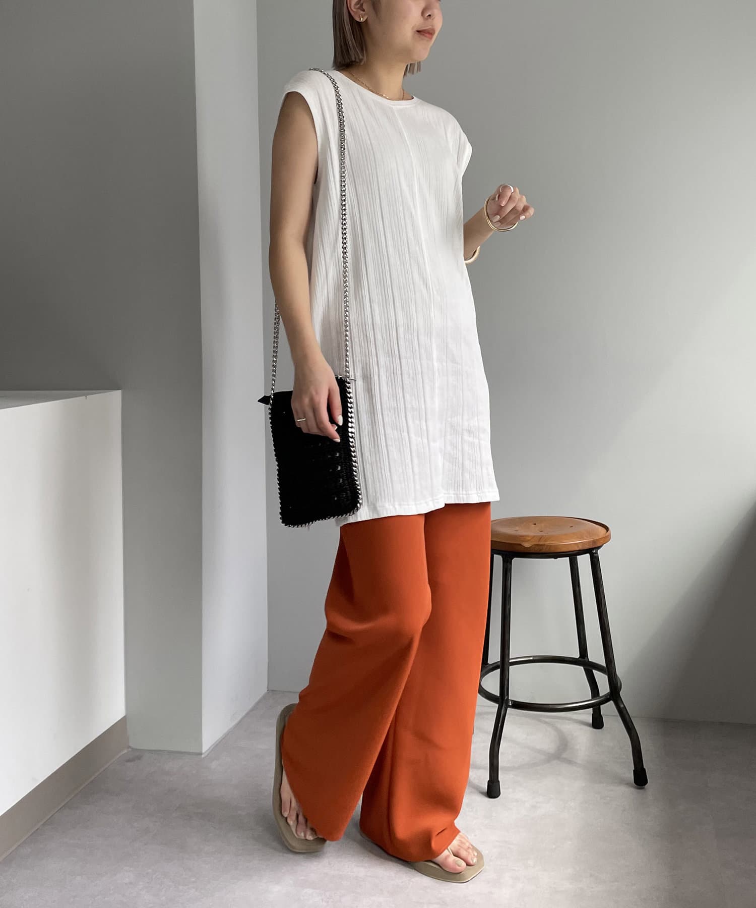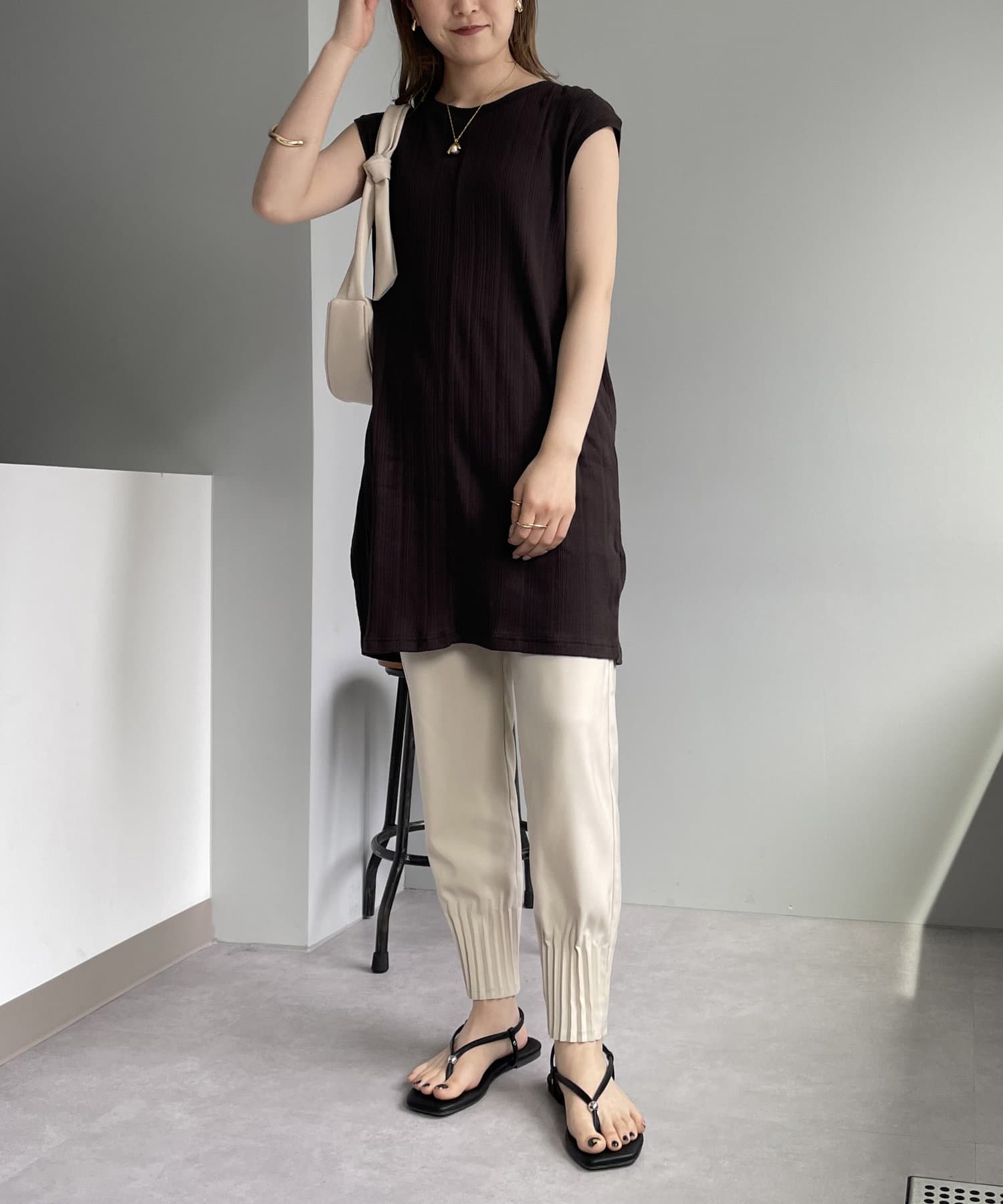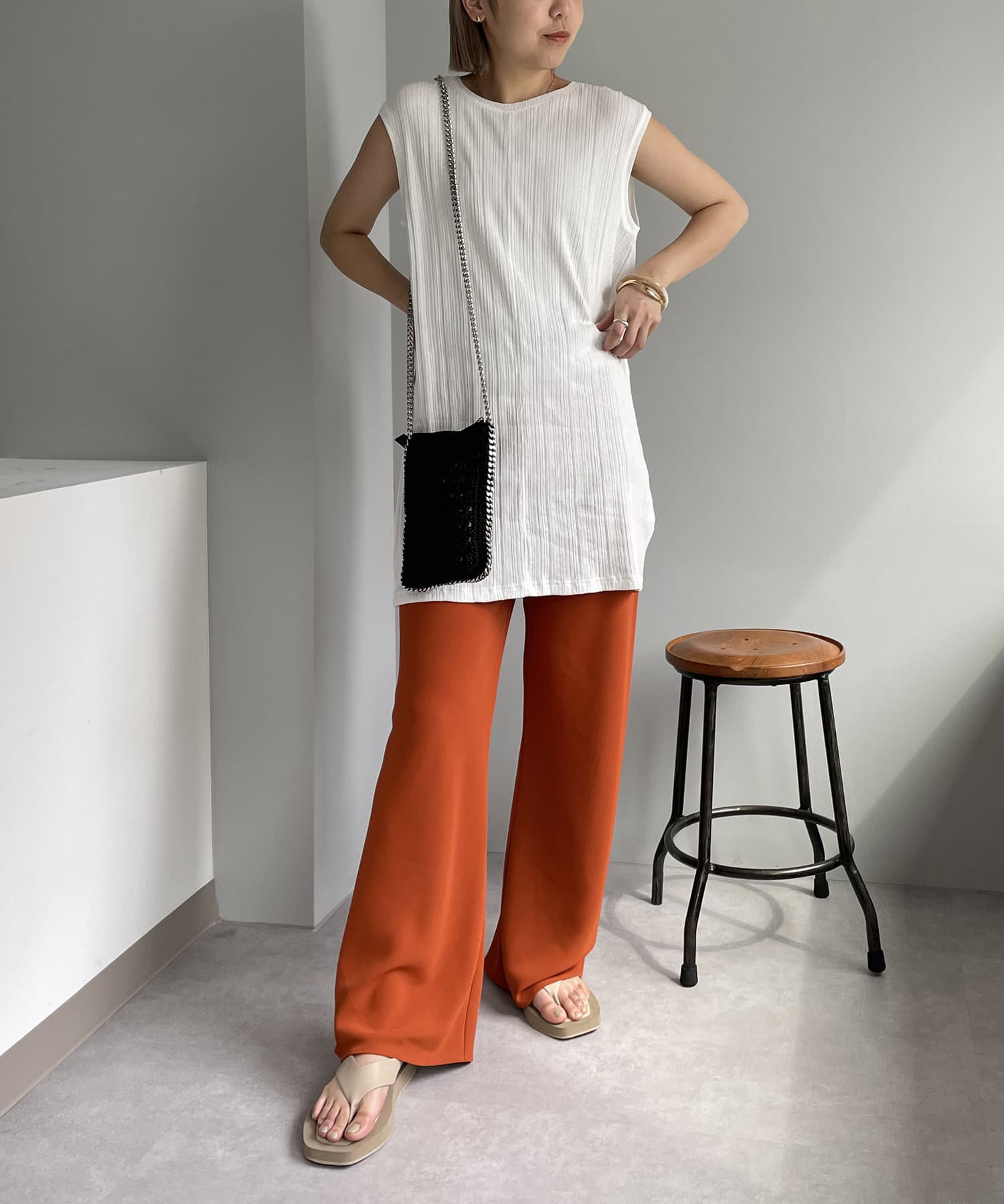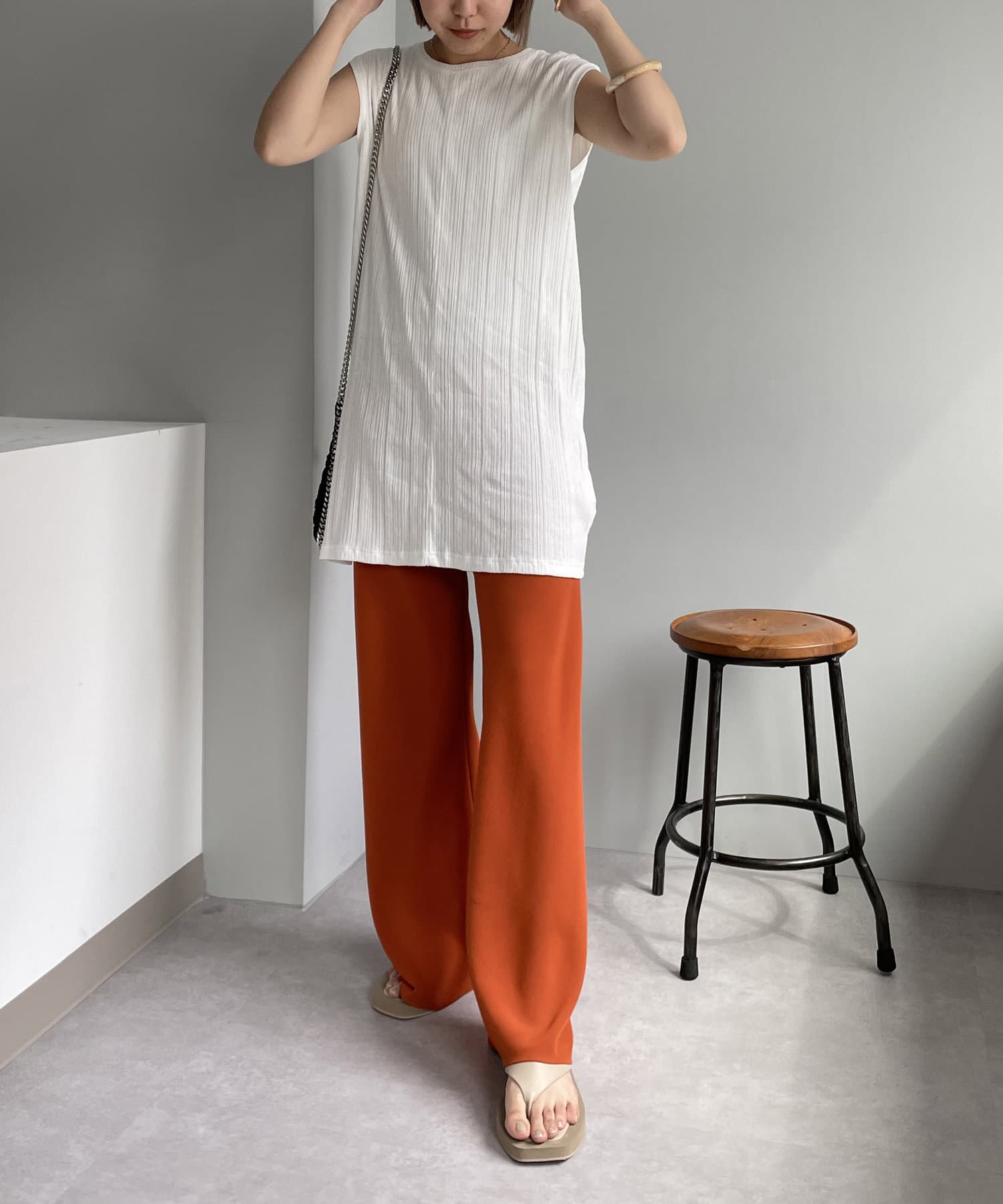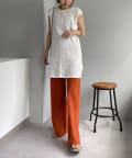 ・プリーツパンツやカットソー素材のパンツを合わせてアウトスタイルで