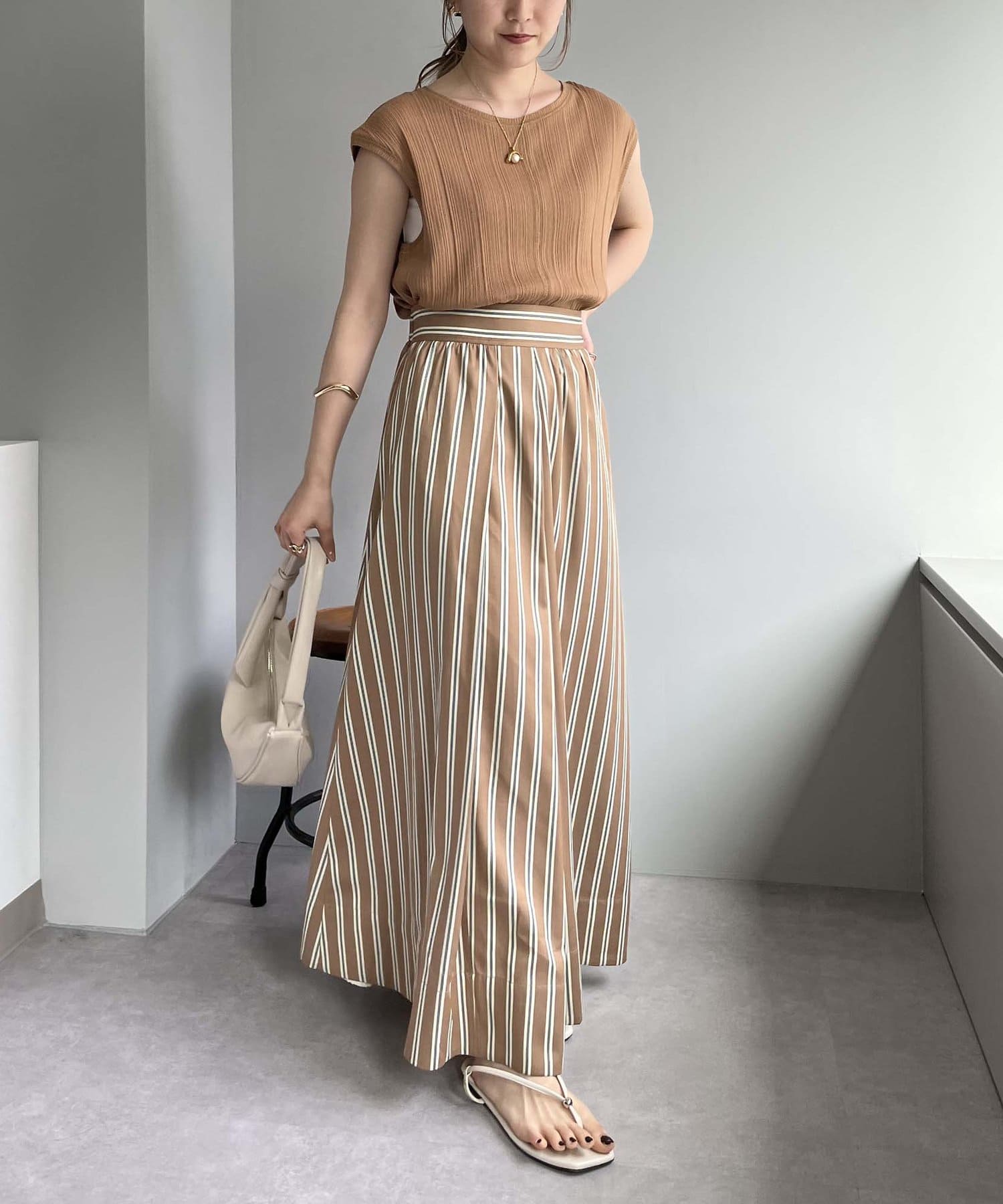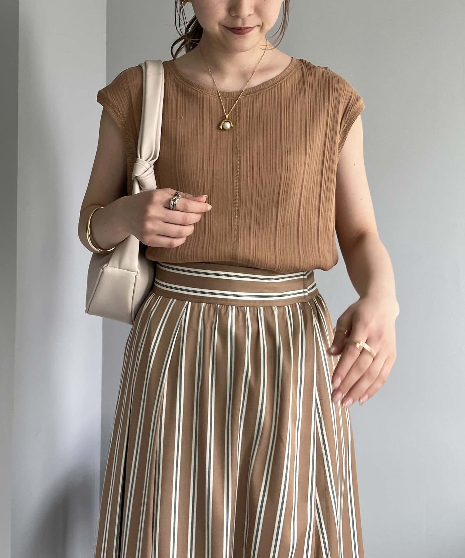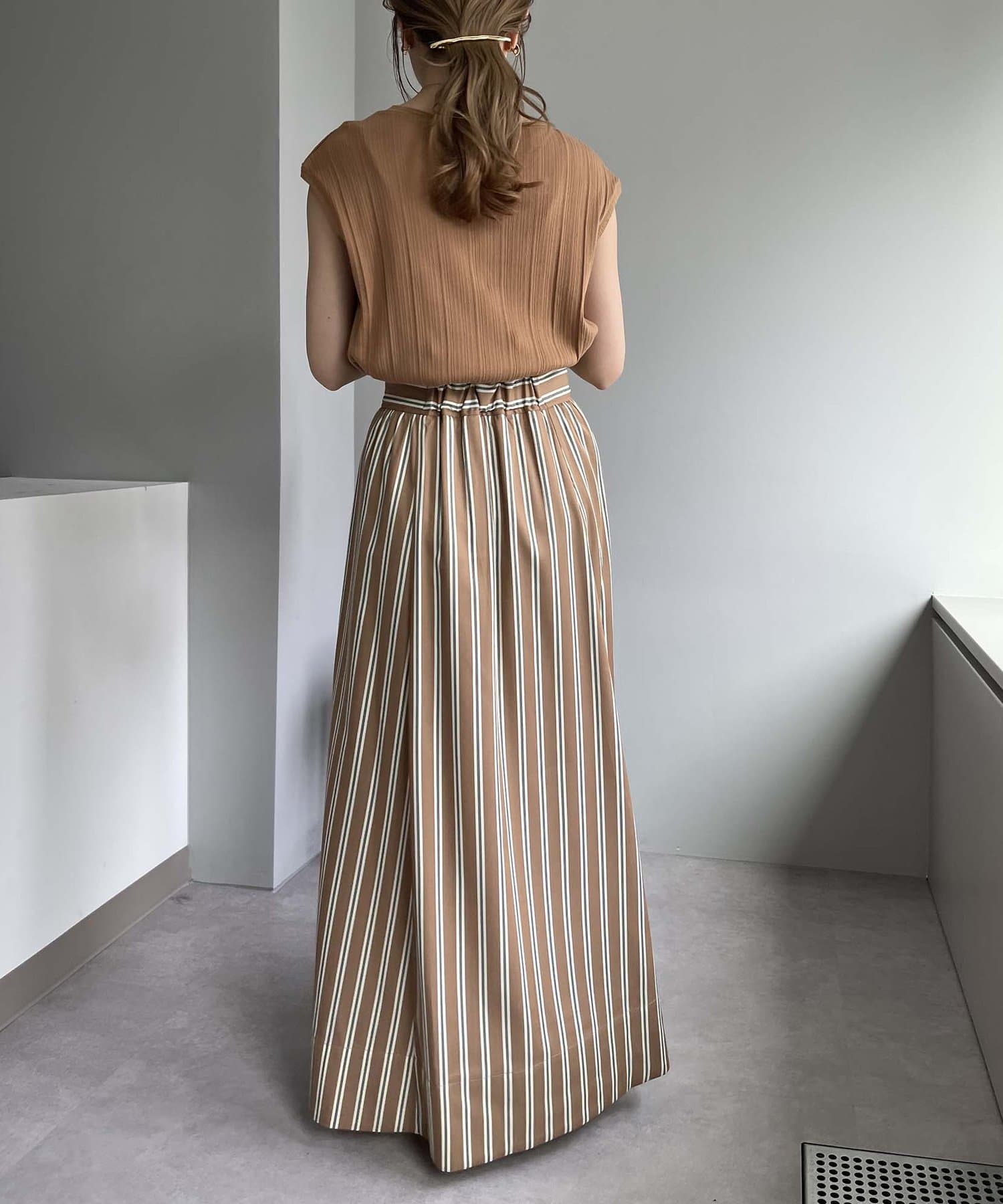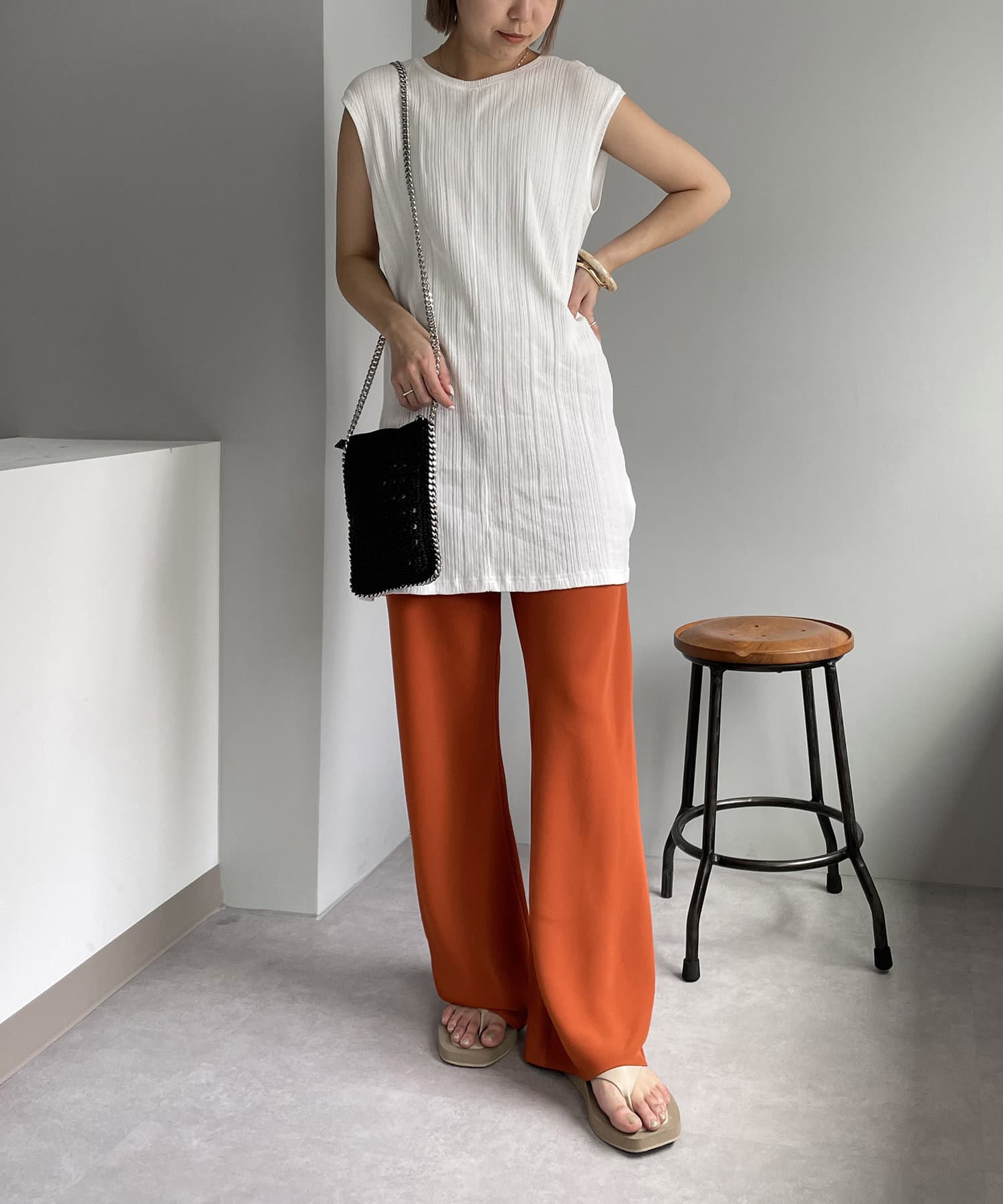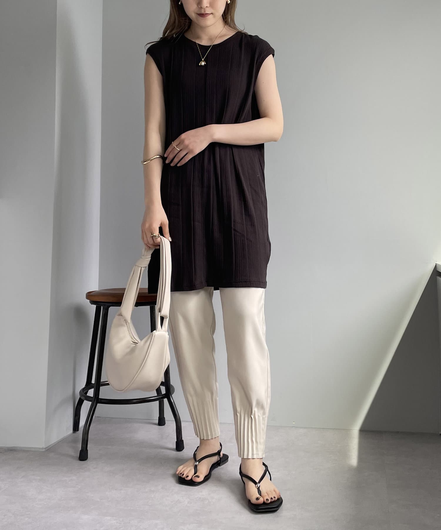 ・プリーツパンツやカットソー素材のパンツを合わせてアウトスタイルで