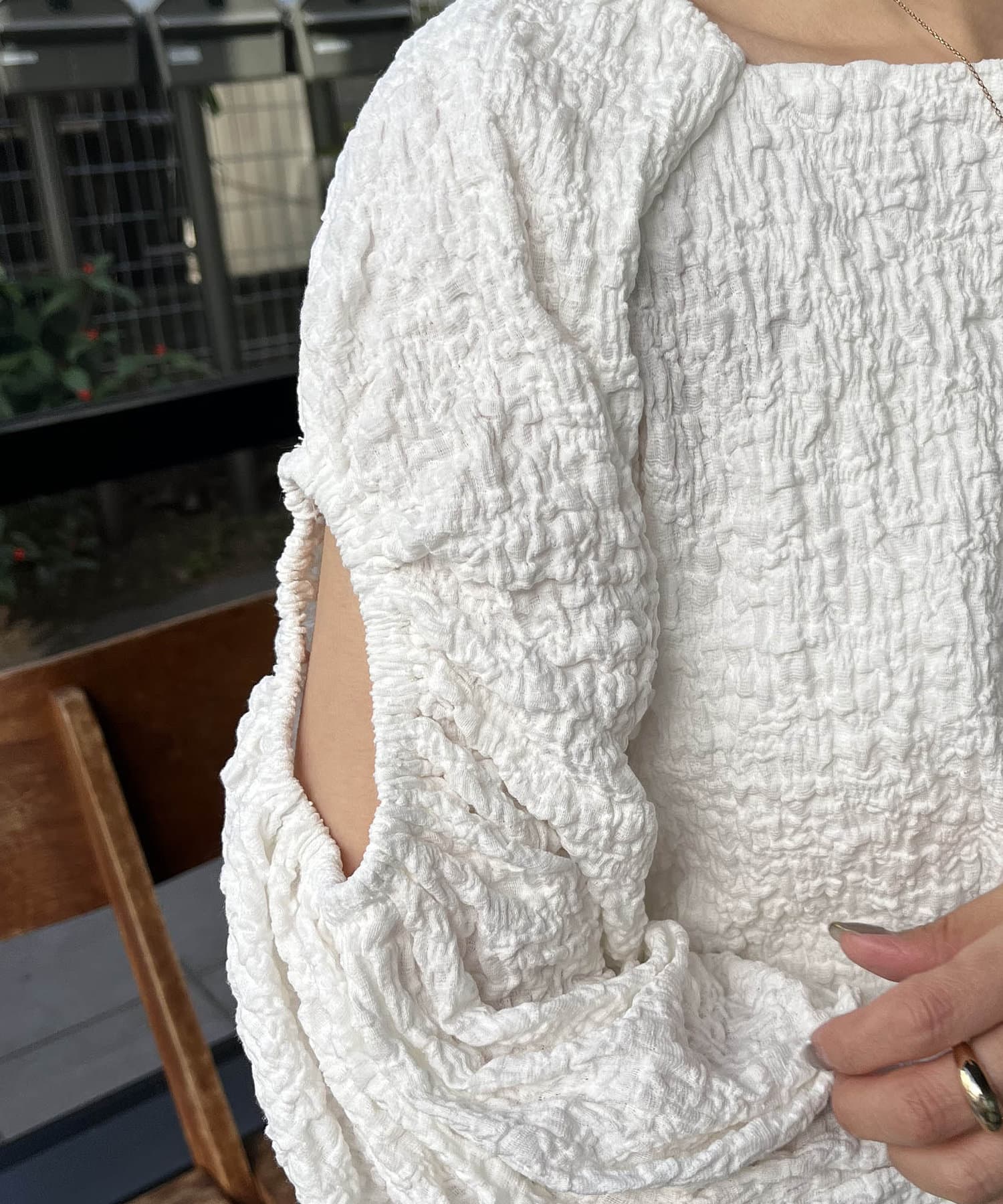 ・二の腕カバーしながら縦長に開いたホールで肌見せができる