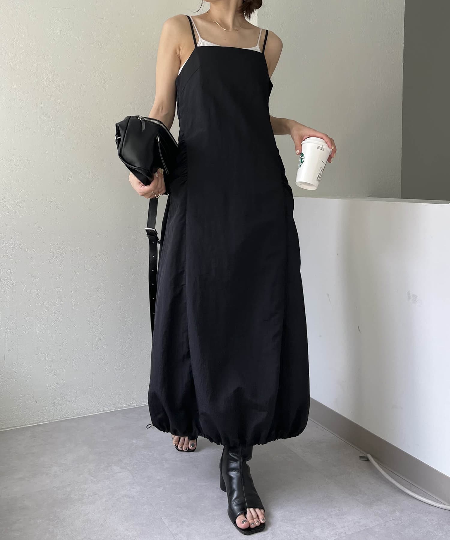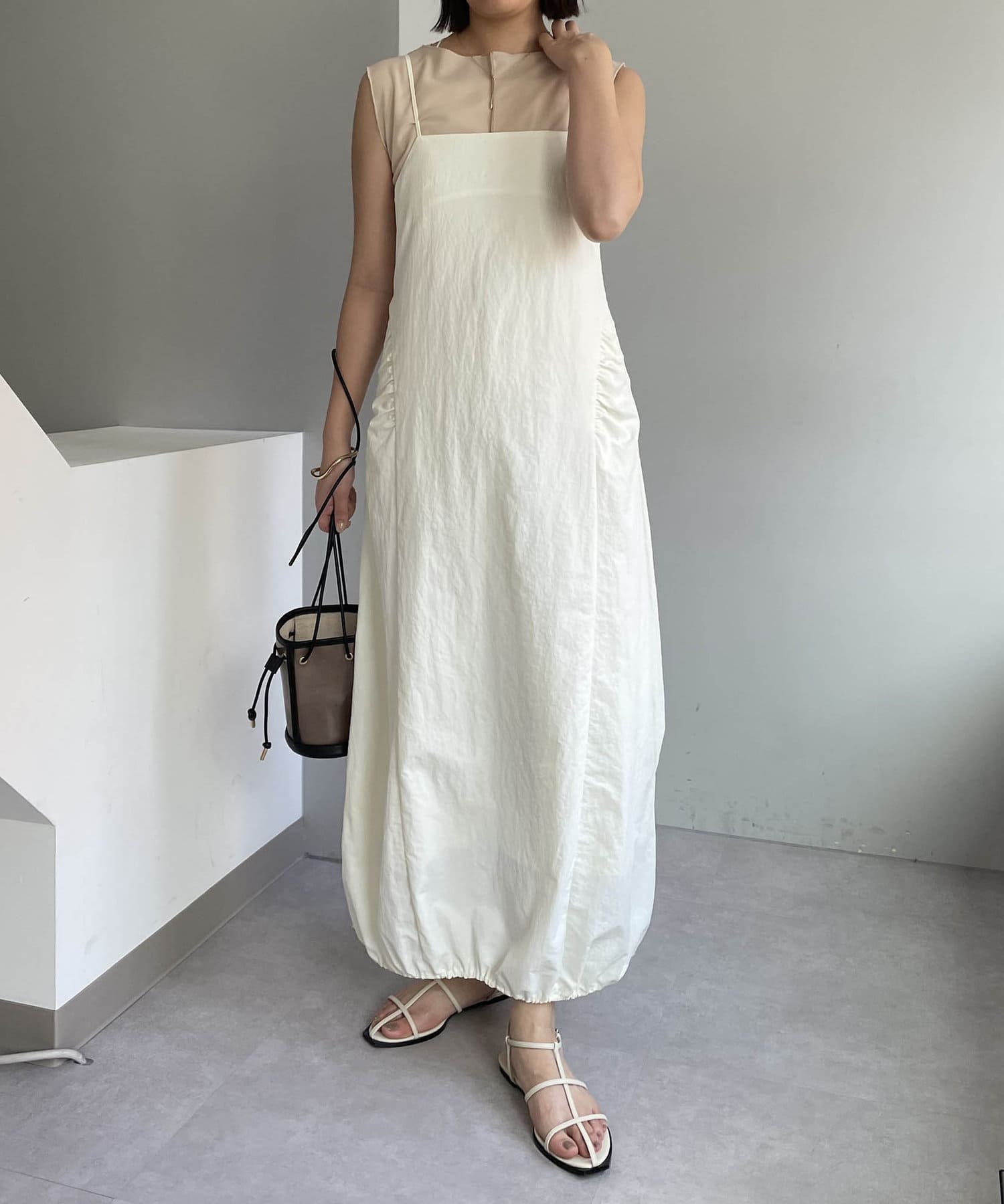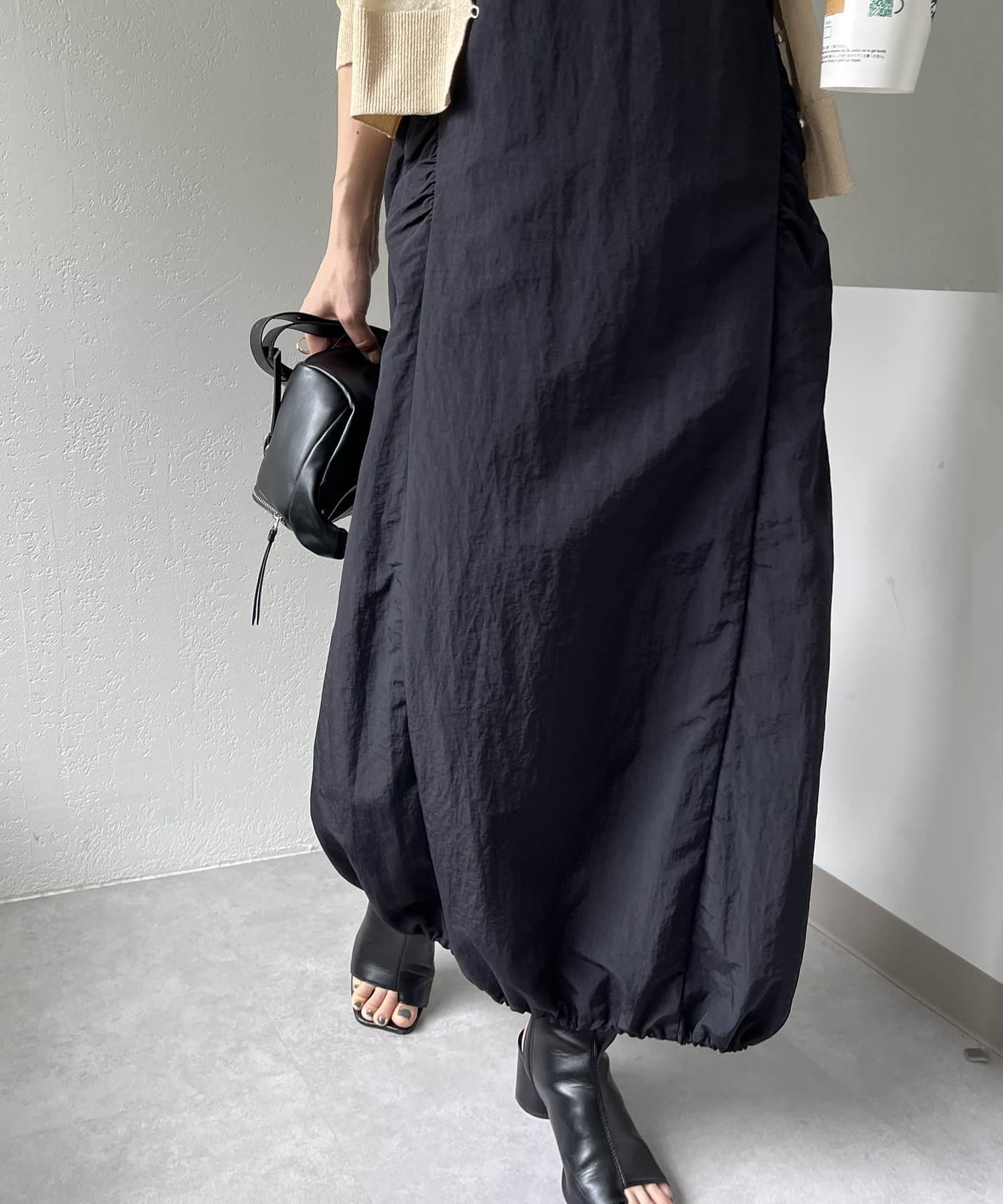 トレンドのシャカシャカ素材のワンピースを色々探していましたが、レディなシルエットと裾絞りのバルーンヘムに一目惚れして購入しました。