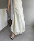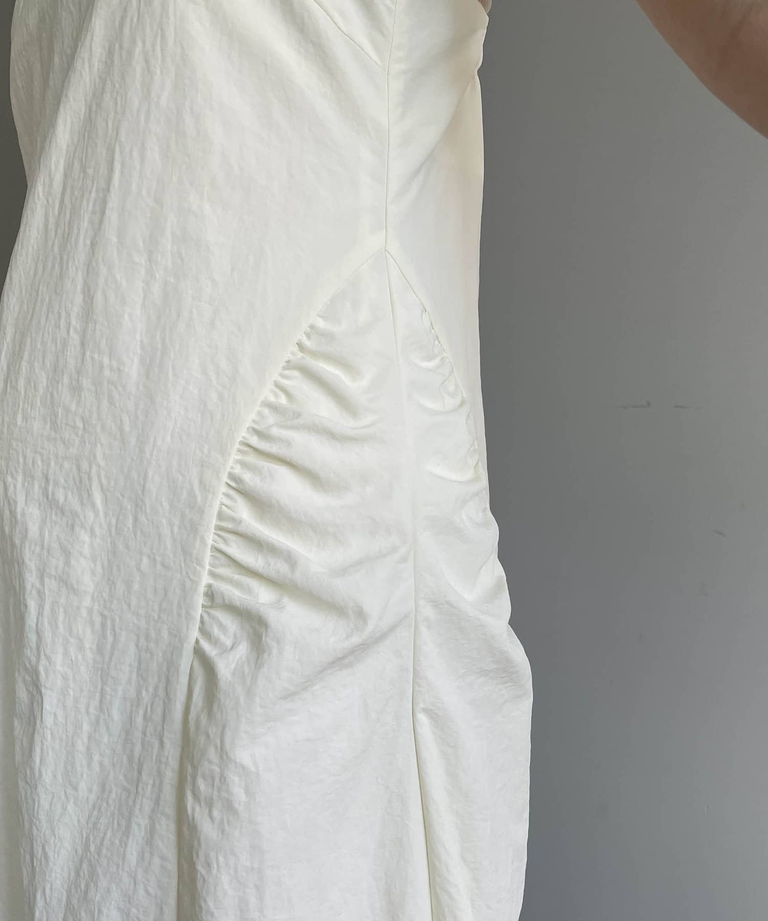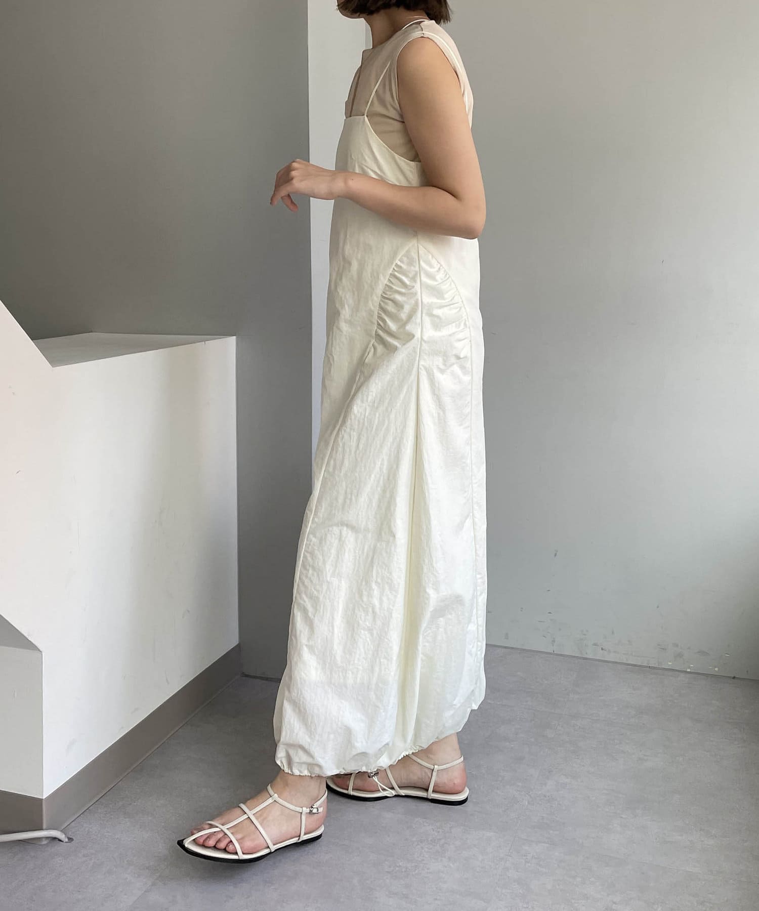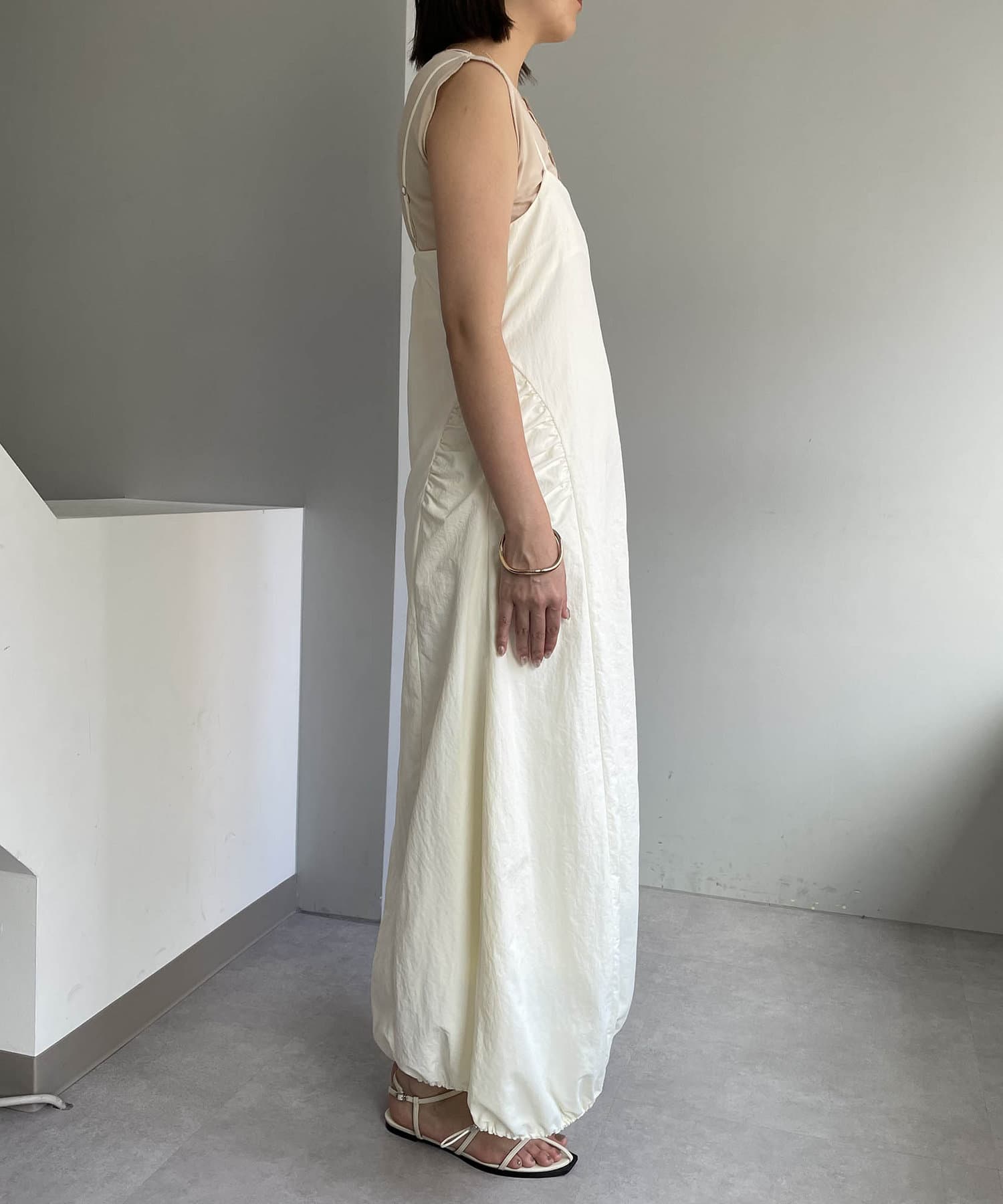 トレンドのシャカシャカ素材のワンピースを色々探していましたが、レディなシルエットと裾絞りのバルーンヘムに一目惚れして購入しました。