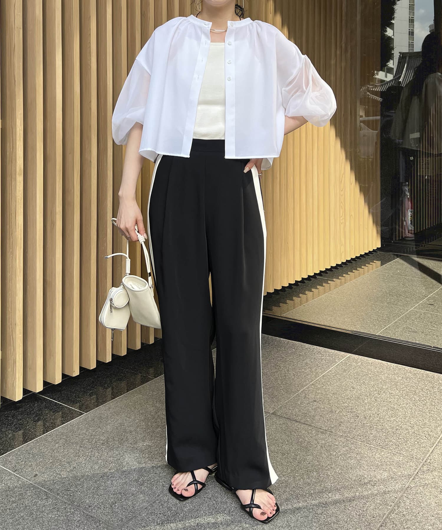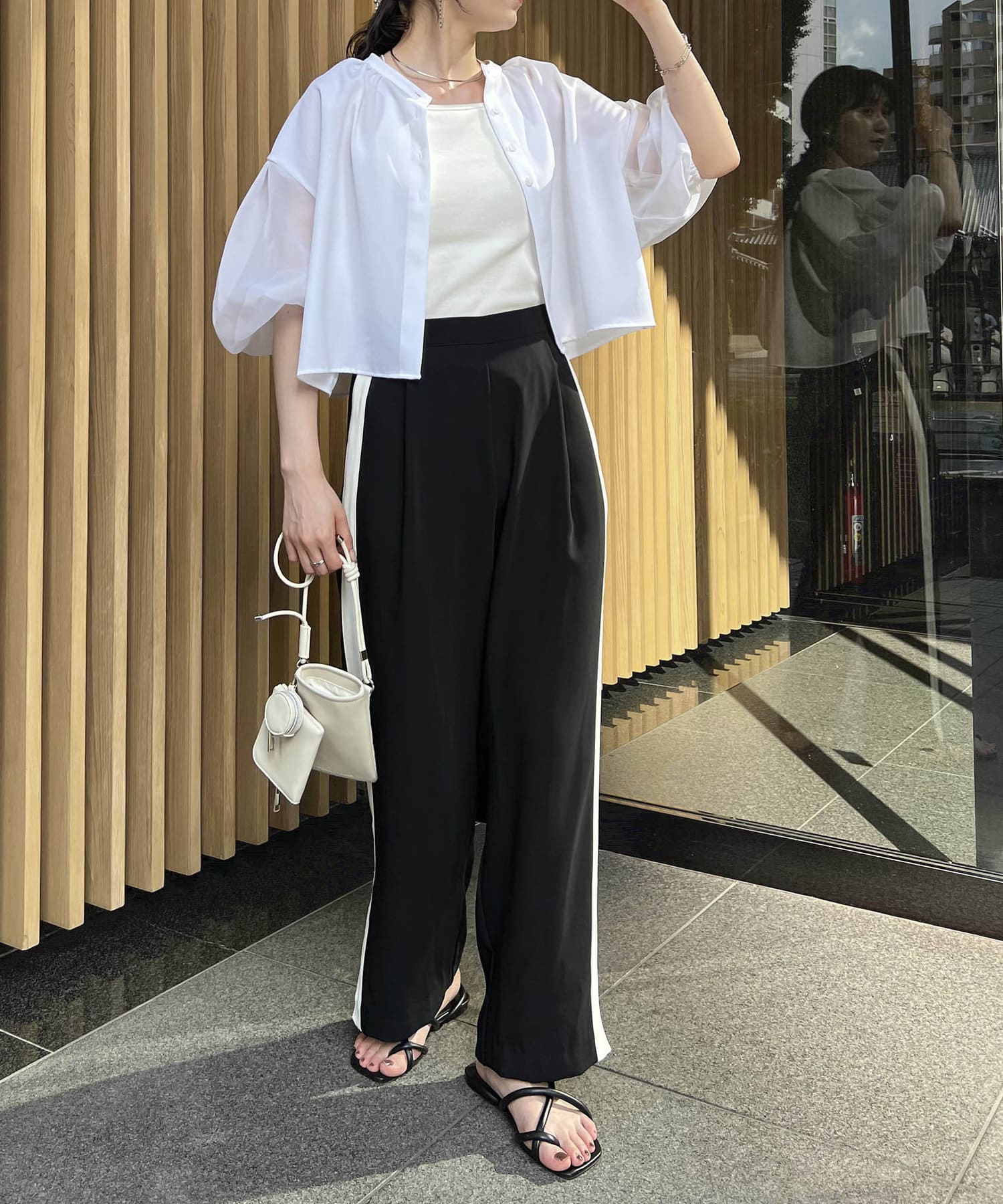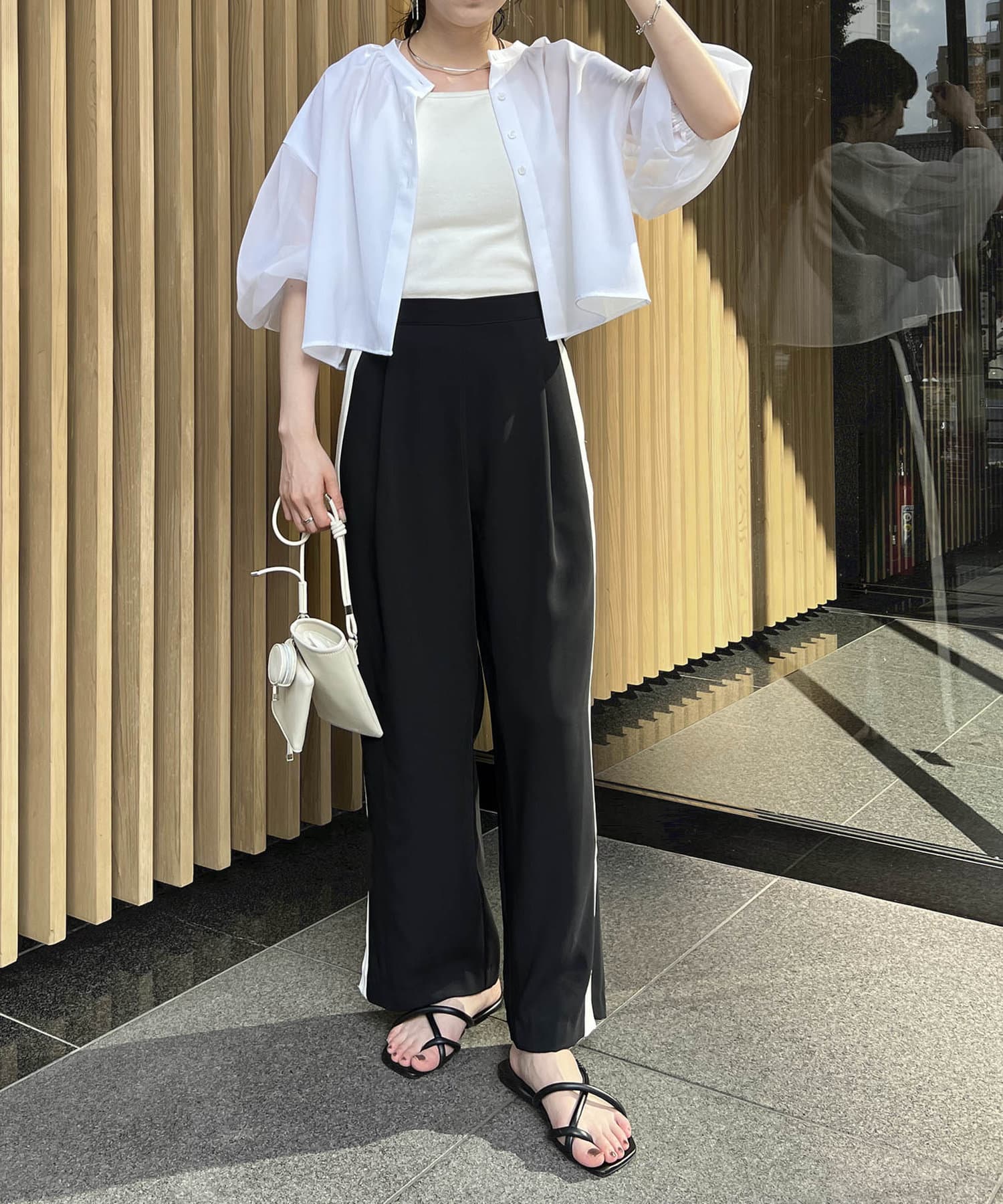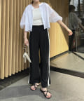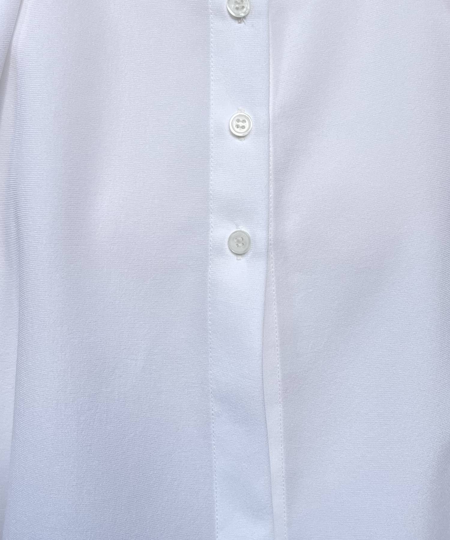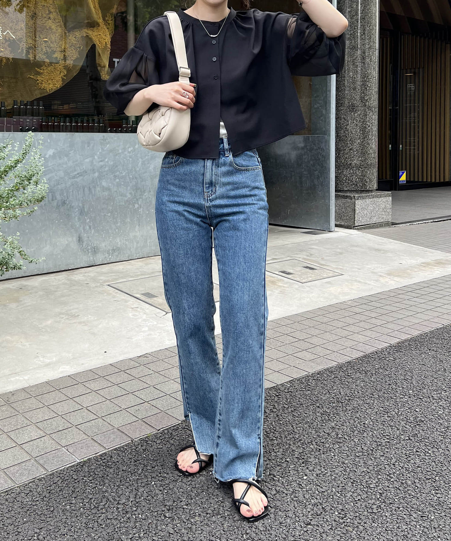・ボタンで前開き、裾はボタンなくスリットのようになっていて抜け感あり