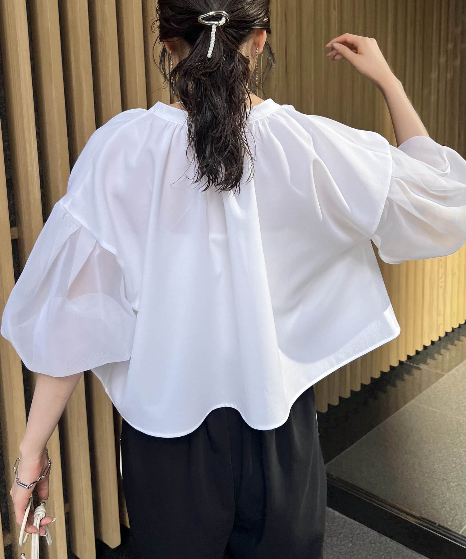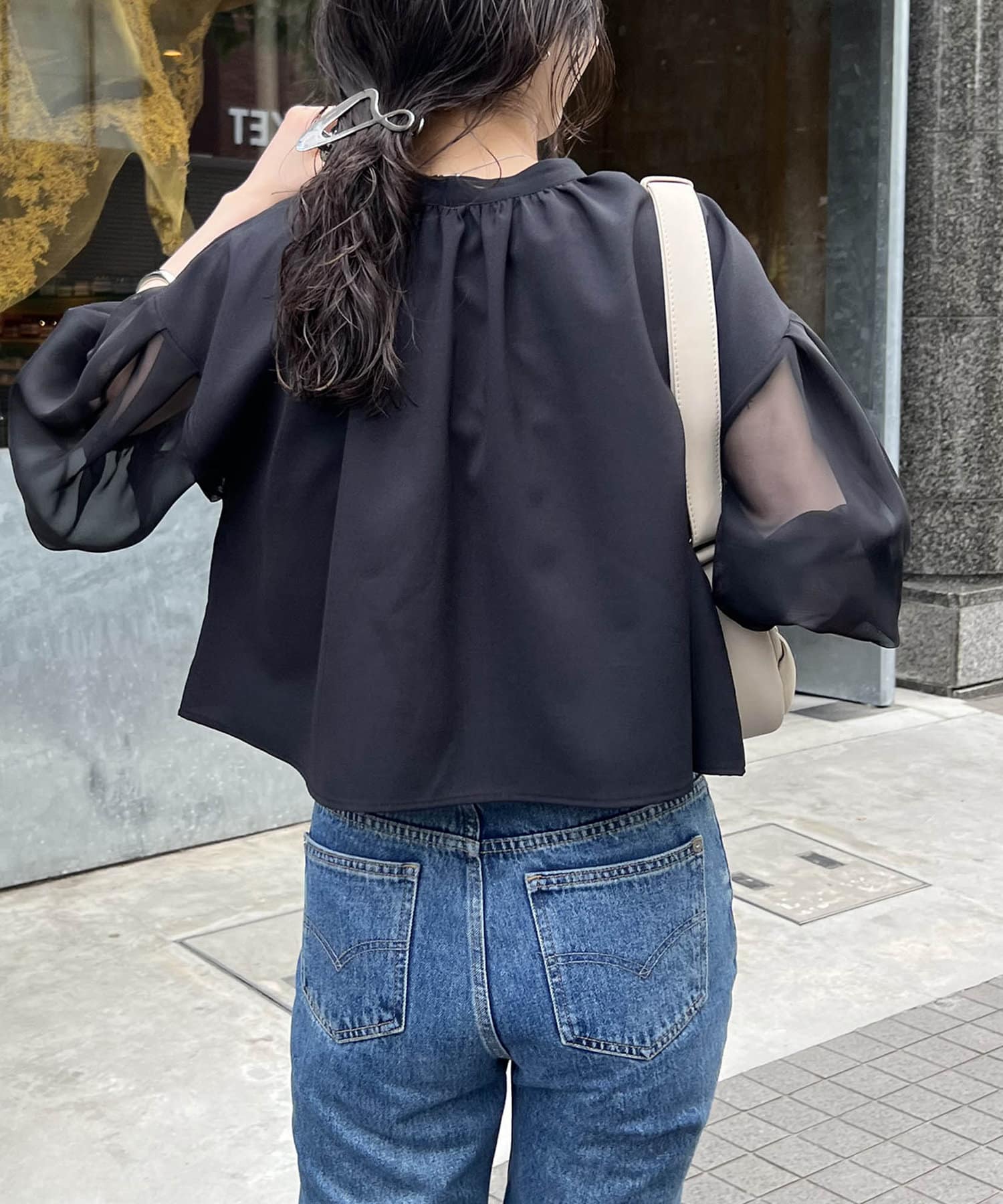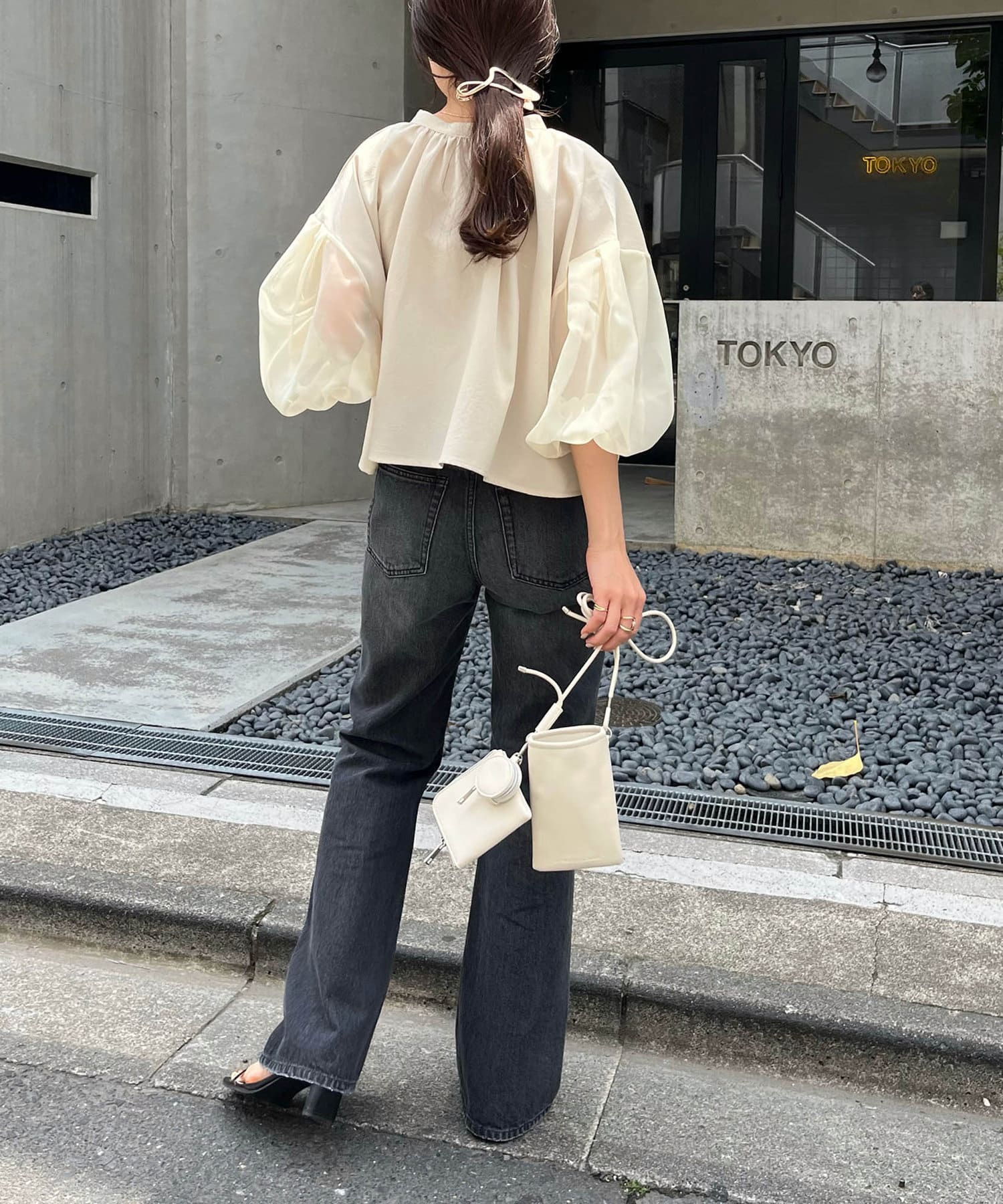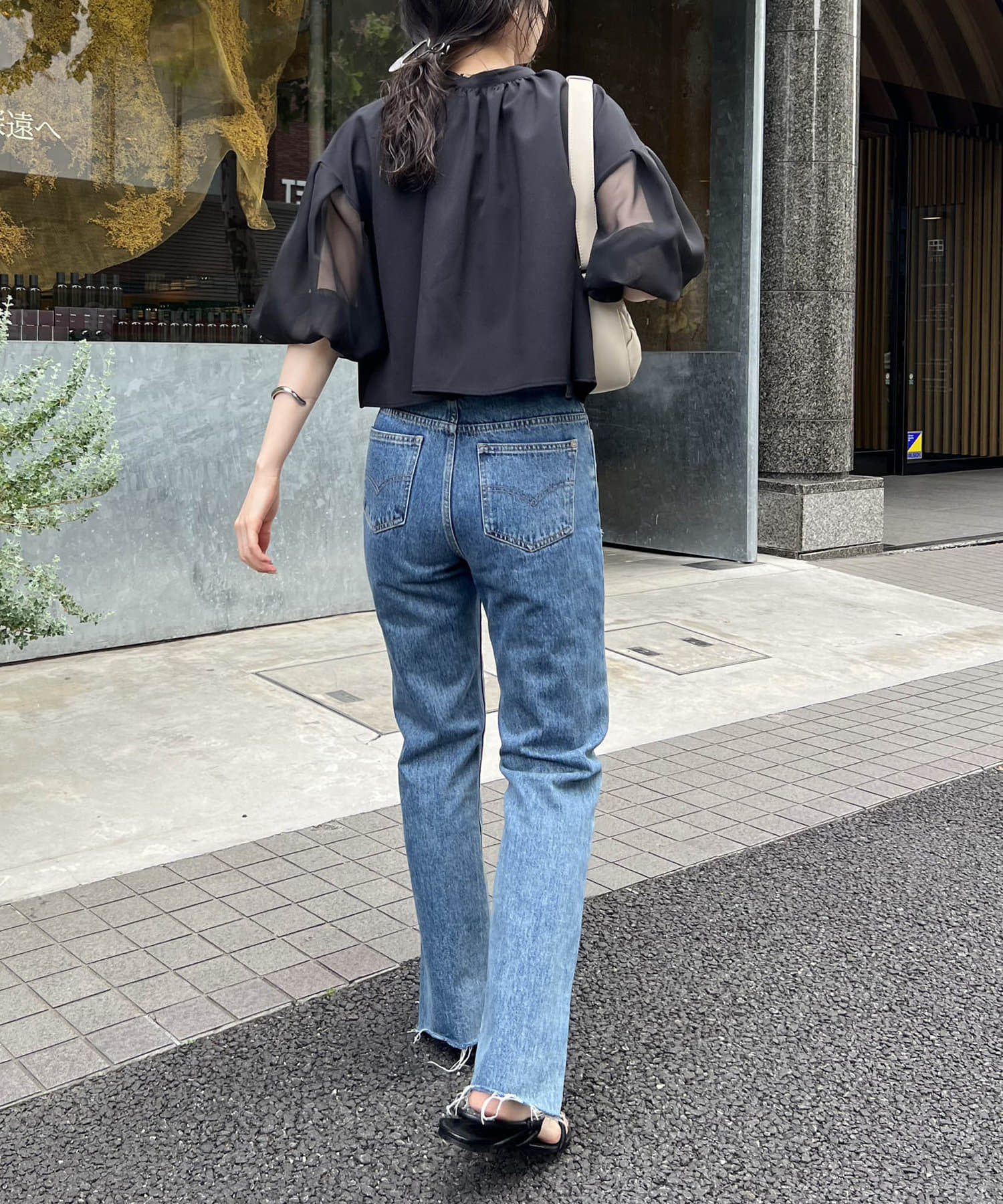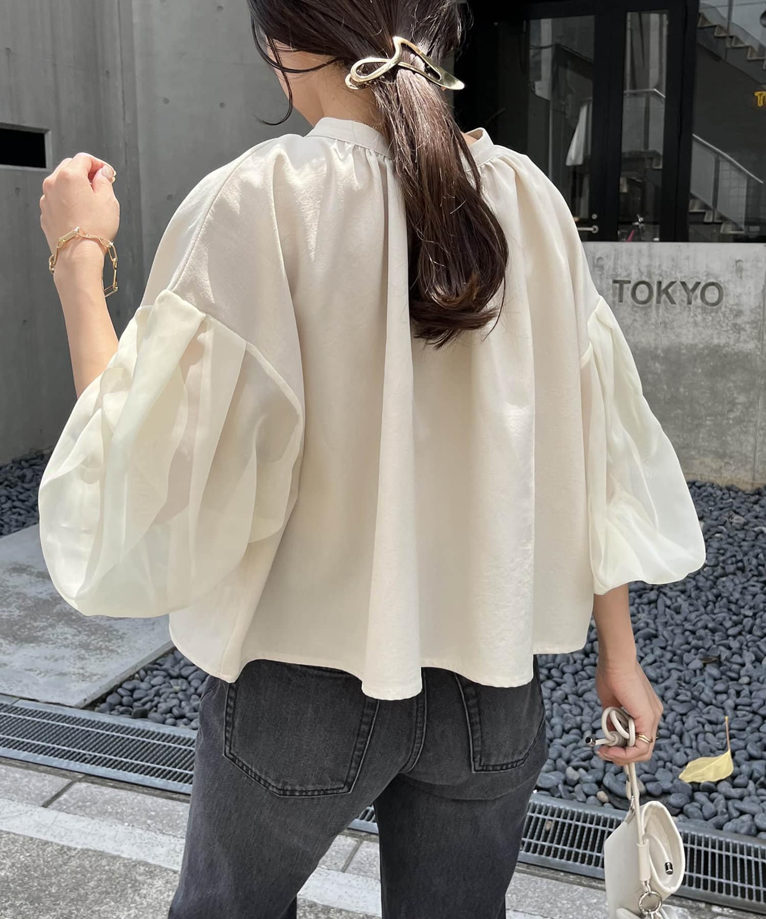 ・ボタンで前開き、裾はボタンなくスリットのようになっていて抜け感あり