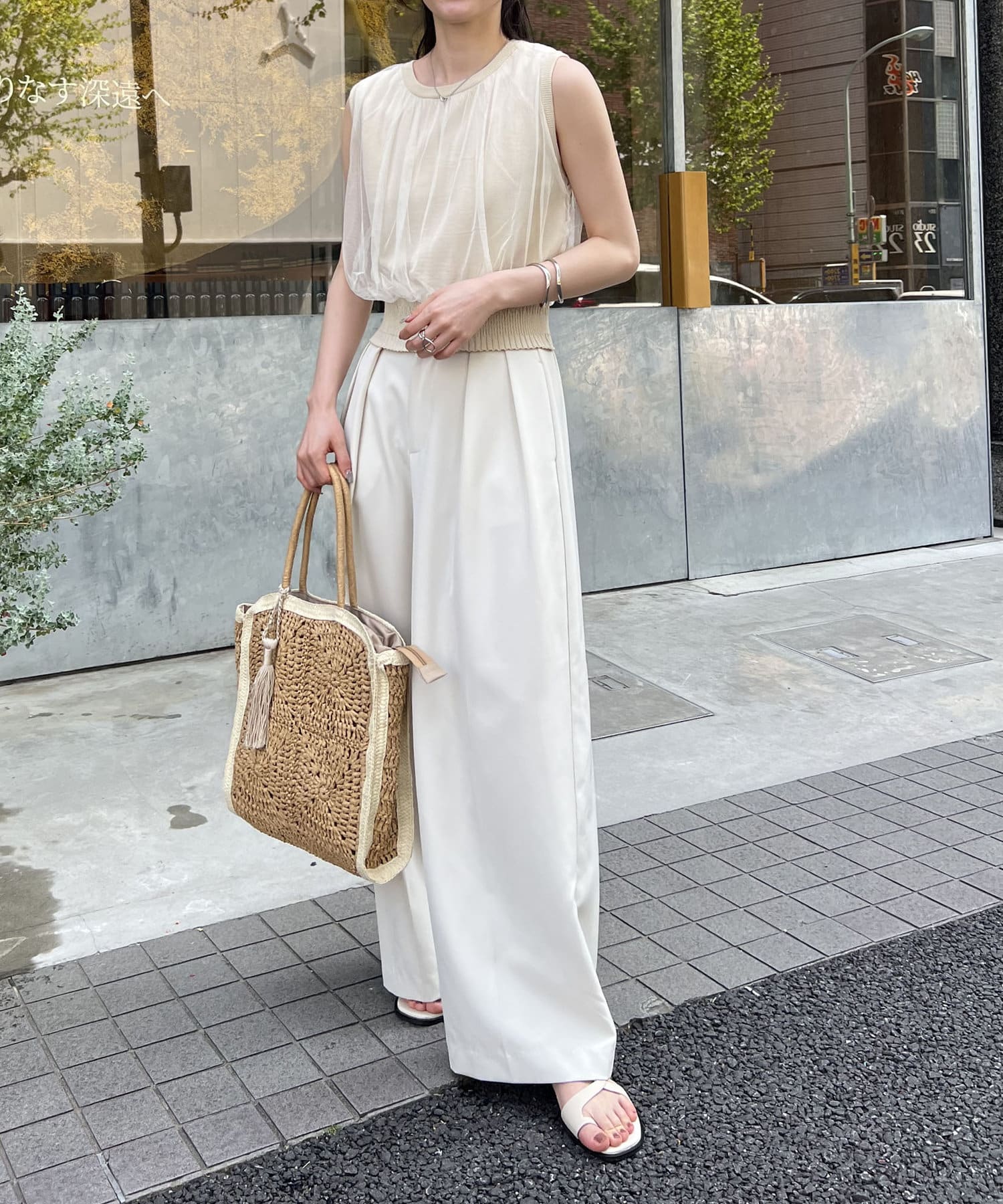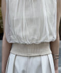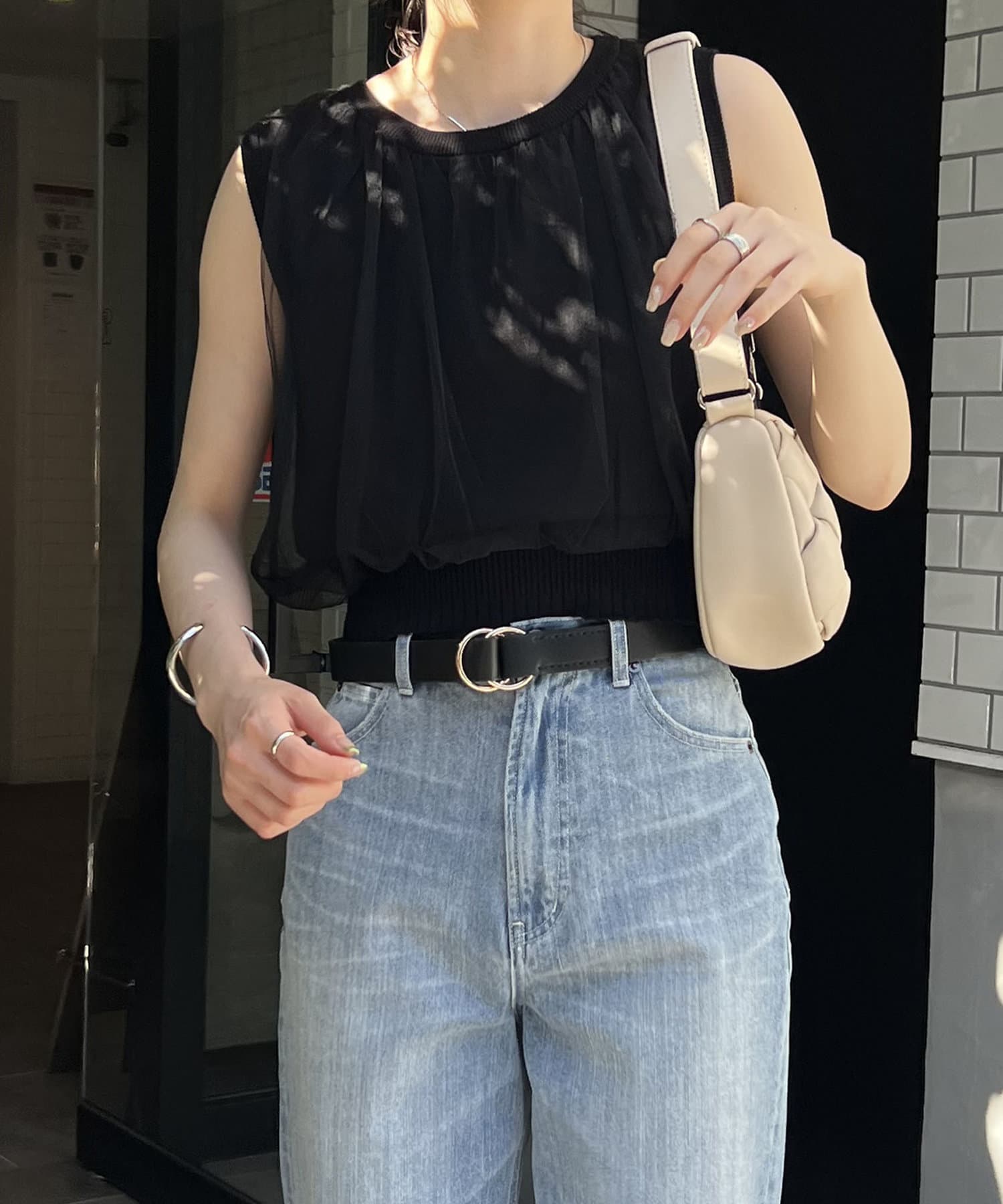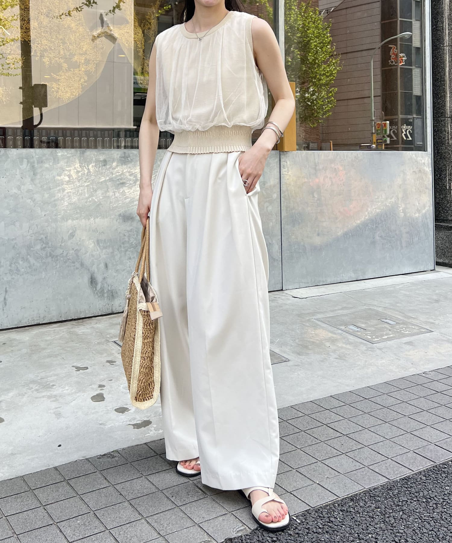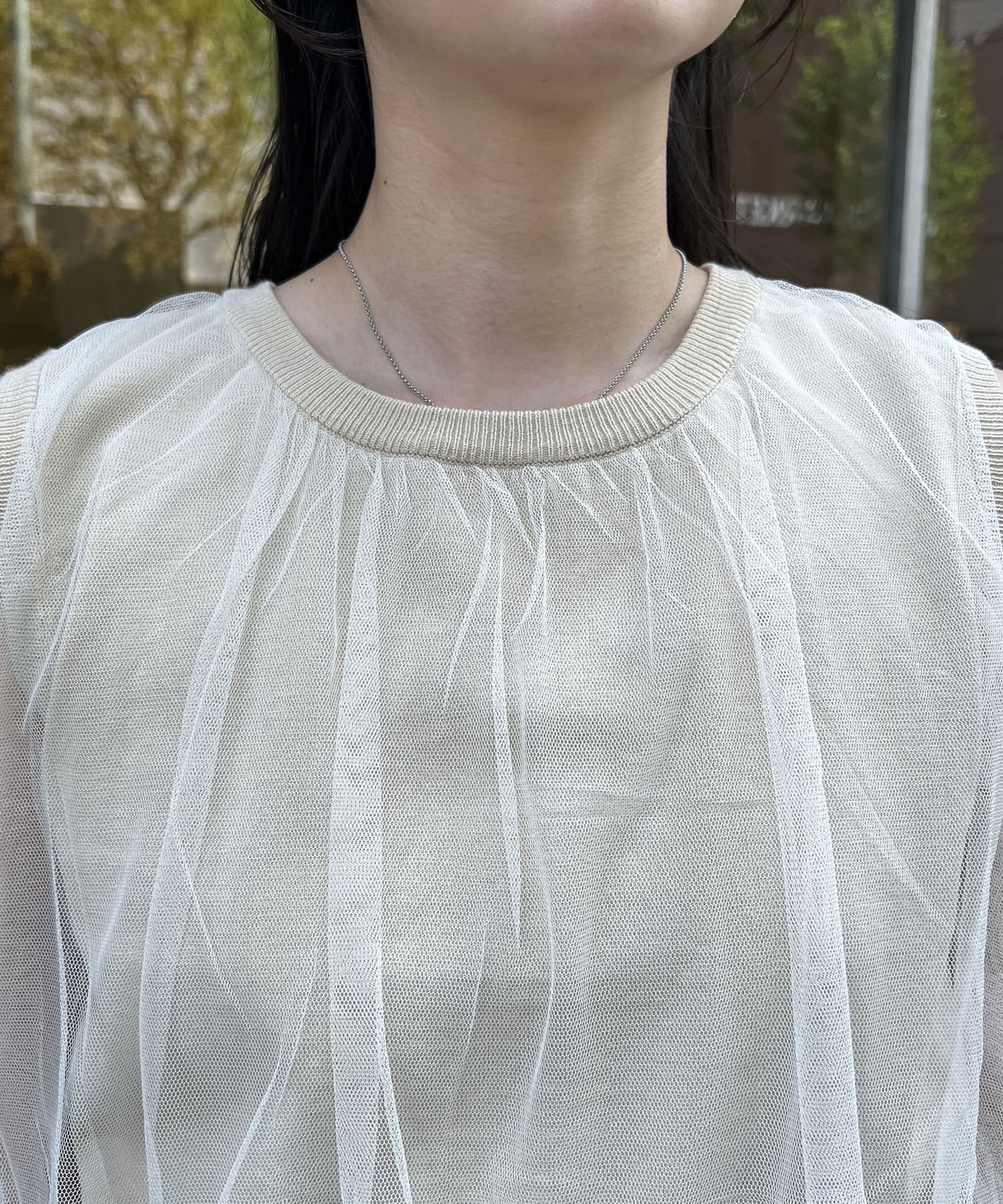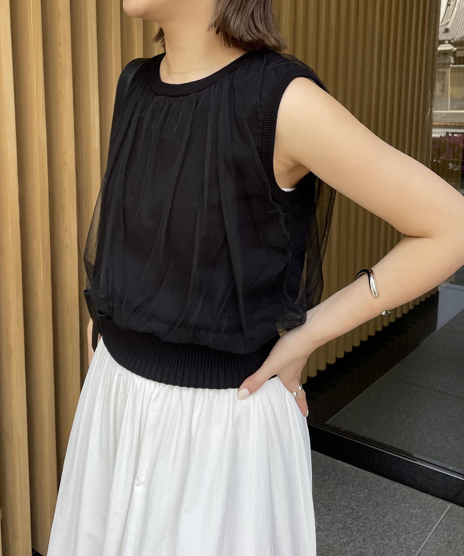 トレンドのチュール素材がニットタンクにレイヤードされたデザイントップス