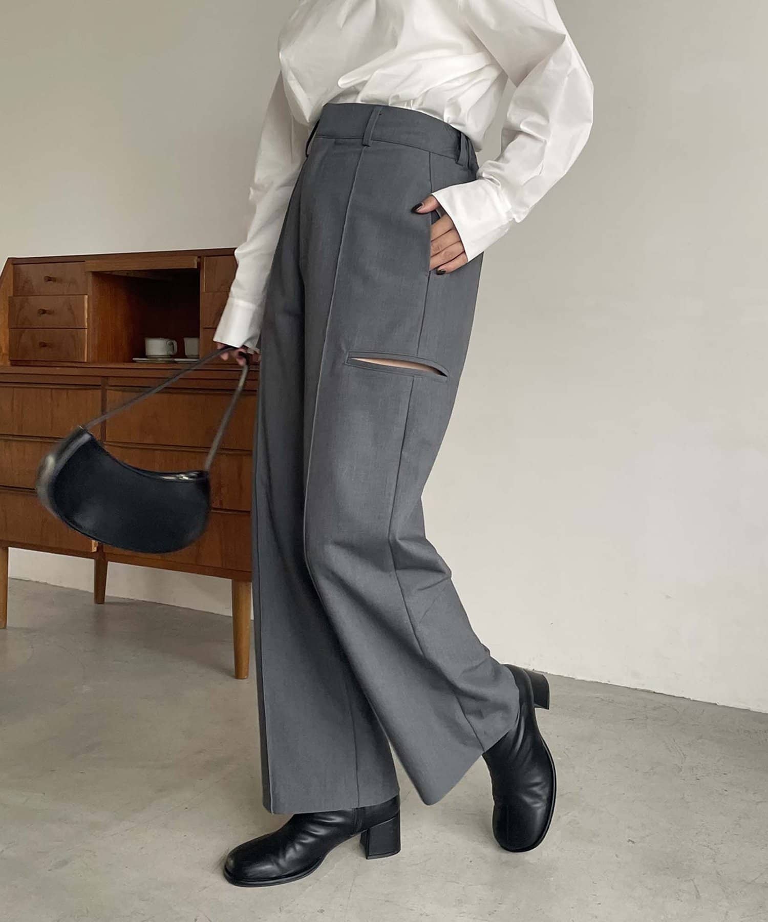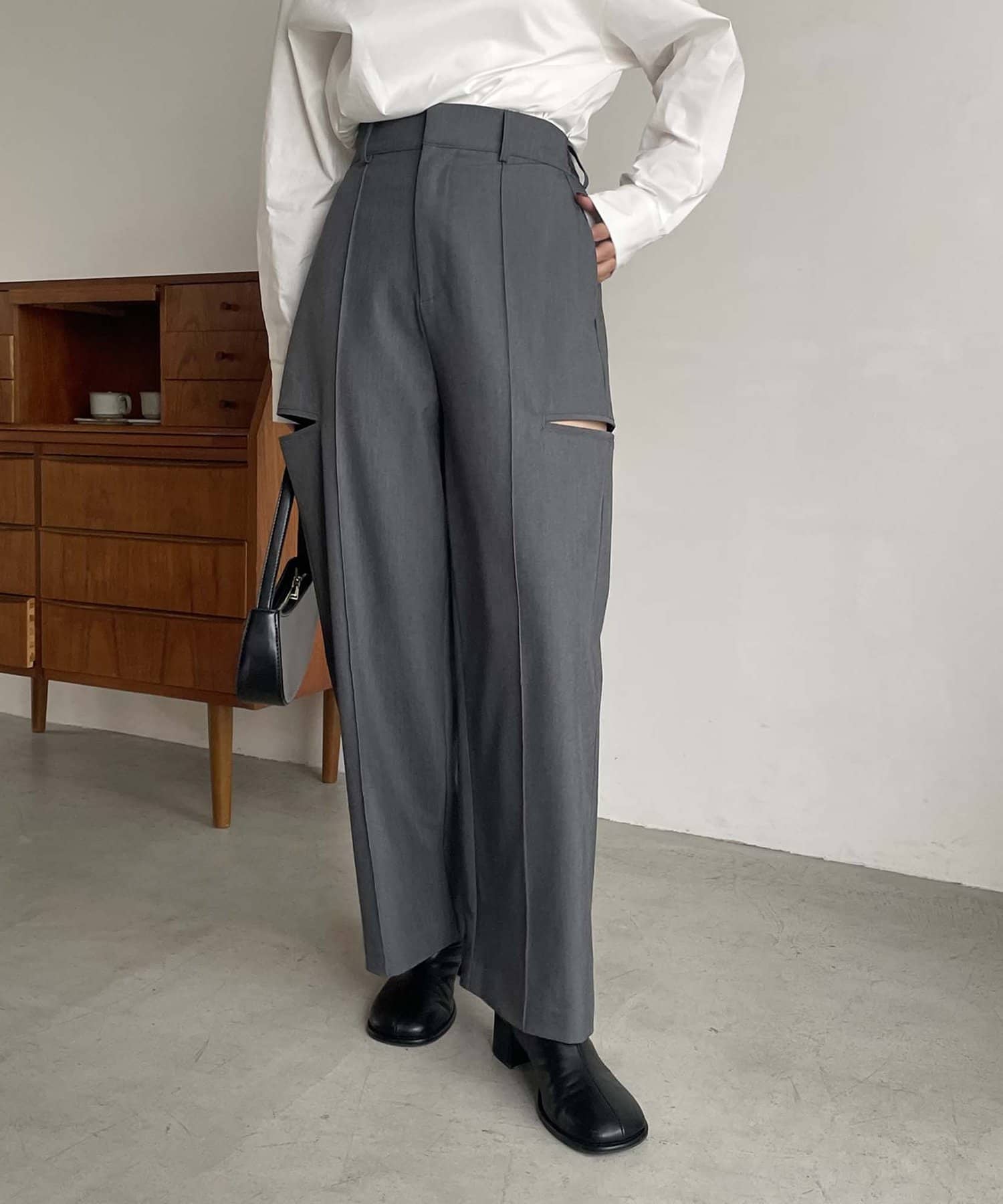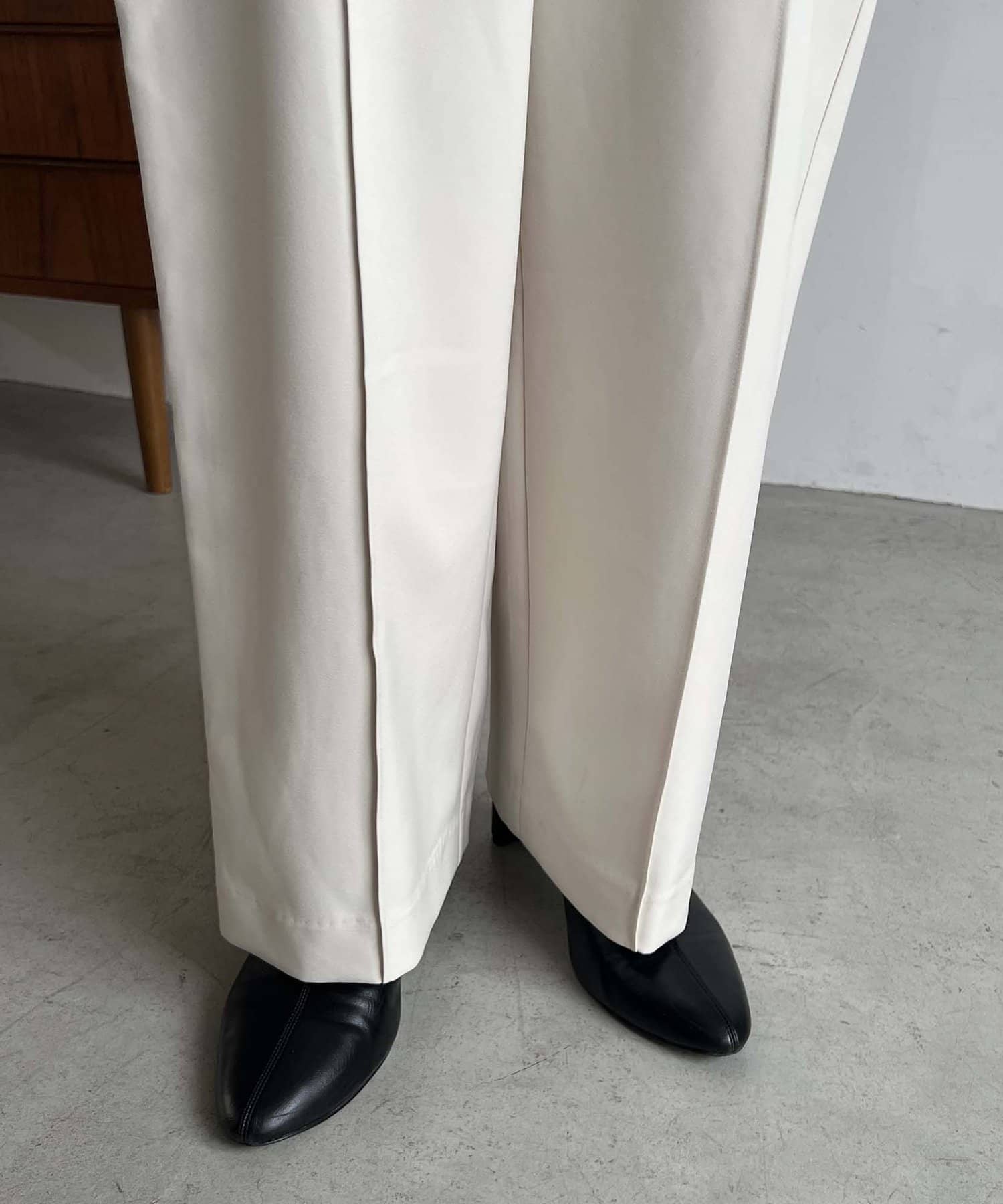 生地感もサラッとしてスリットもさり気なく入ってて、落ち感も縦に入ってる折り目も足がめちゃくちゃ綺麗に見えるお洒落なパンツで形も百点です🥰
