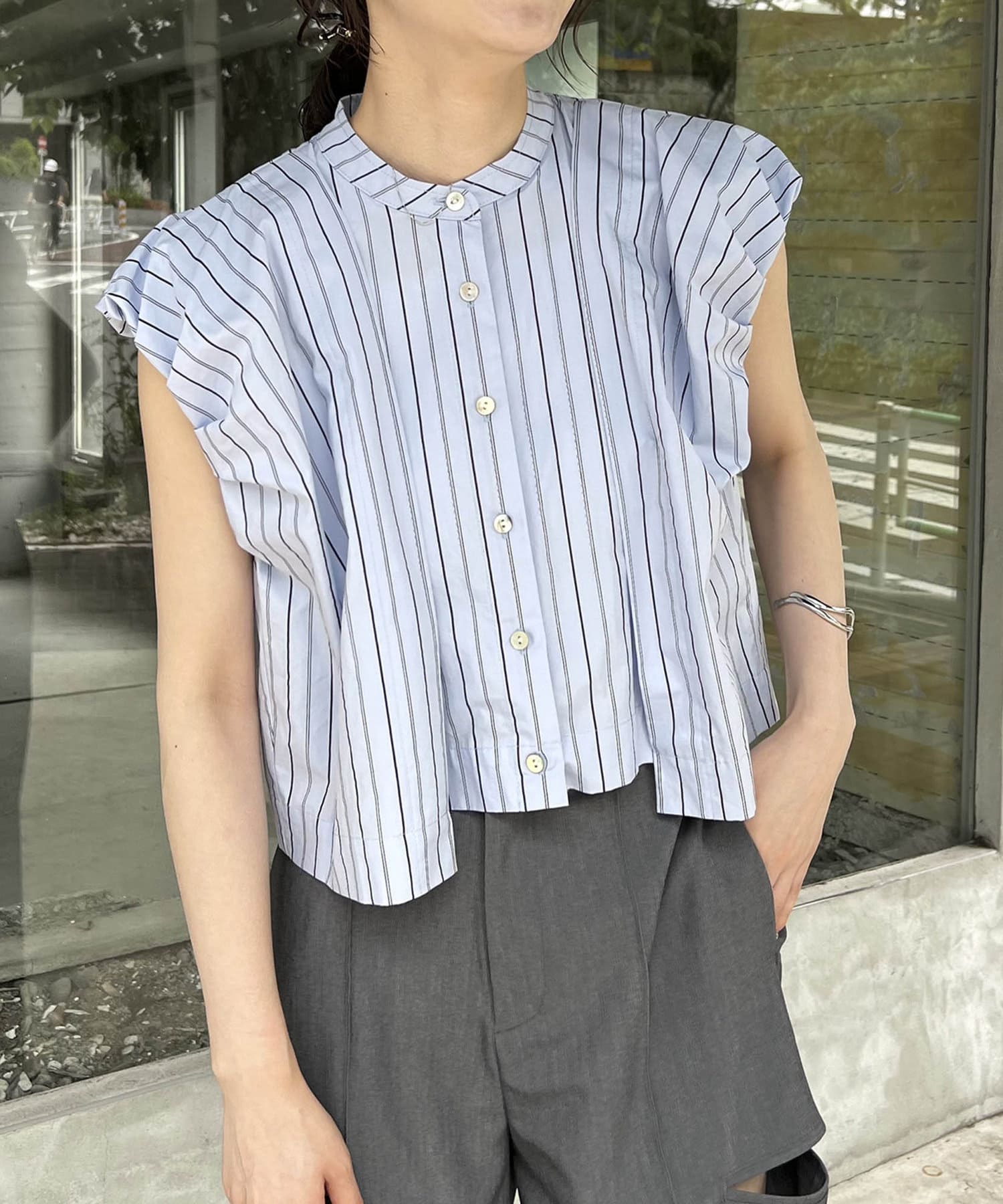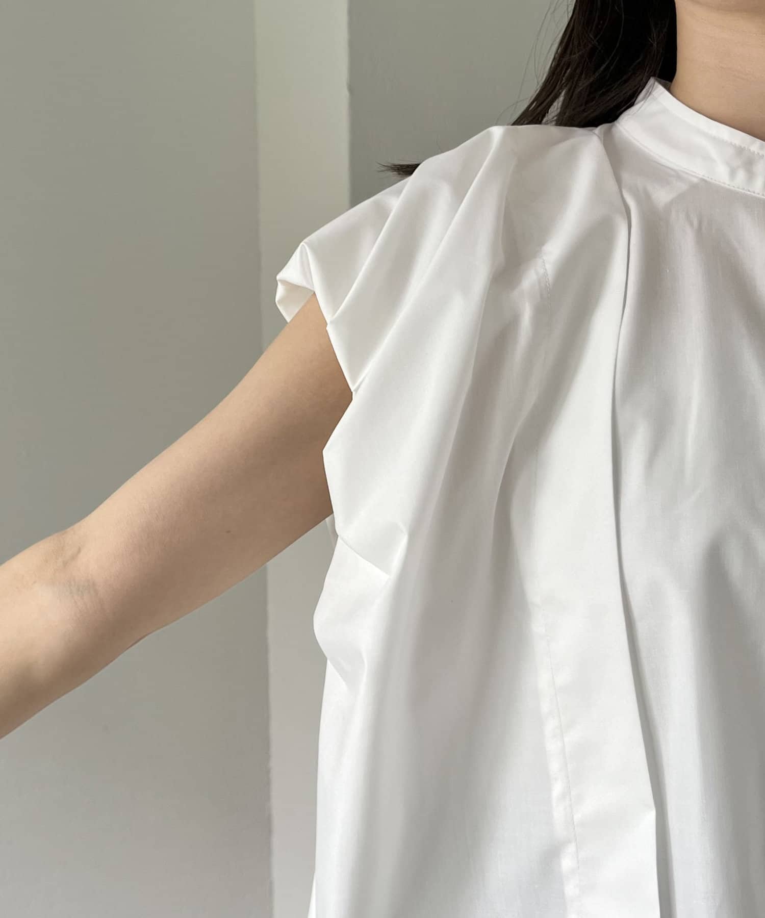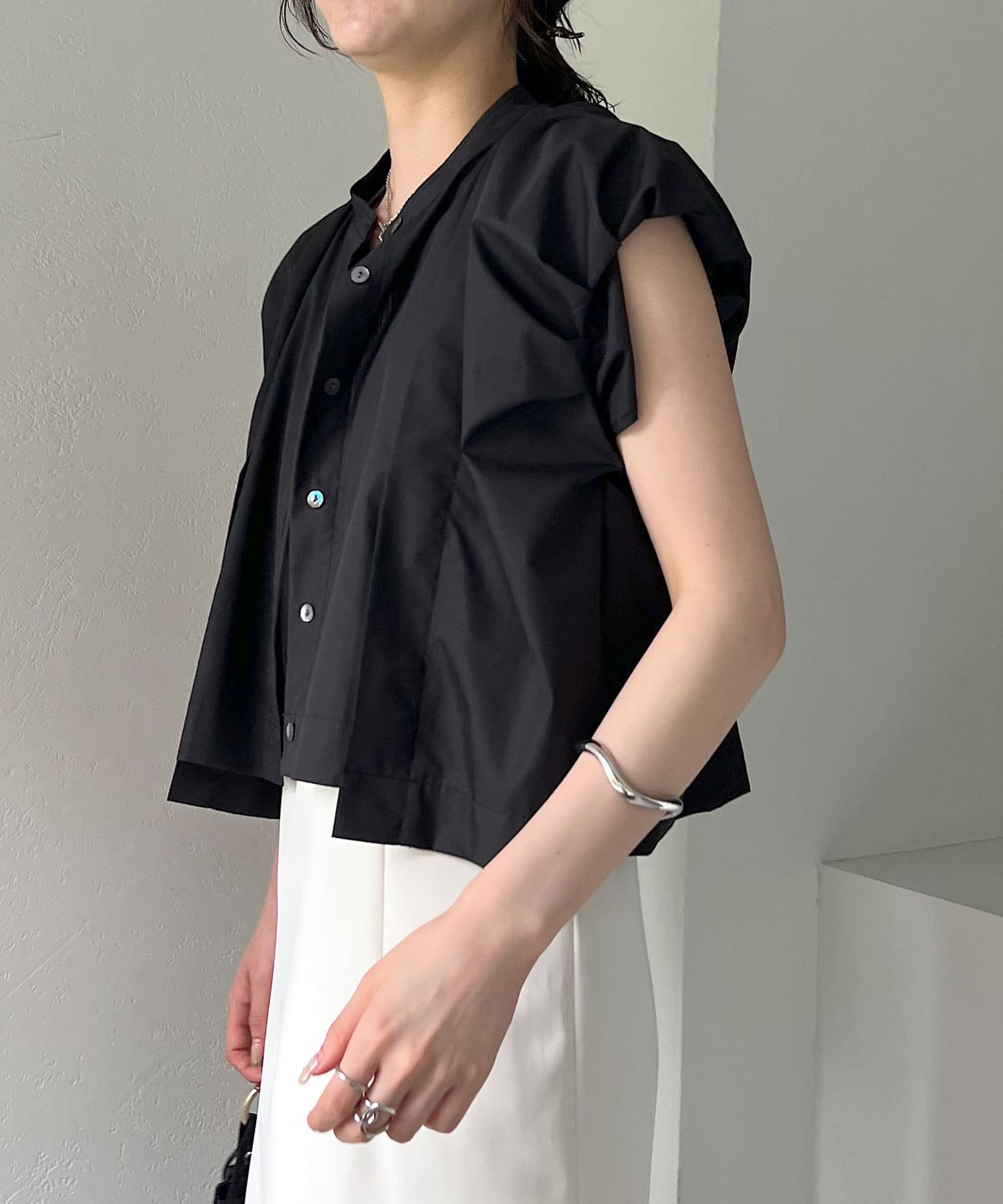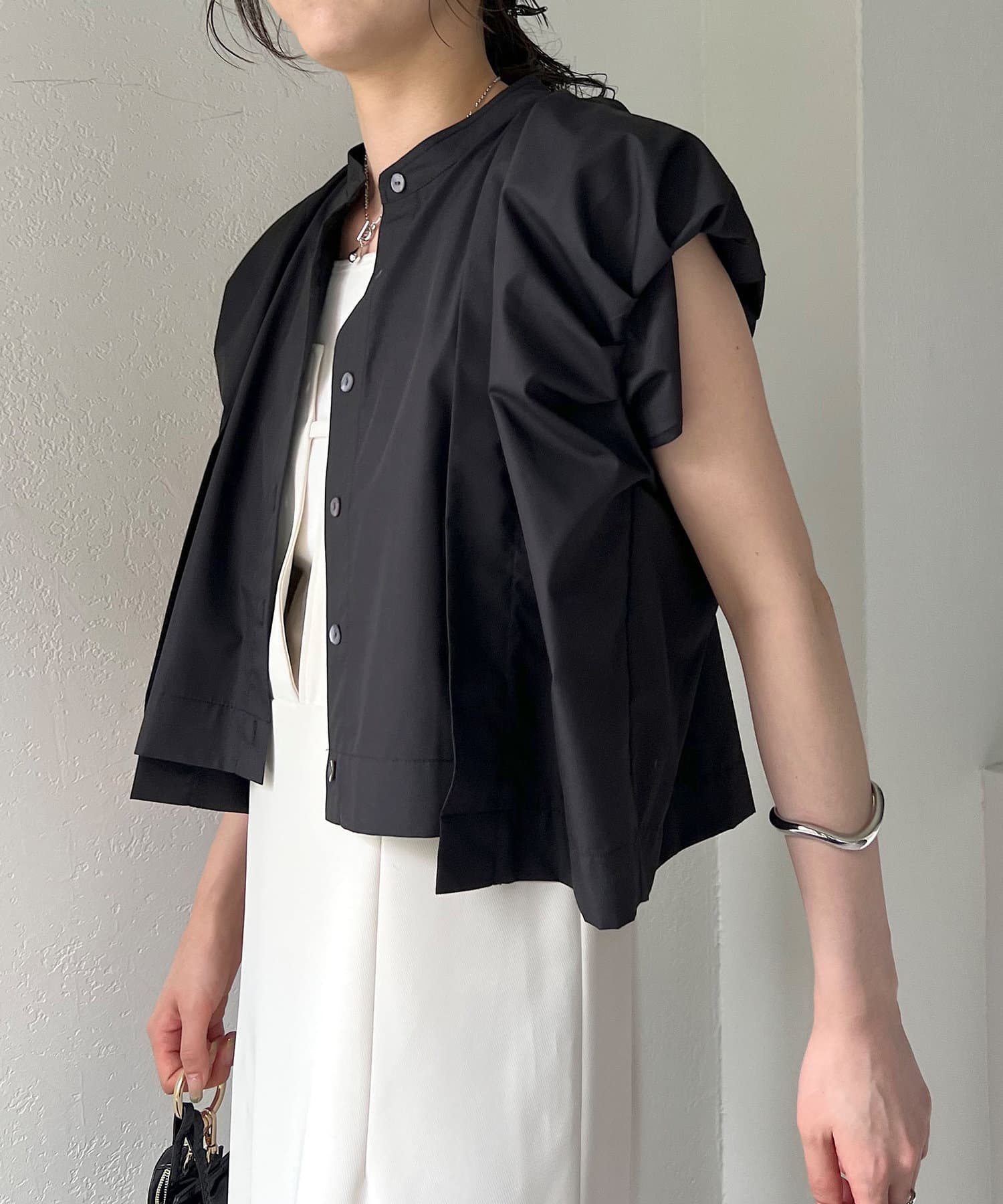 ・二の腕に少しかかるくらいのバルーン袖が特徴のシャツ