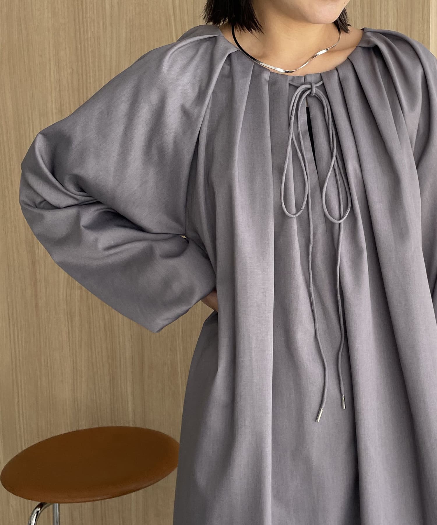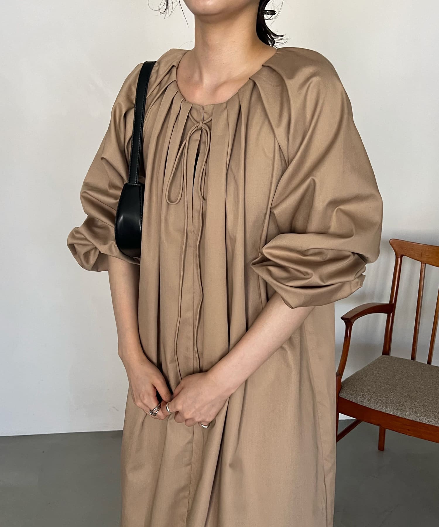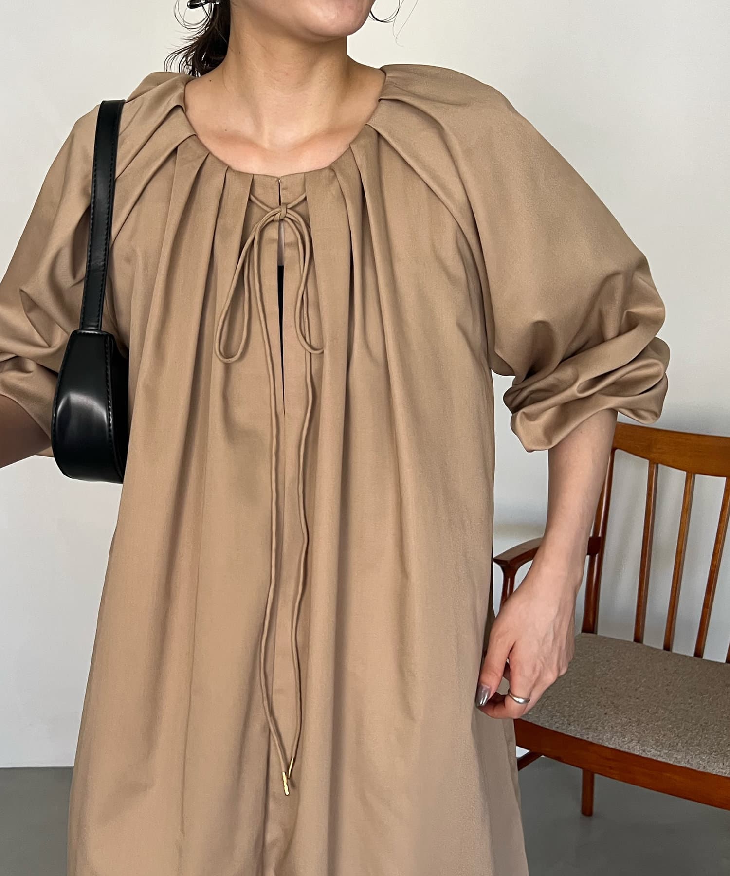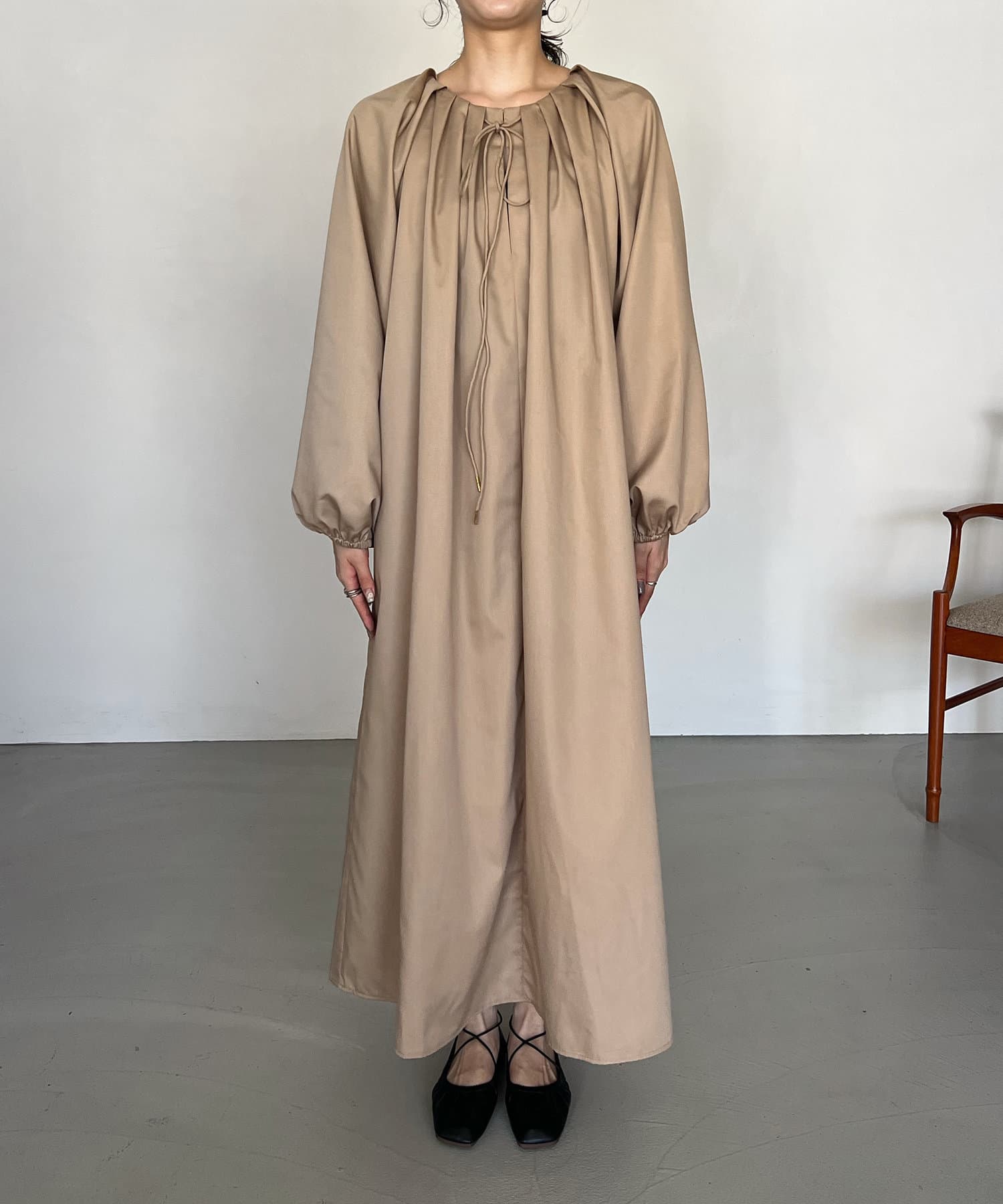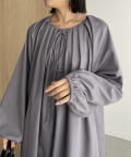 首回りにタックのデザインが施された立体感のあるワンピース