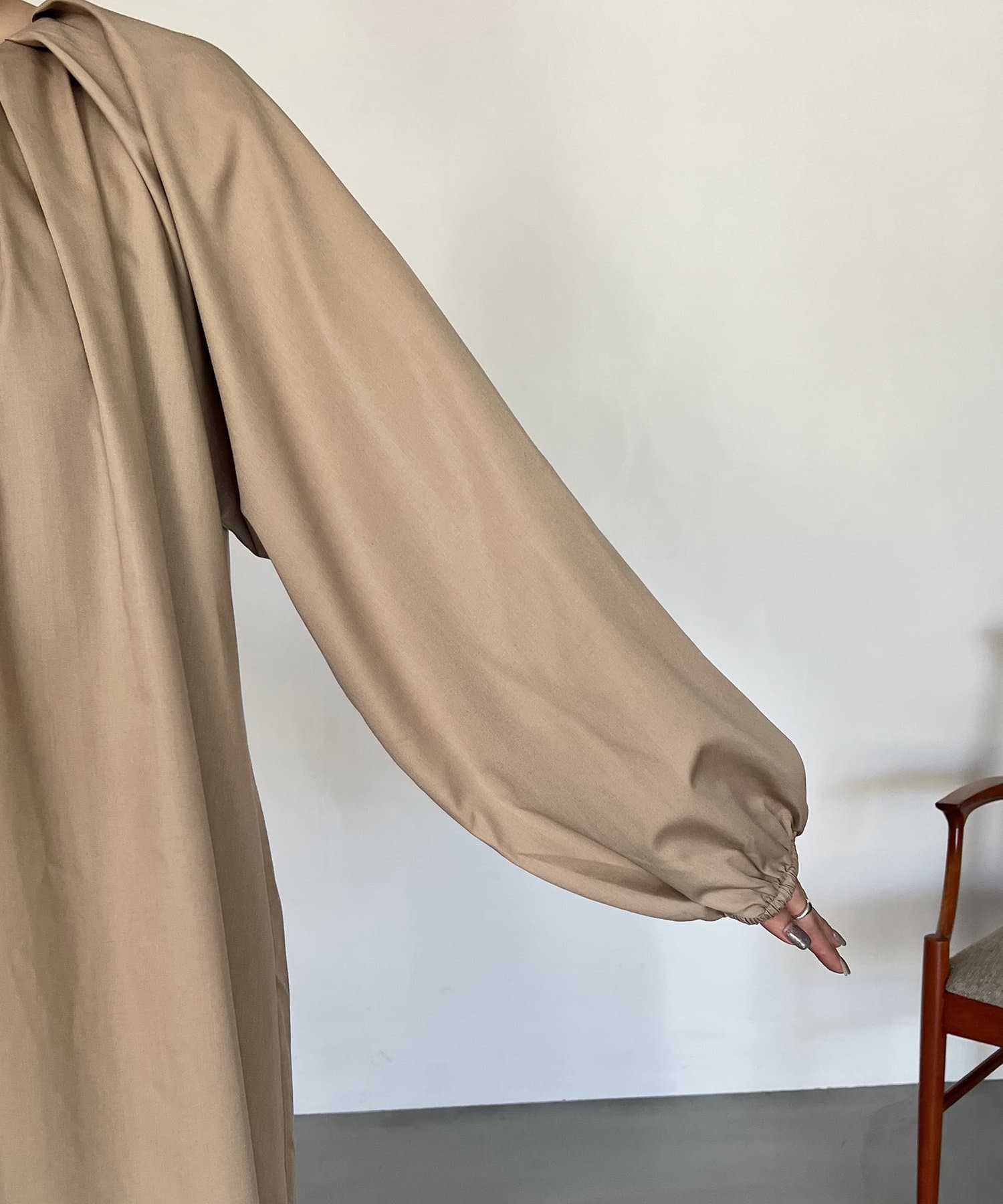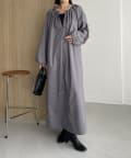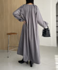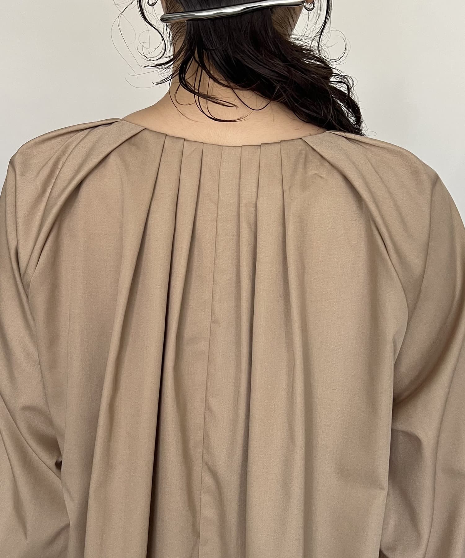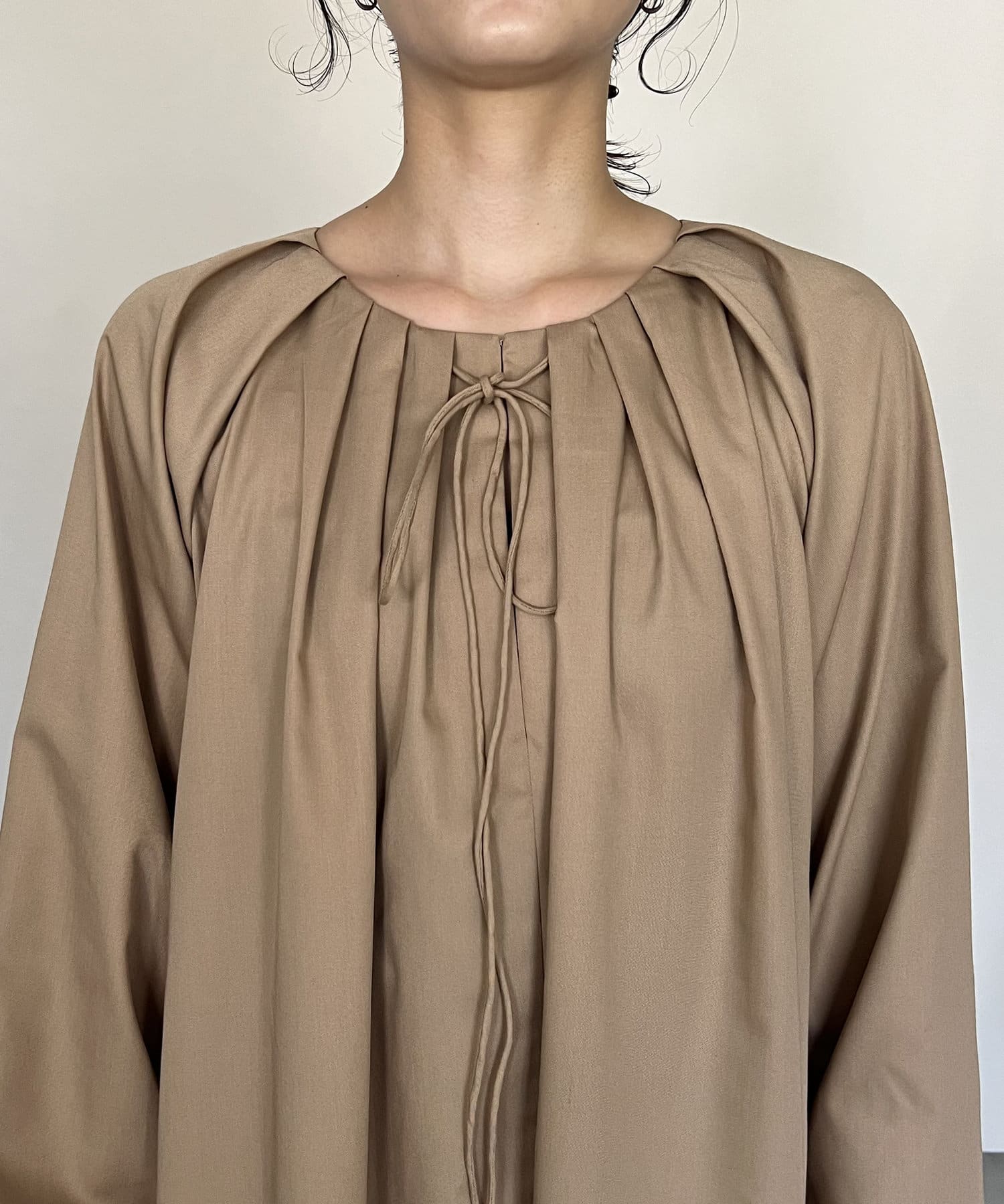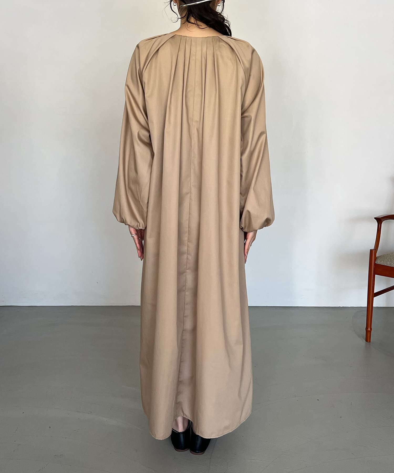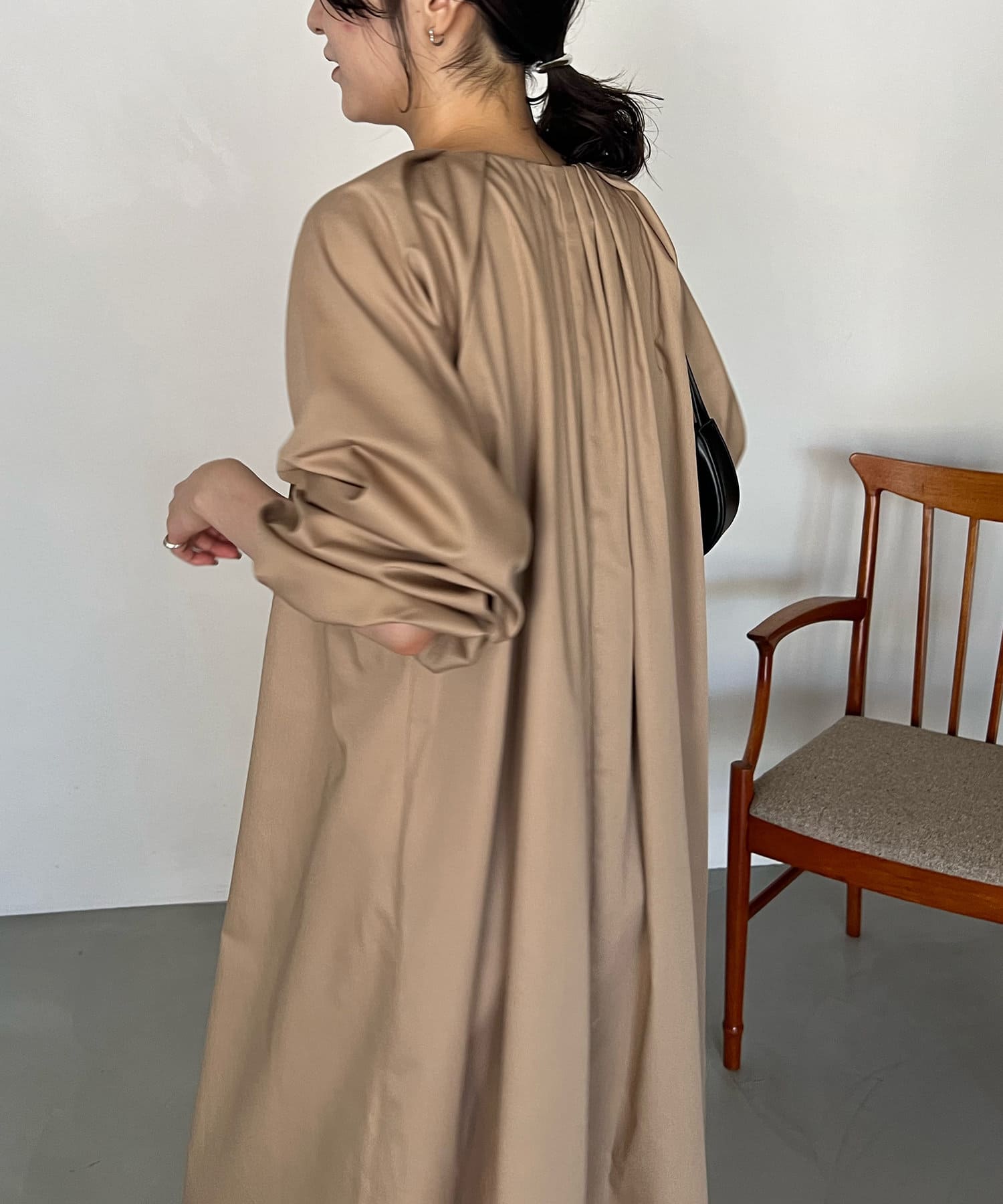 首回りにタックのデザインが施された立体感のあるワンピース