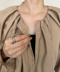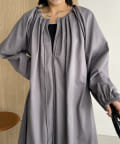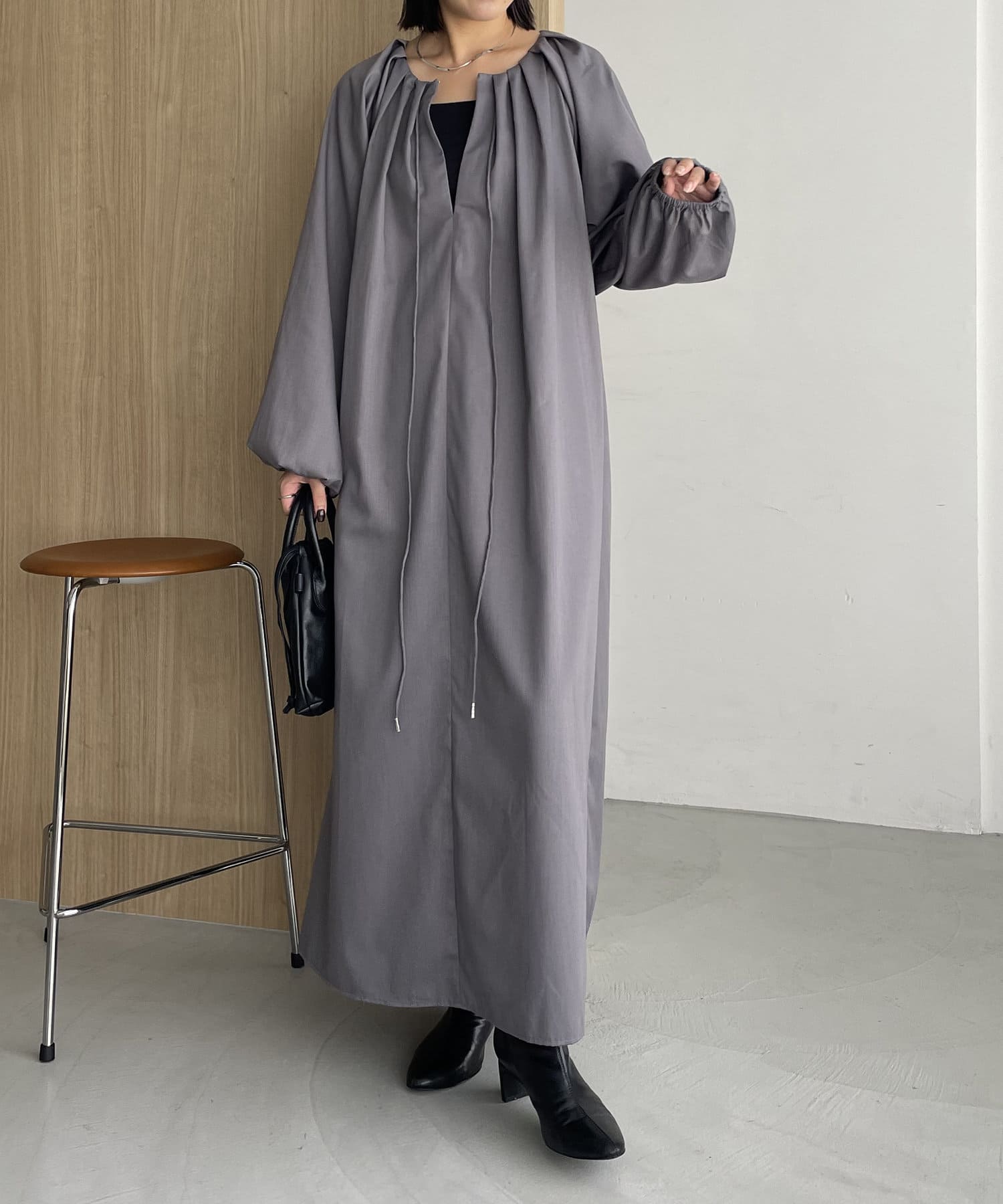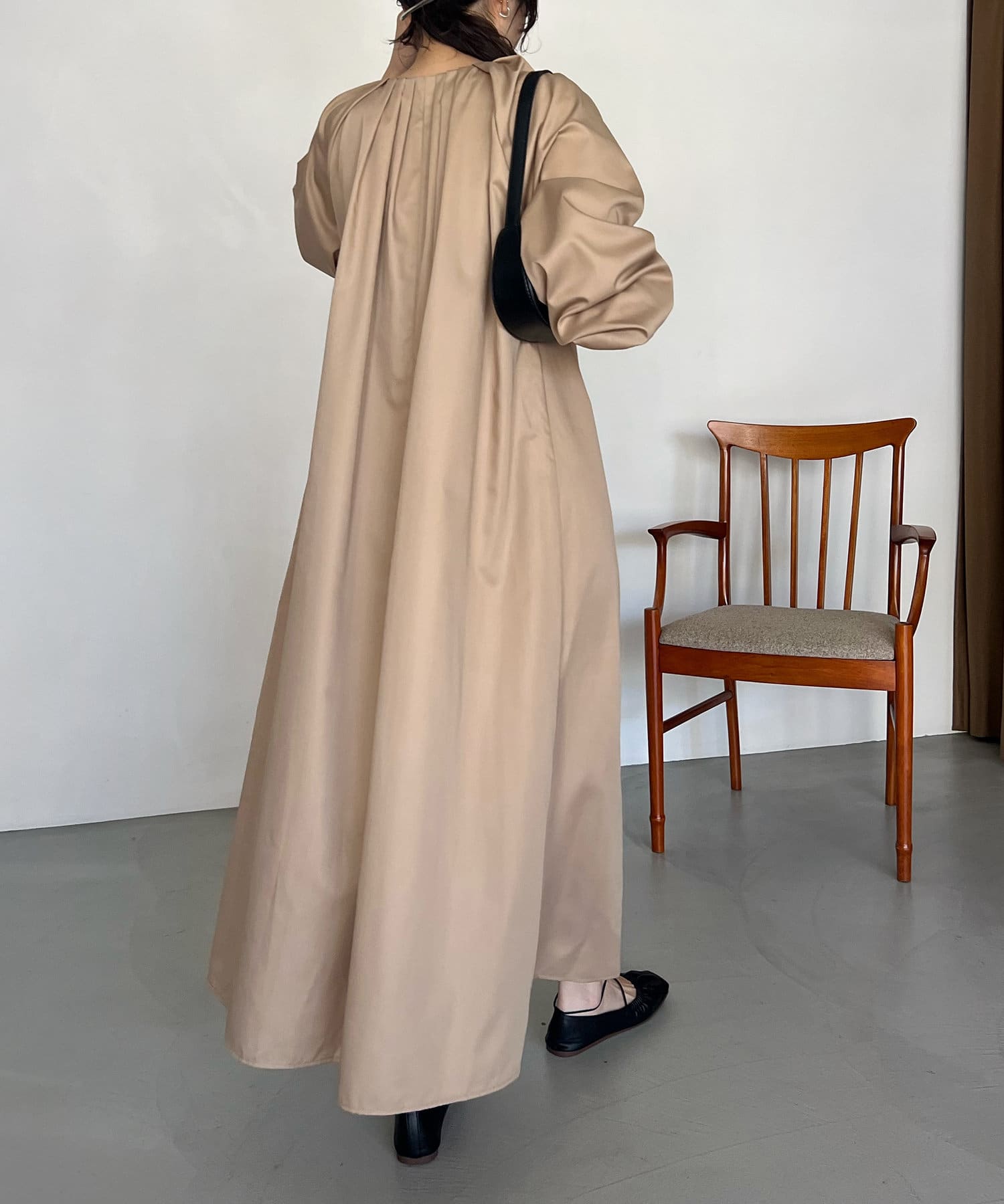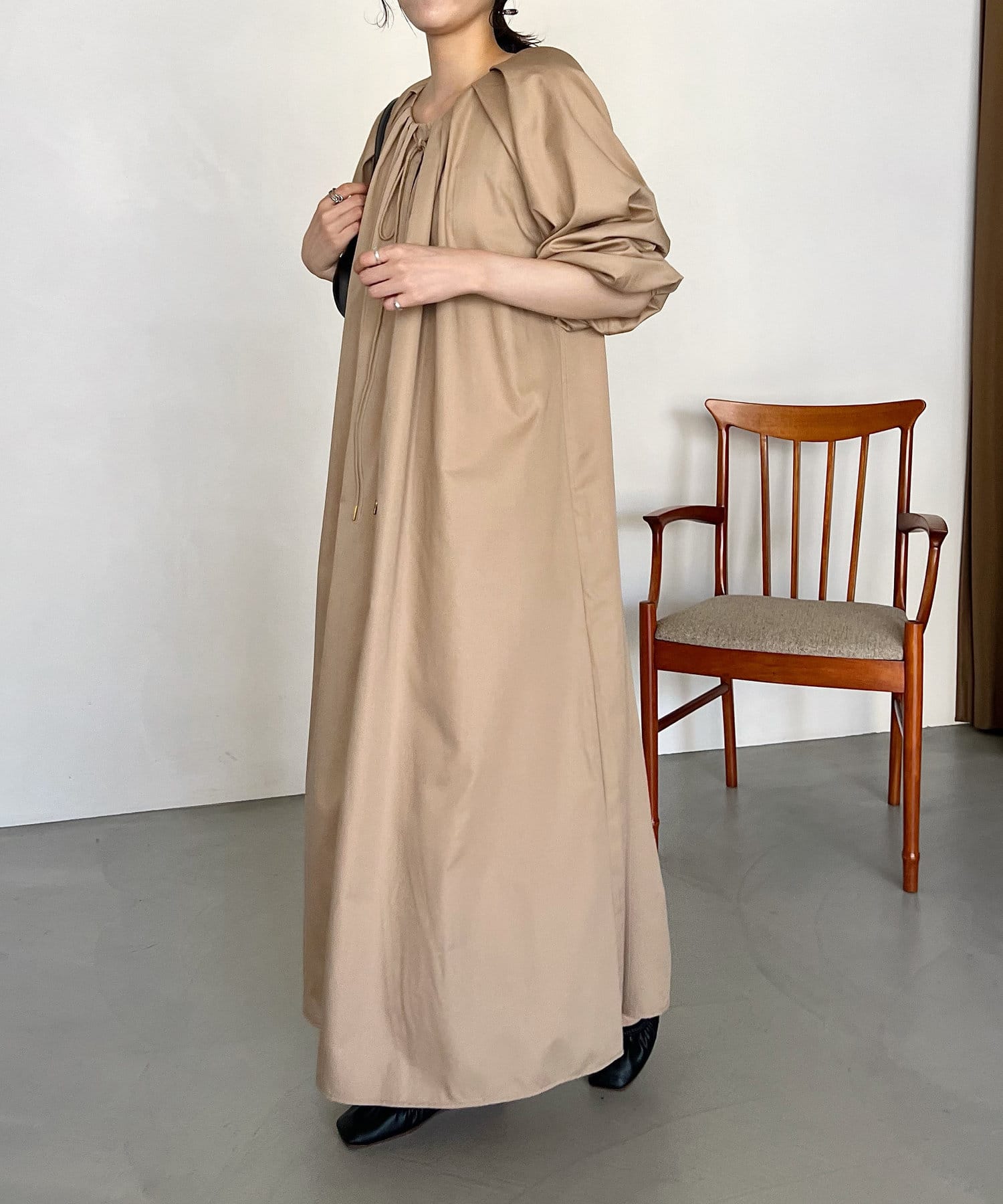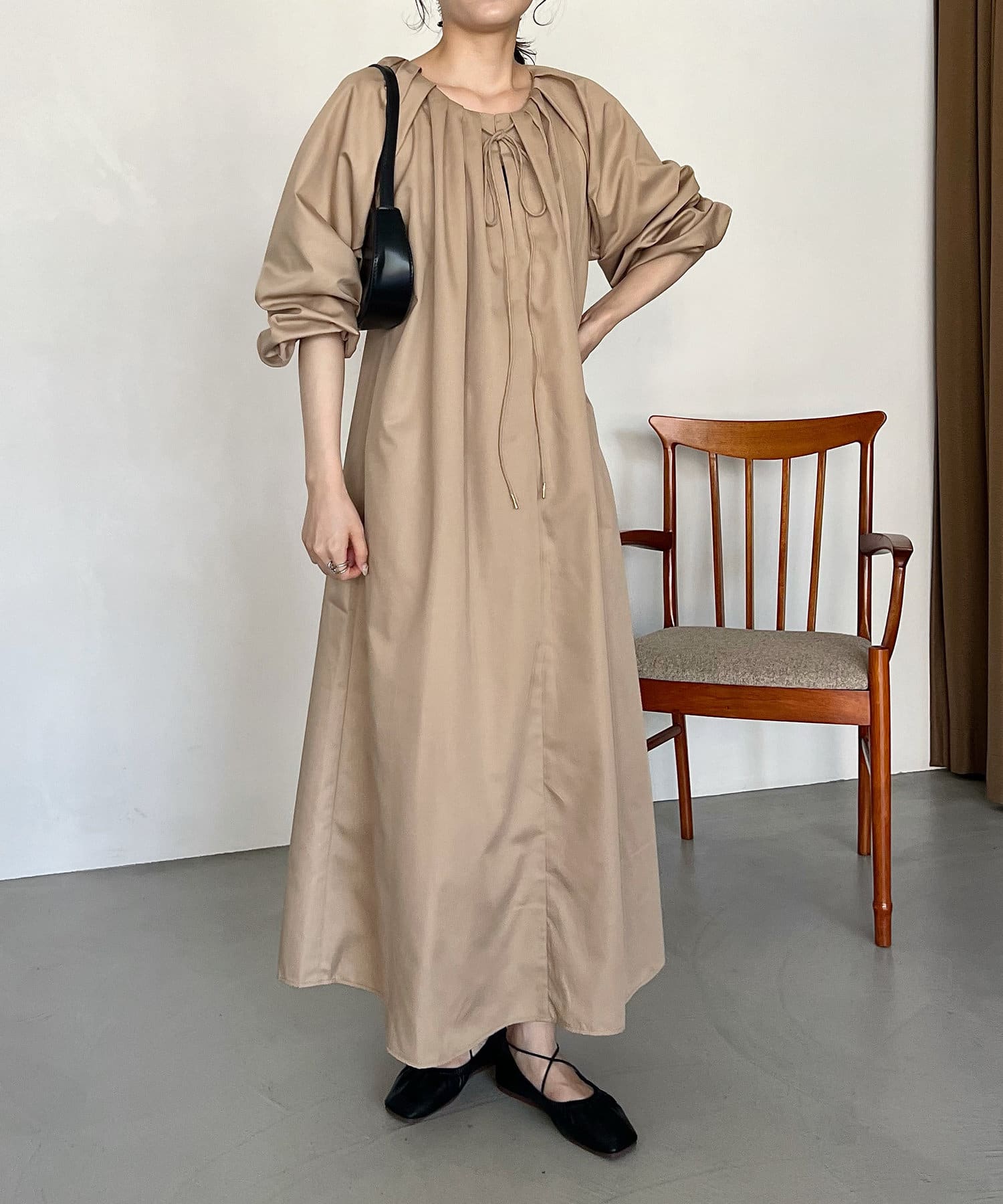 首回りにタックのデザインが施された立体感のあるワンピース