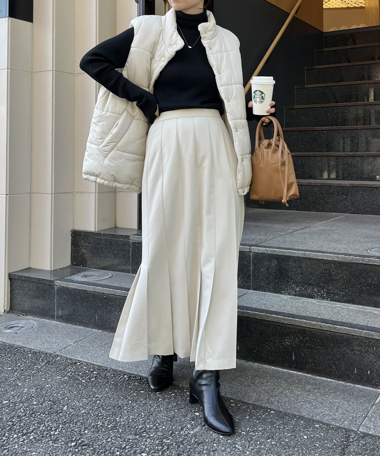 ・リブニットを合わせて大人っぽく