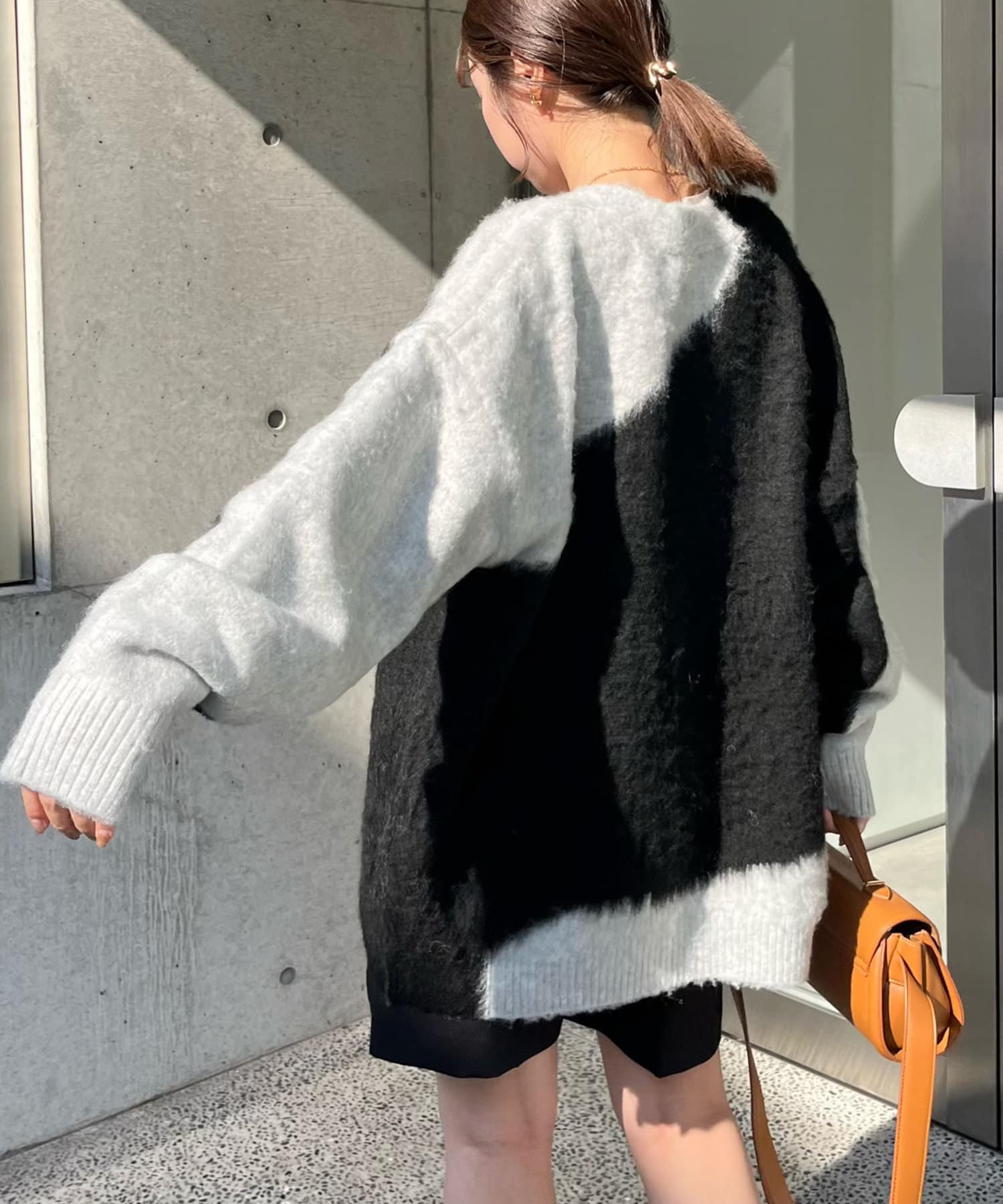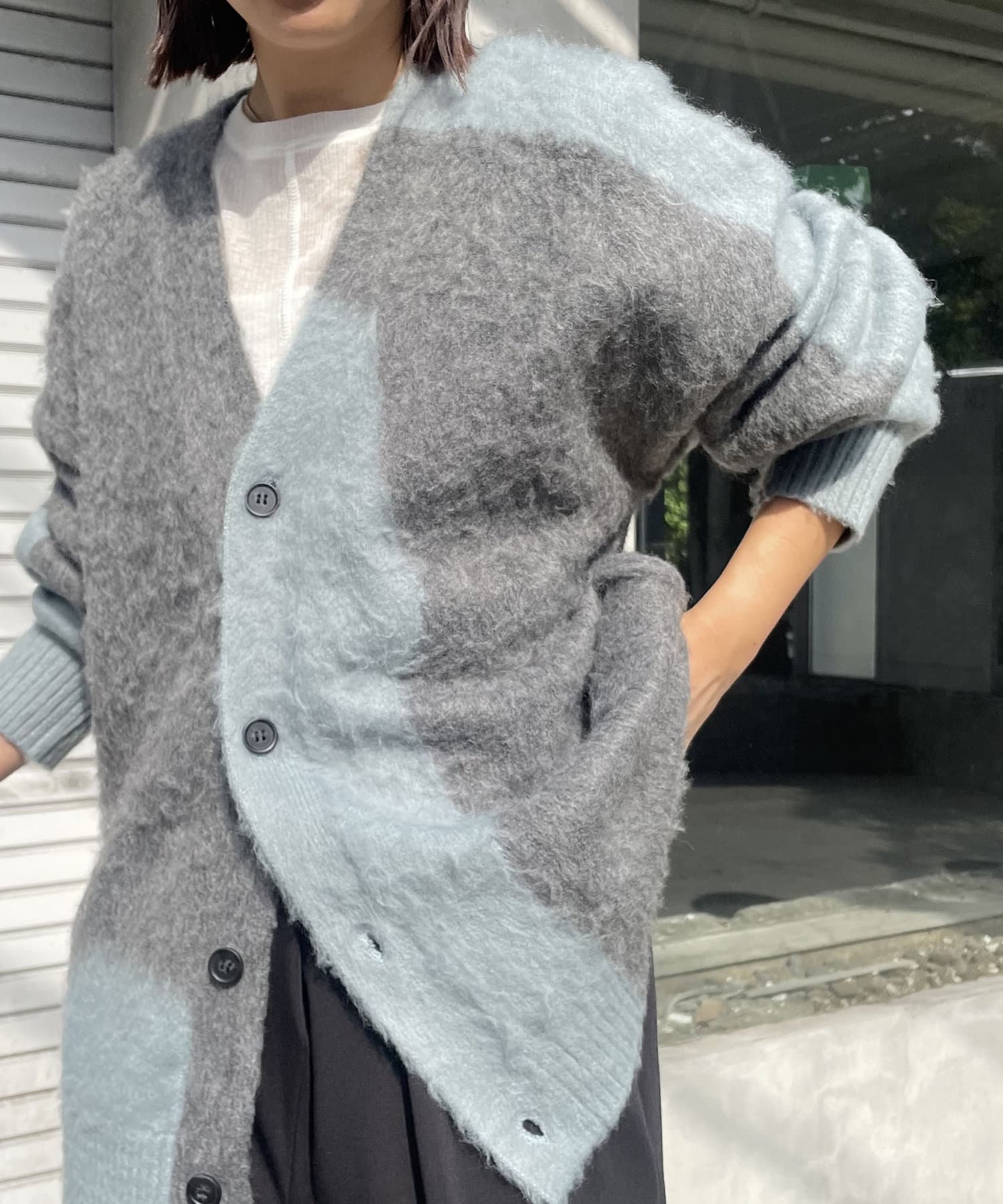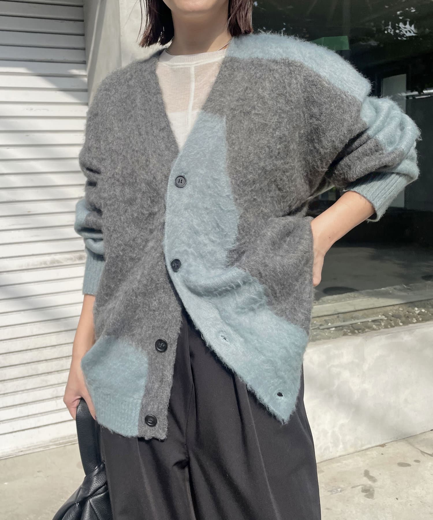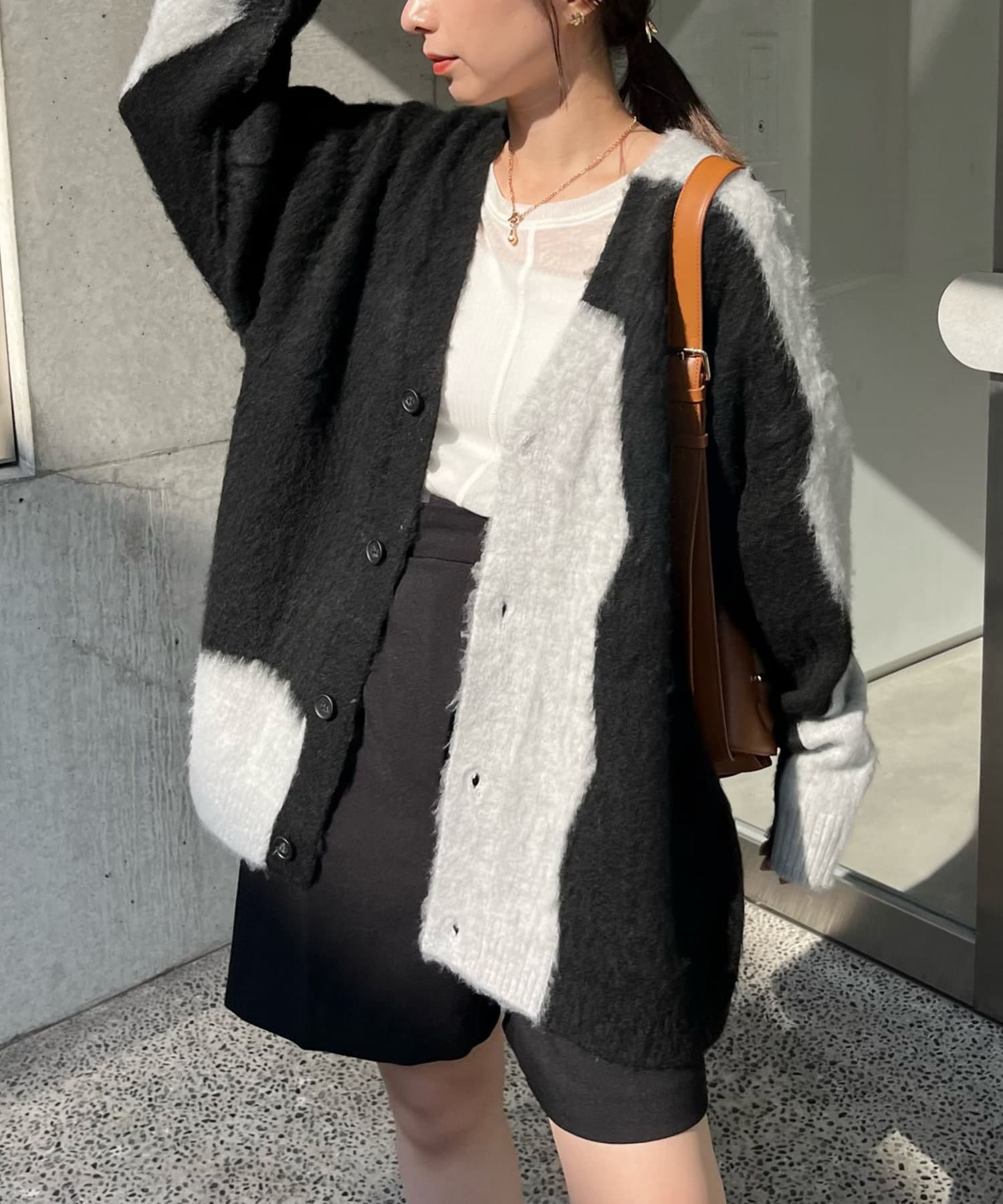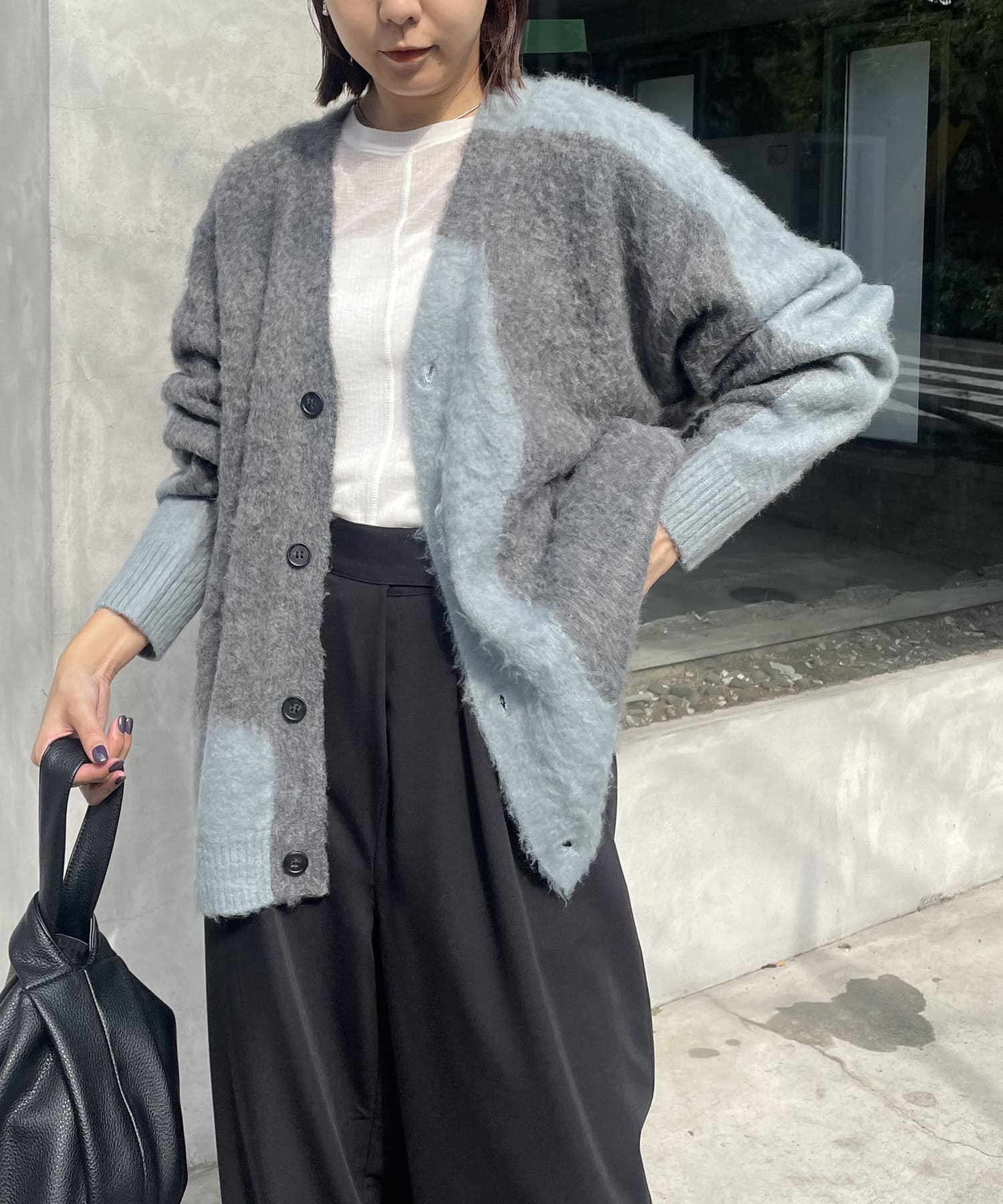 ・ニュアンス感のあるカーブラインで配色に編みたてた主役級カーデ