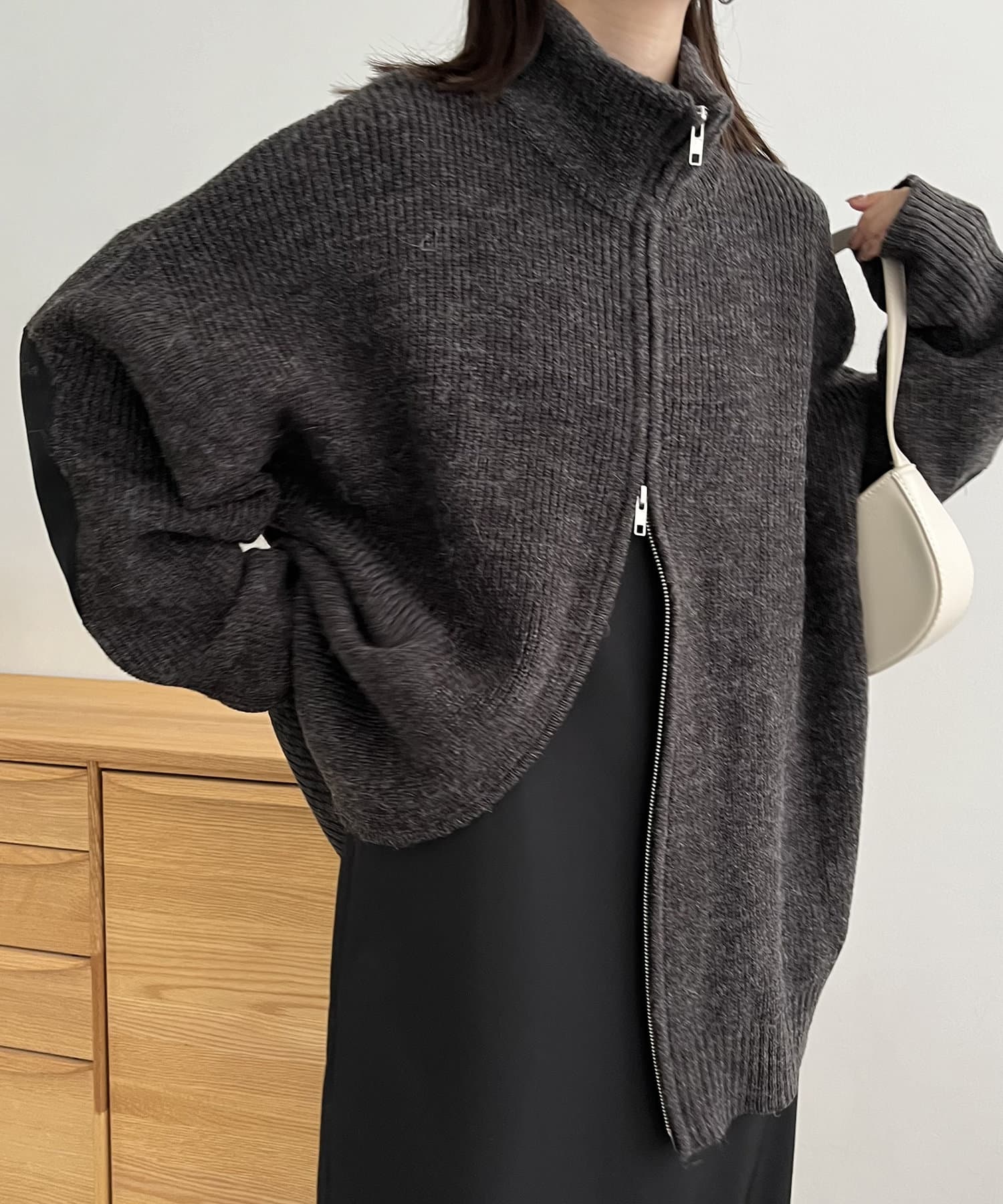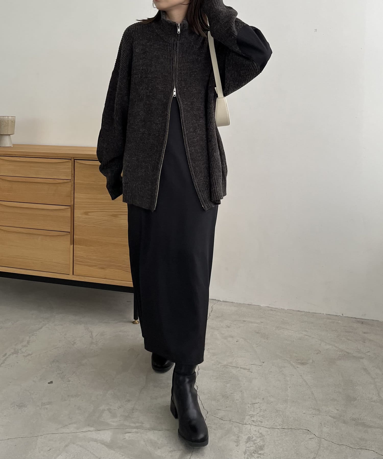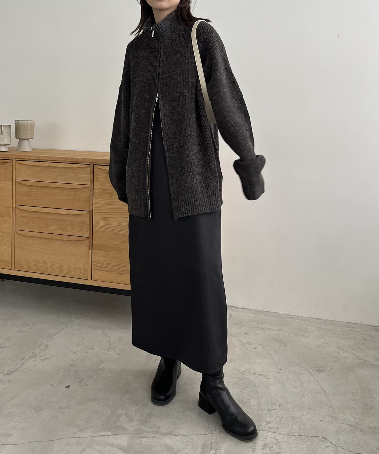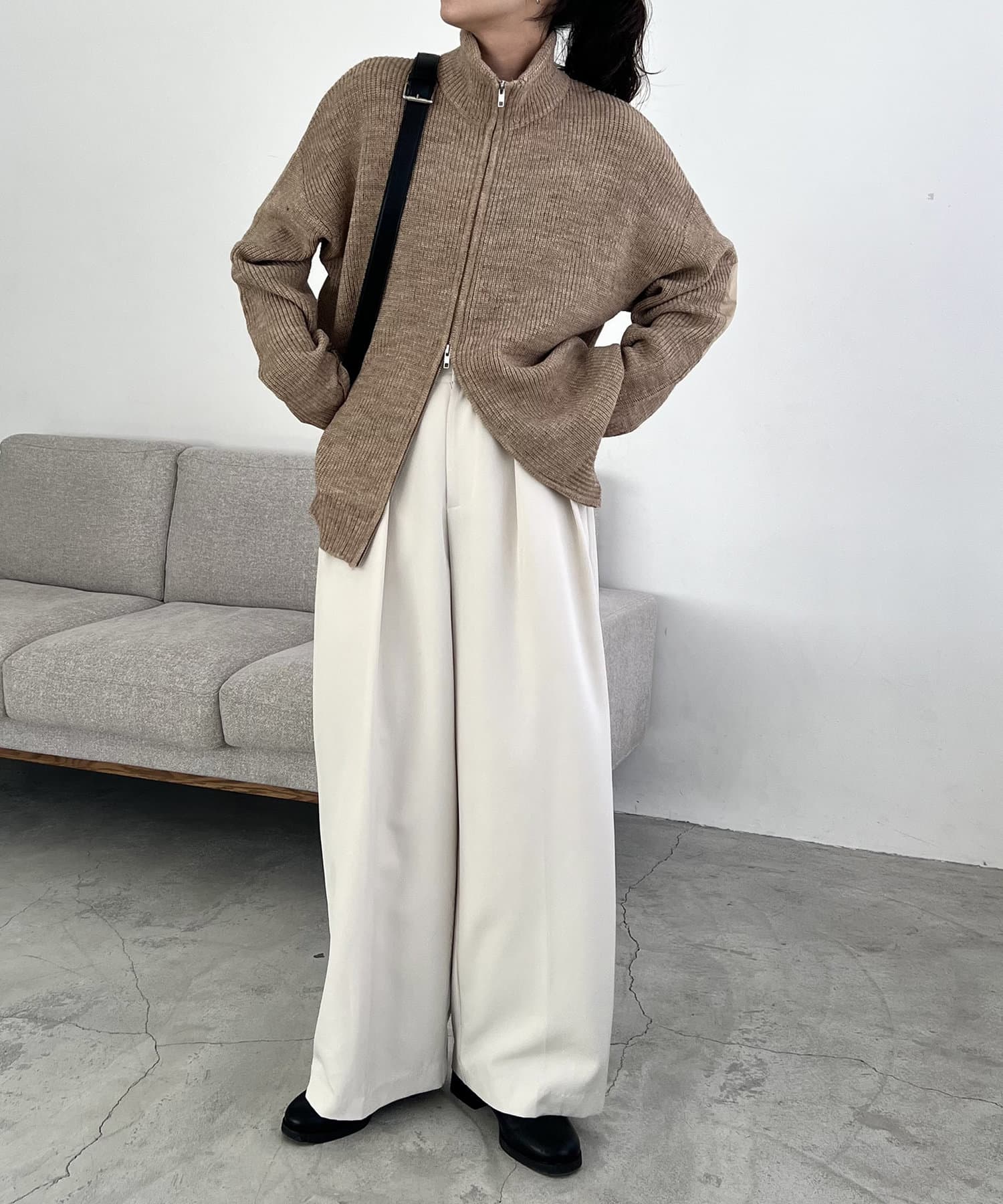 ・裾のジップを開けてワイドパンツに合わせるのがおすすめ