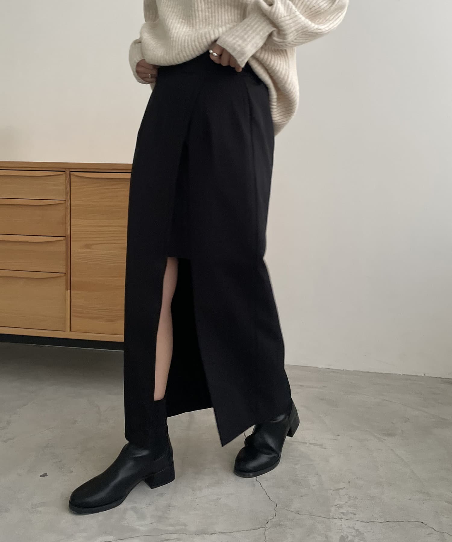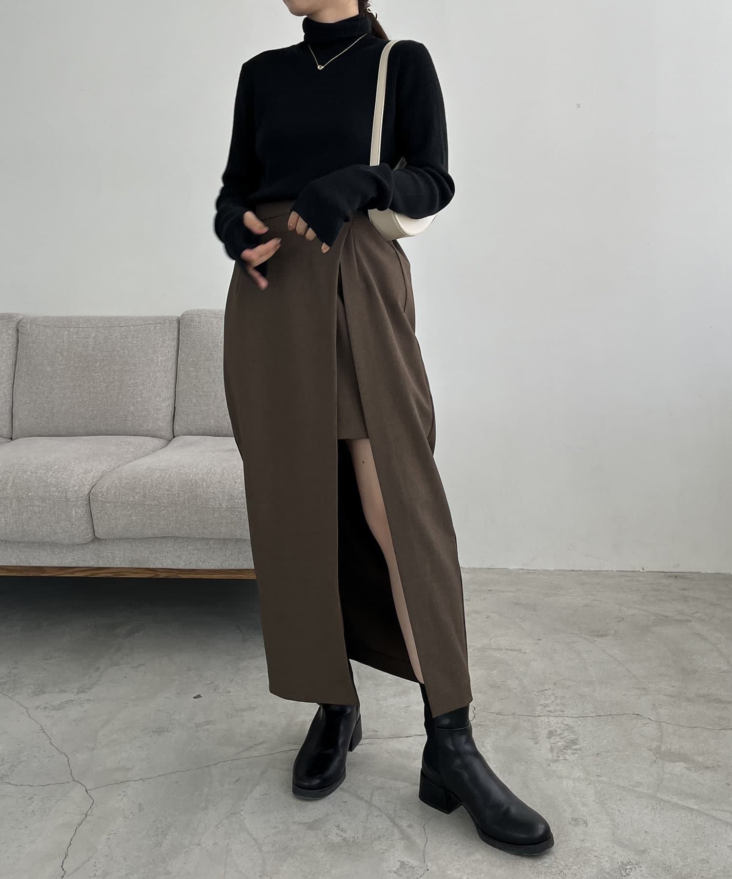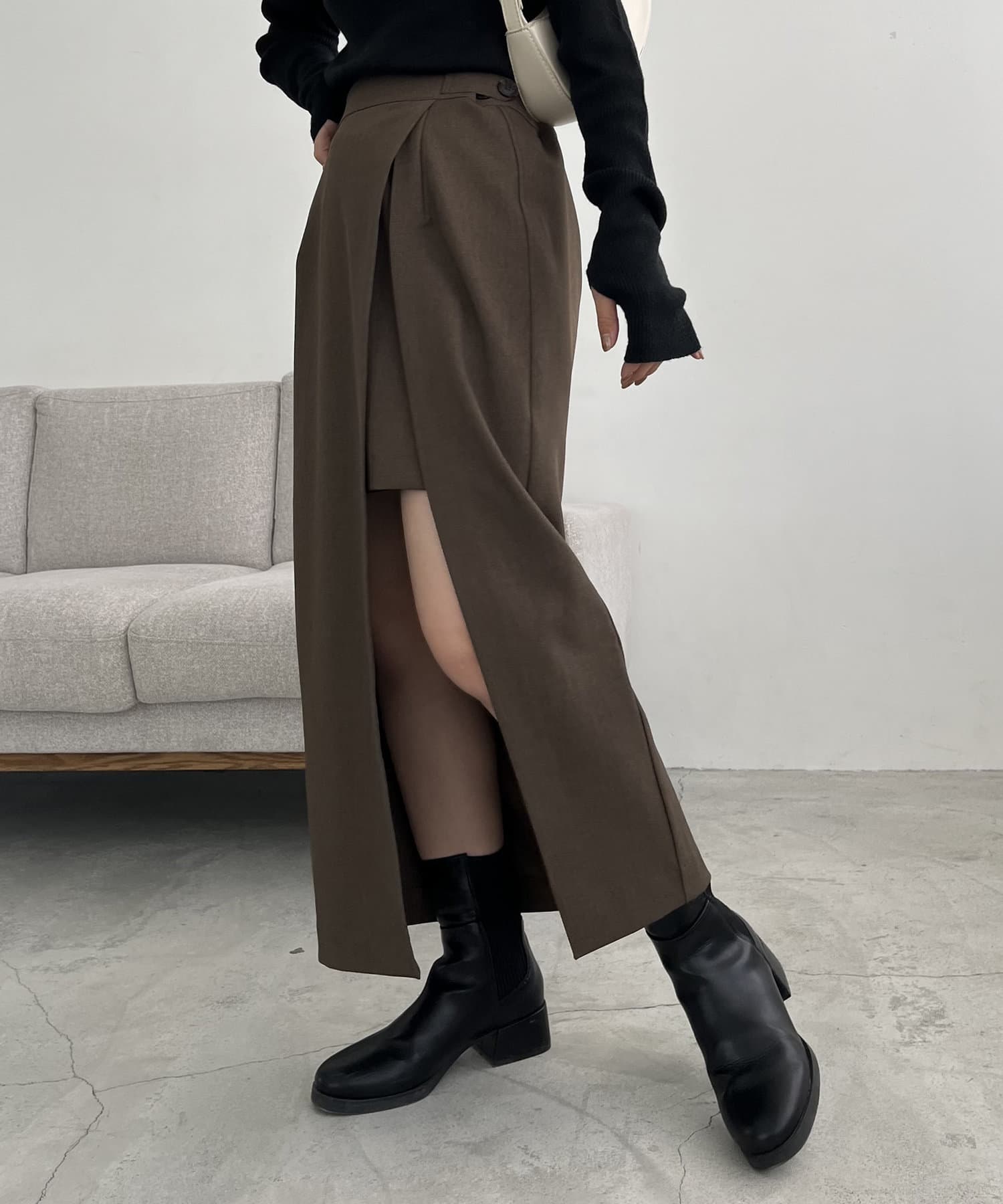 ・トレンドのミニ丈ボトムにIラインスカートがレイヤードされたデザイン