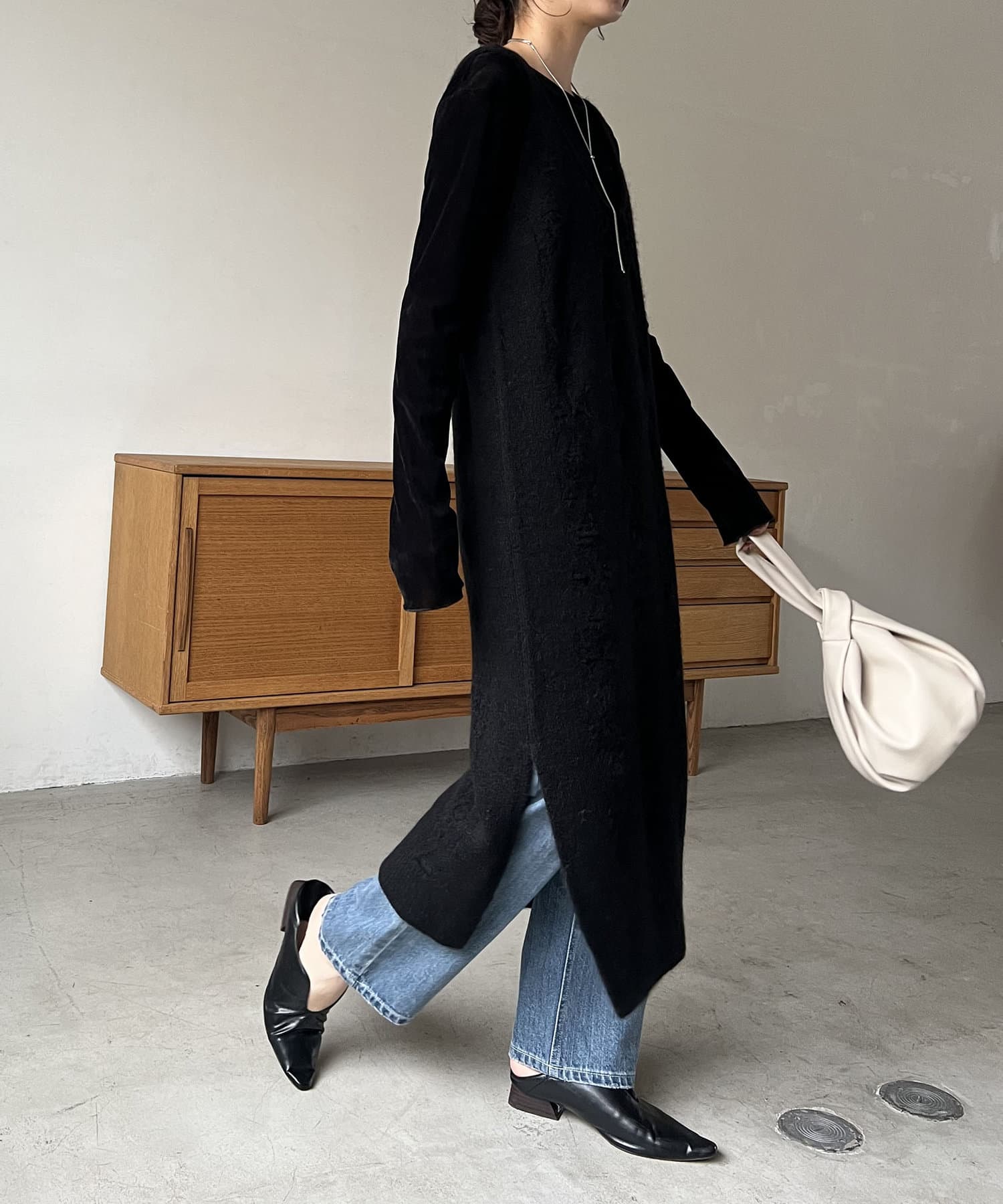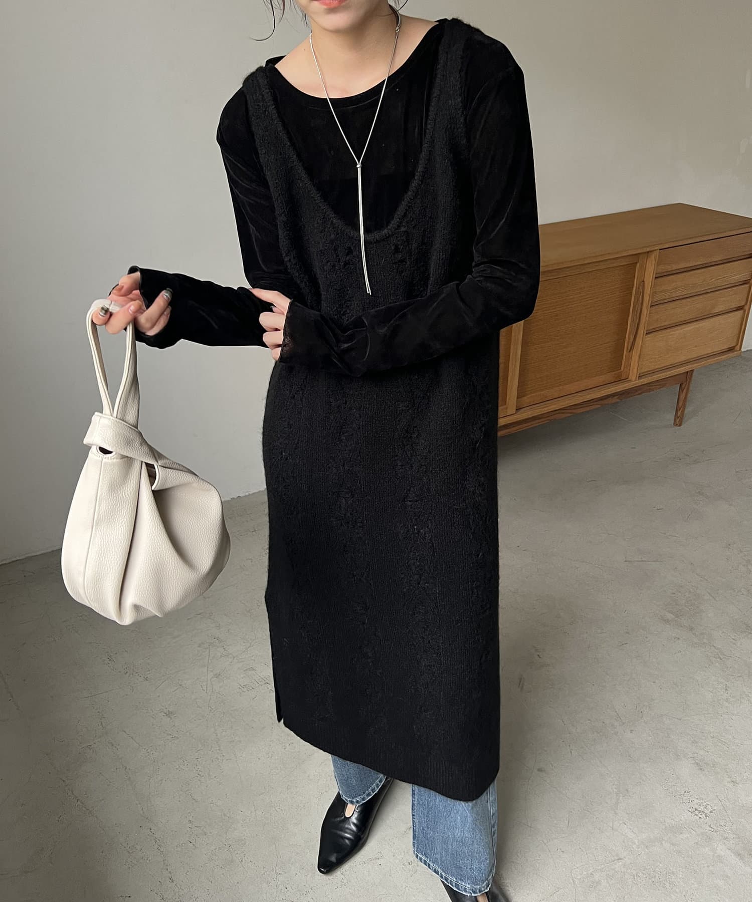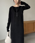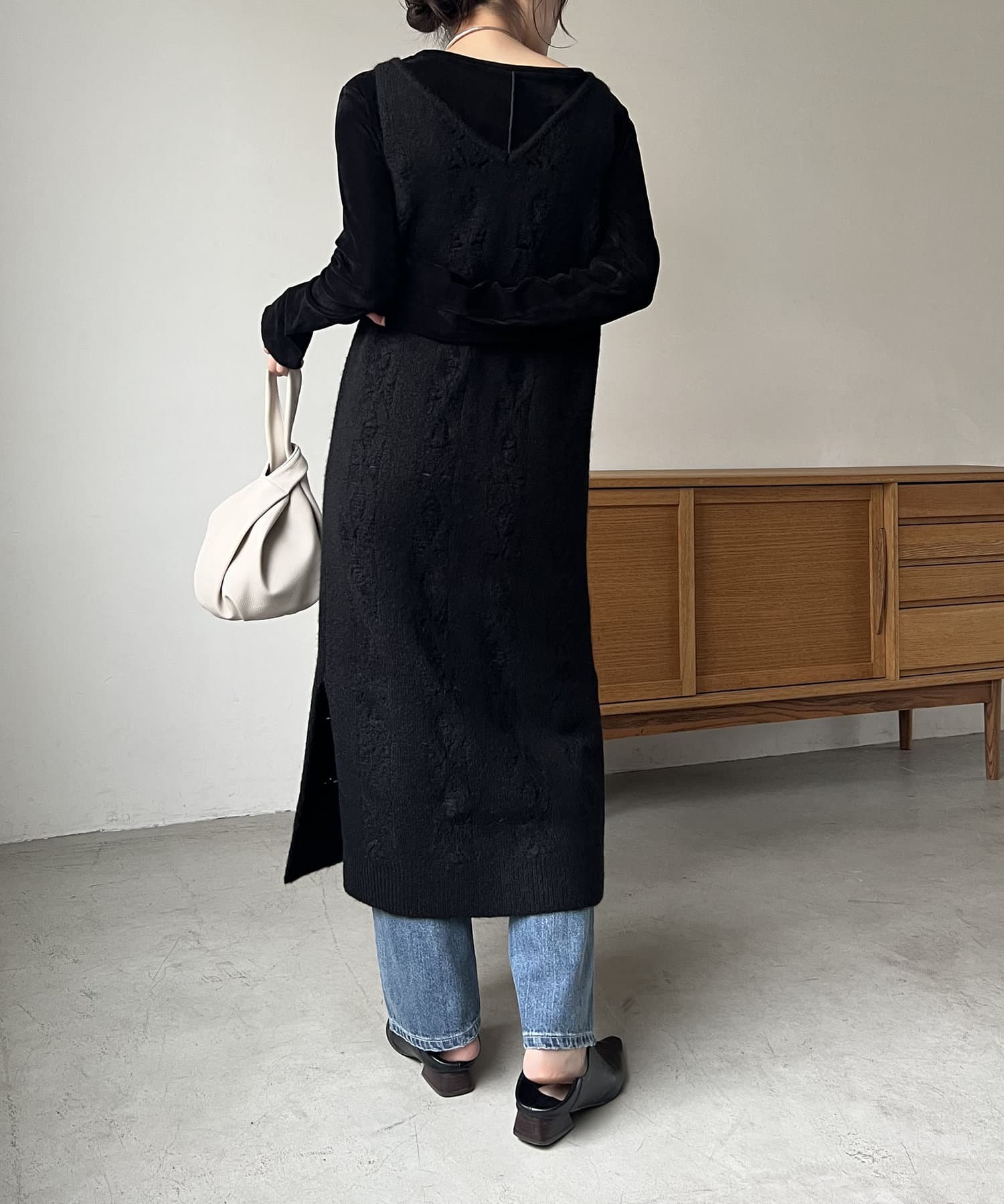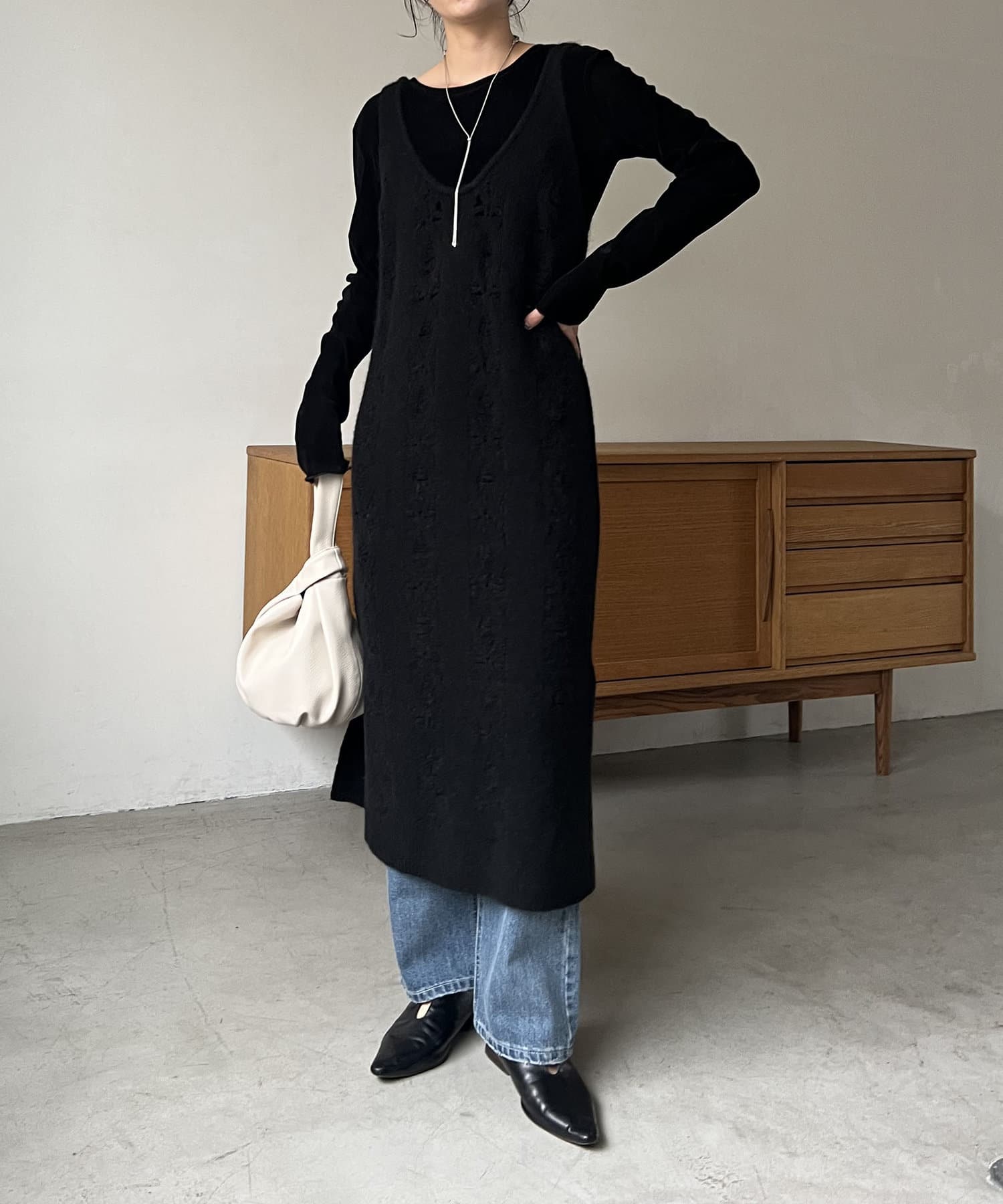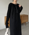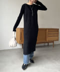 ・ニットワンピながらも生地感がしっかりめの編地で、身体のラインを拾いにくい
