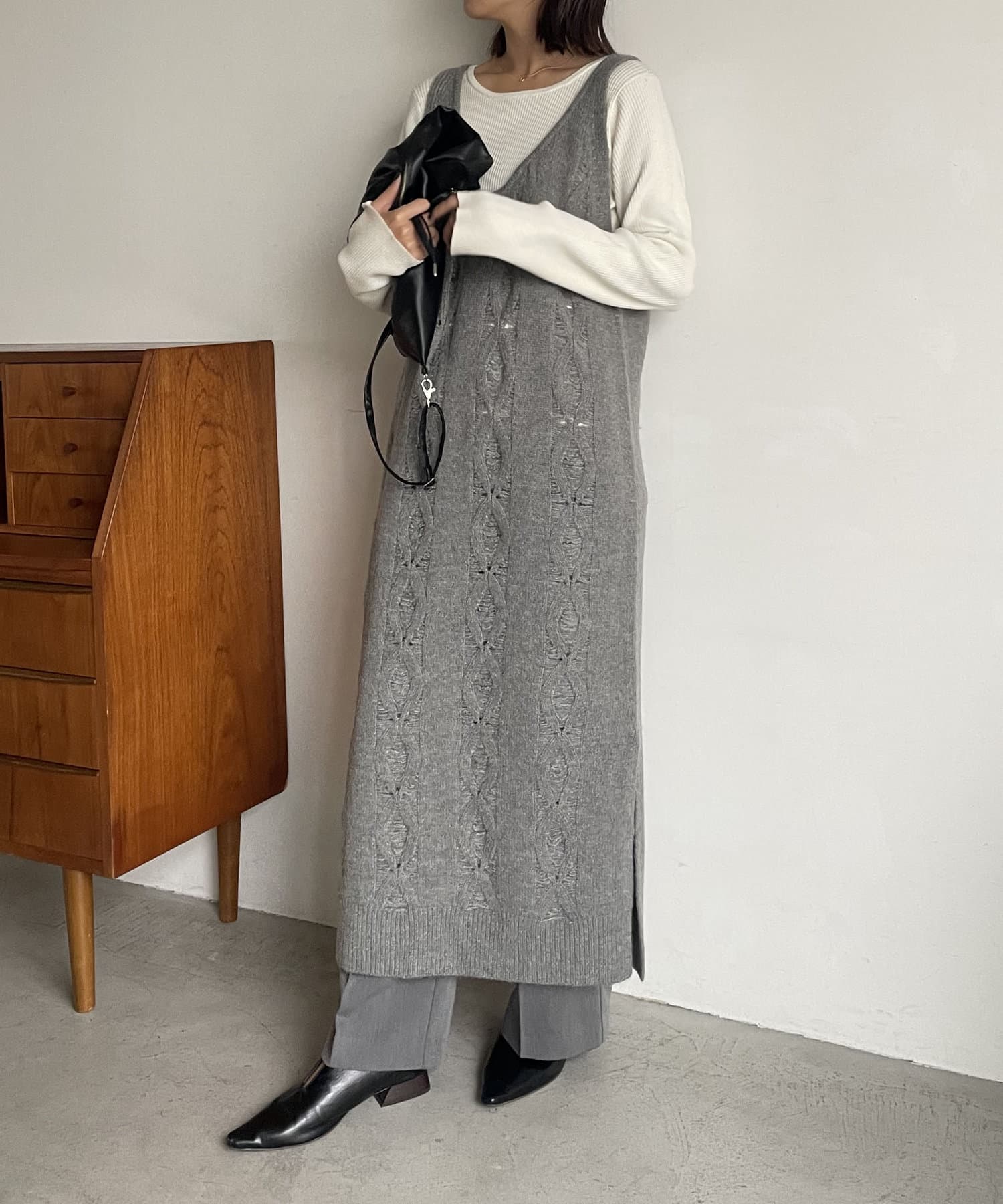 ・ジャンスカ型のシルエットなのでインナーはハイネックやロンTなどお好みで