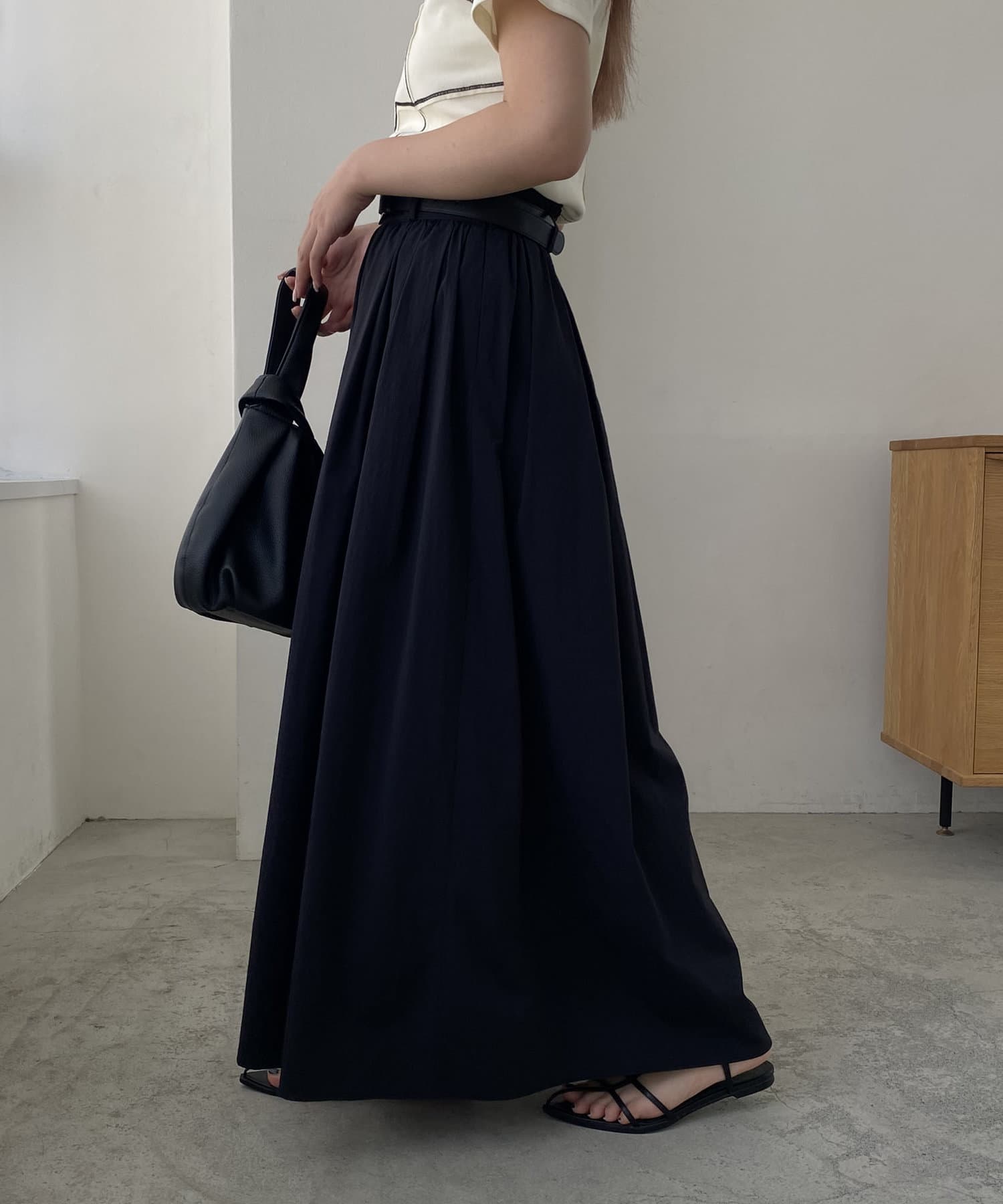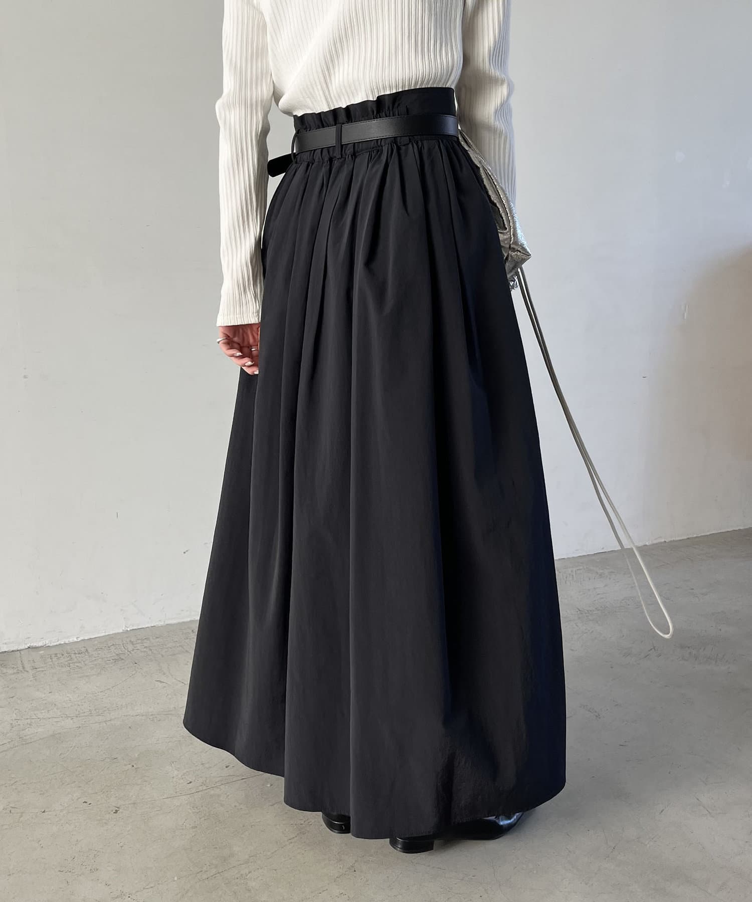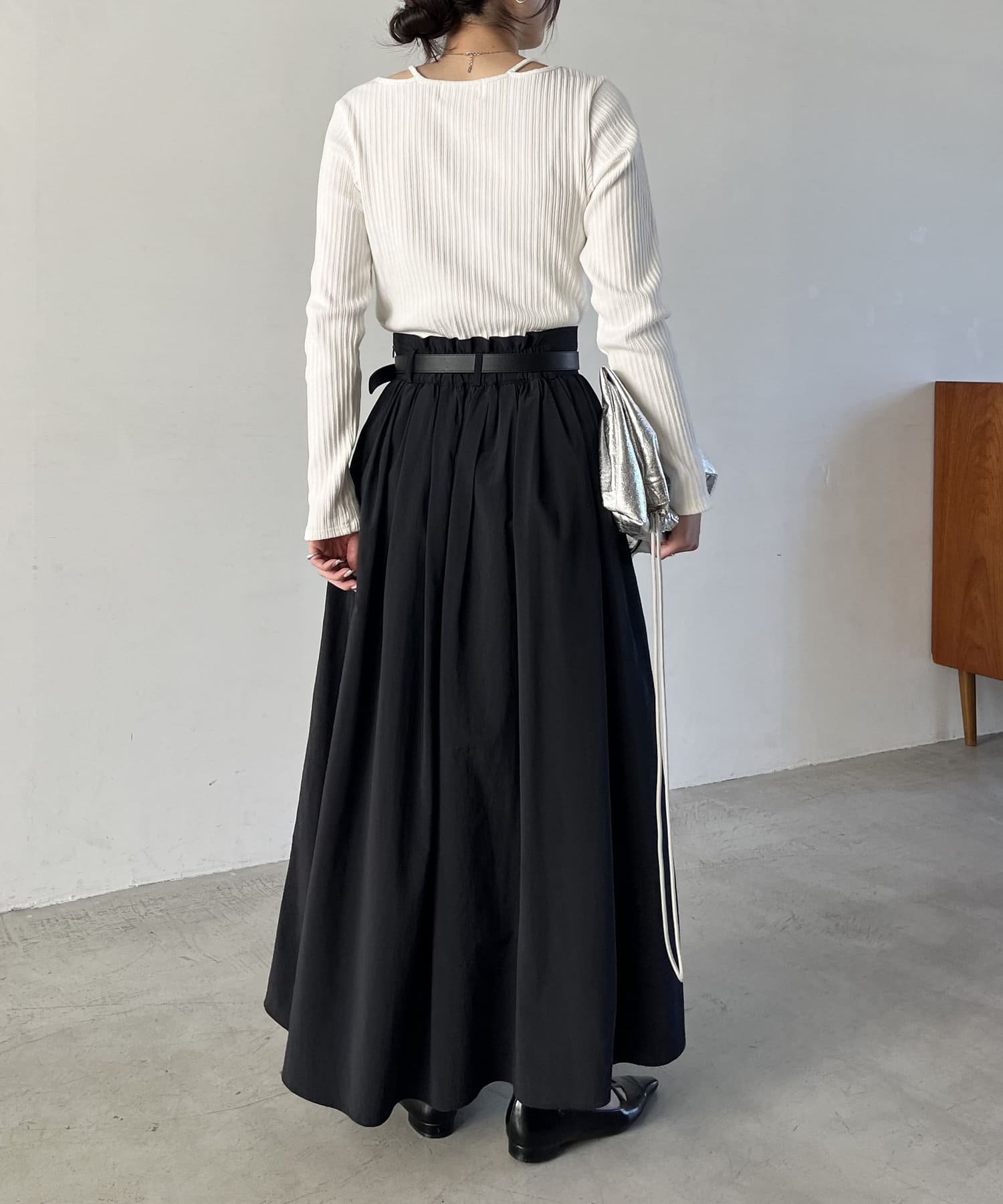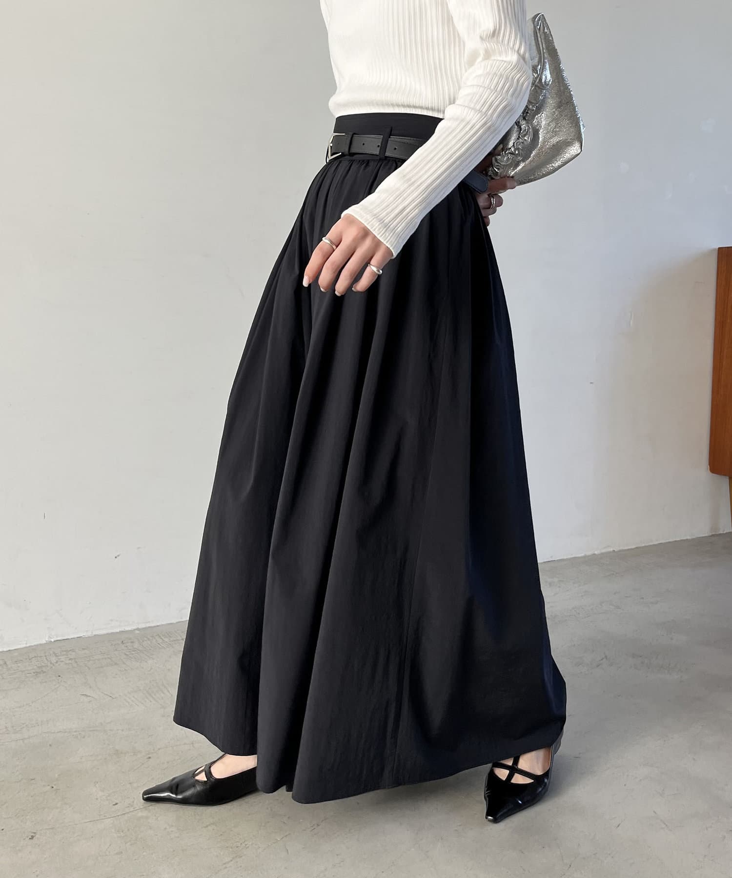 ・ウエストベルトが少し太めになっていて、ギャザースカート特有のウエスト周りのふくらみが気にならないデザインに