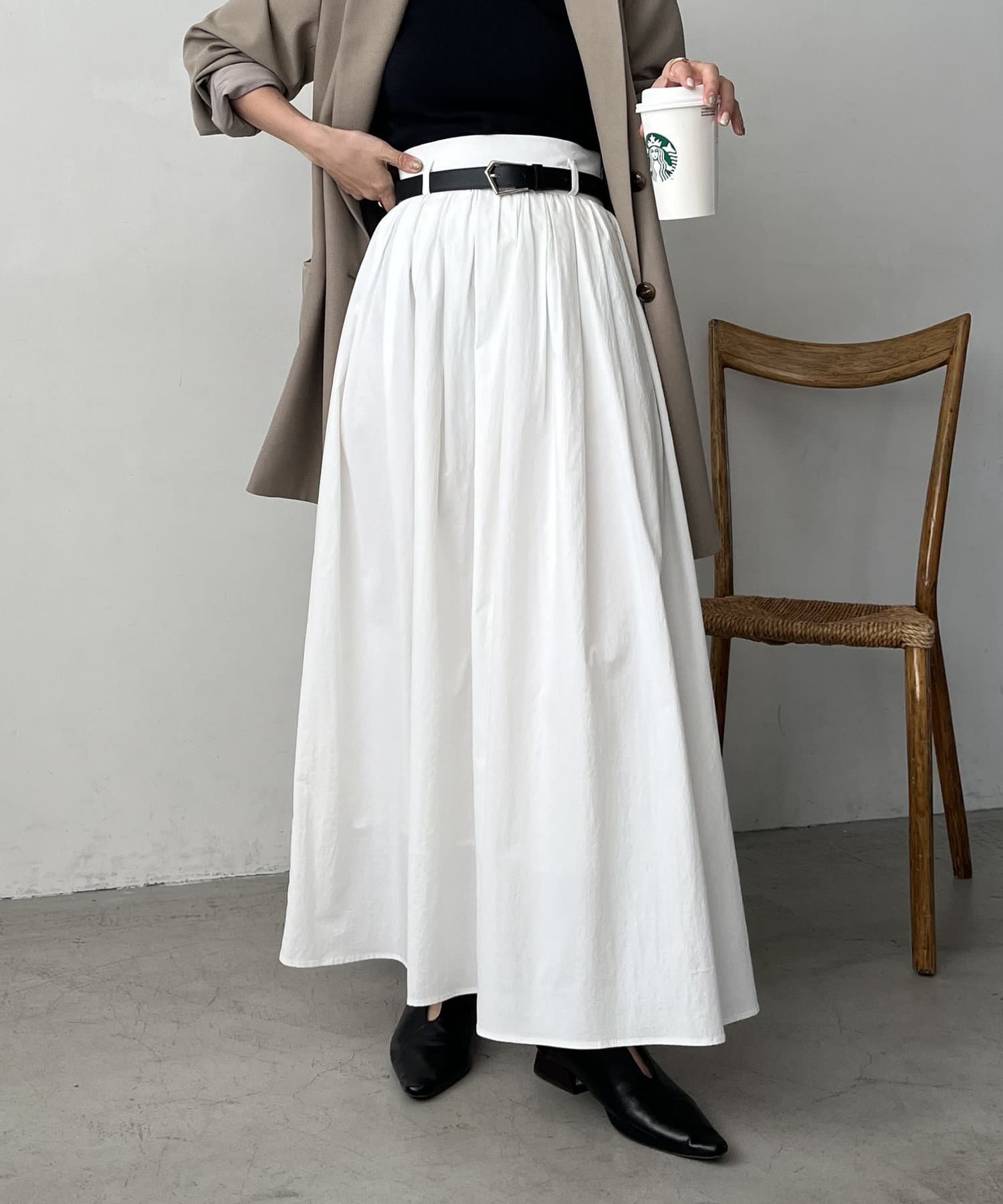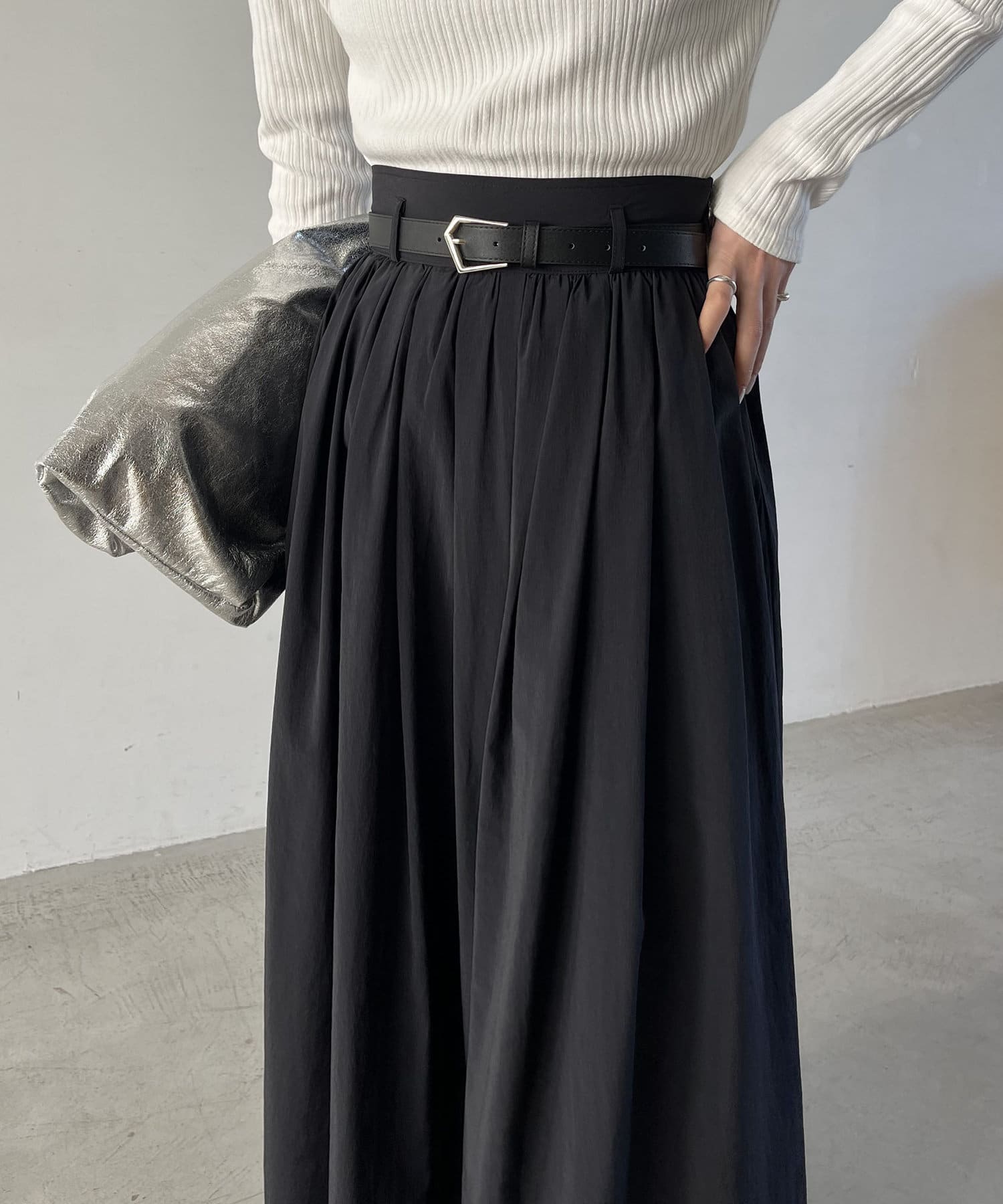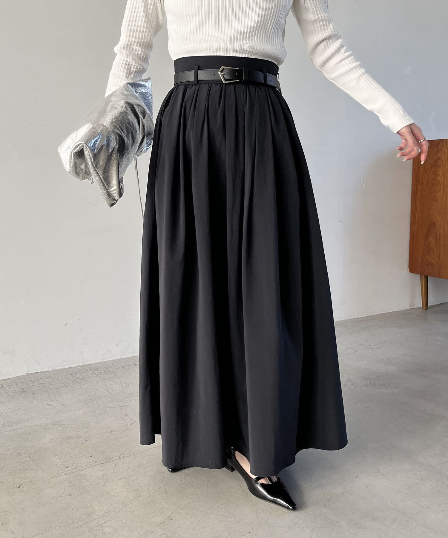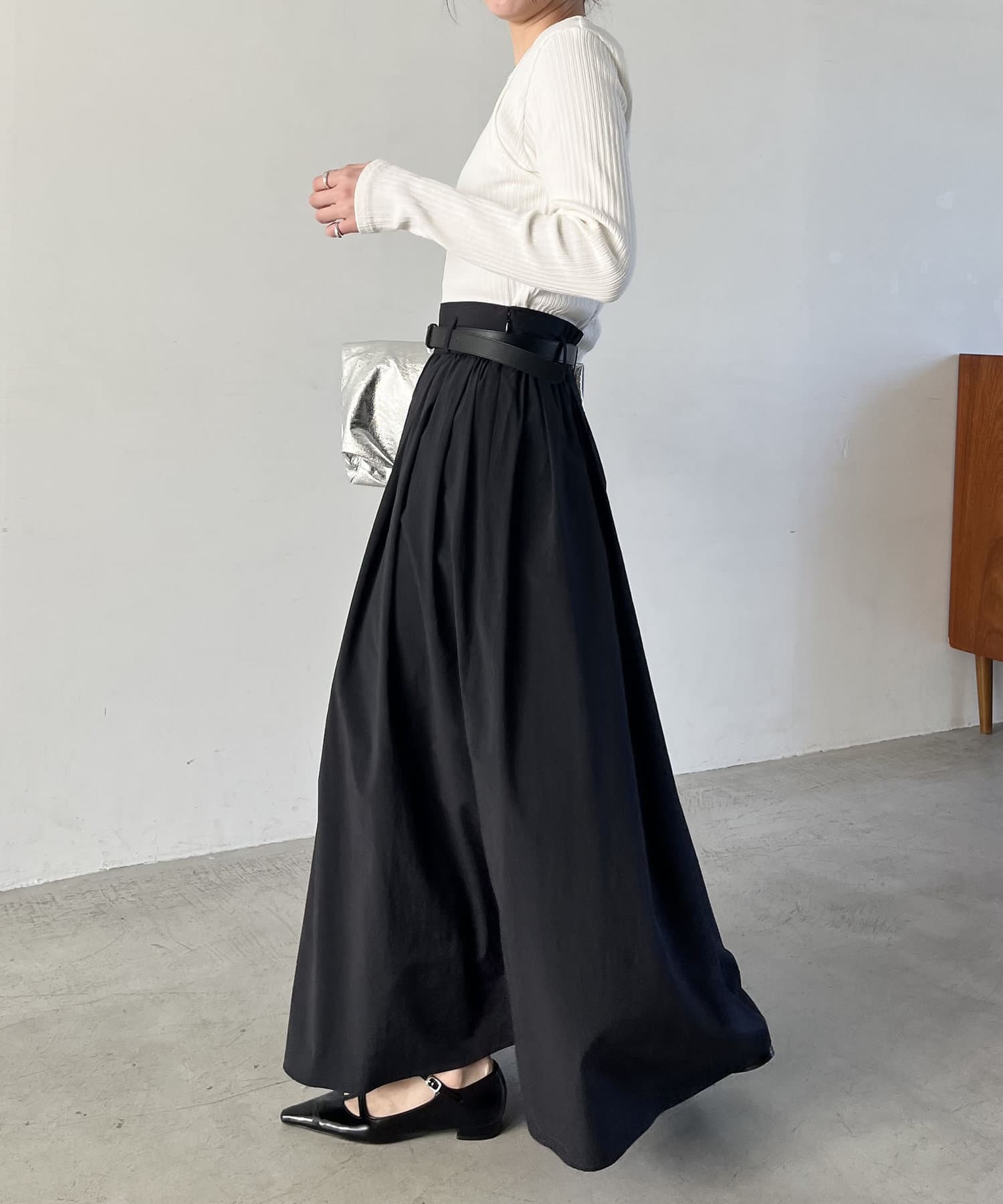 ・ウエストベルトが少し太めになっていて、ギャザースカート特有のウエスト周りのふくらみが気にならないデザインに