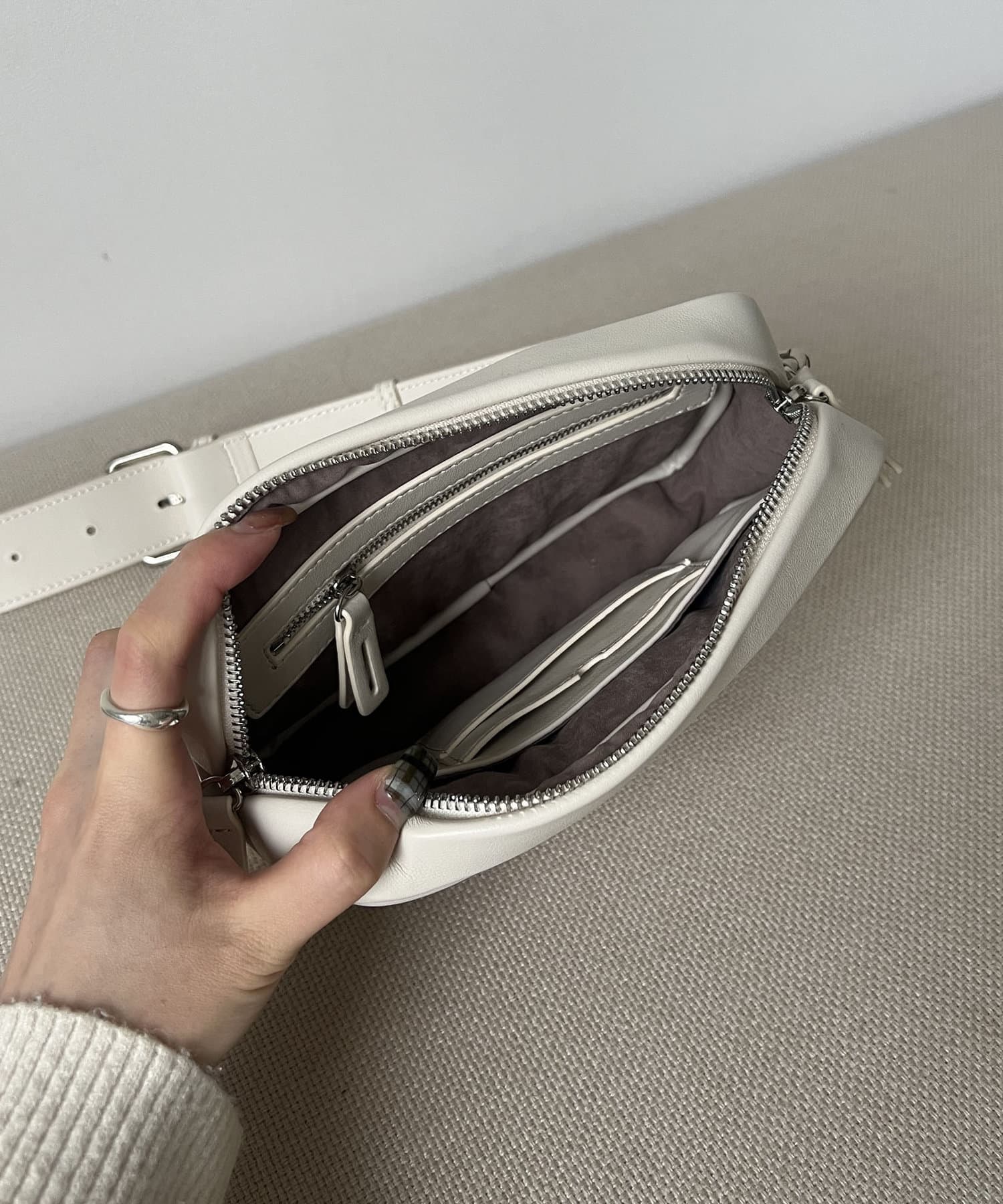 ・太めのショルダーストラップのクロスボディでスポーティなコーディネートにも使える。
