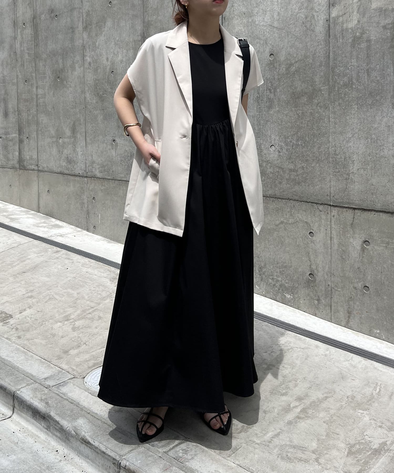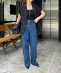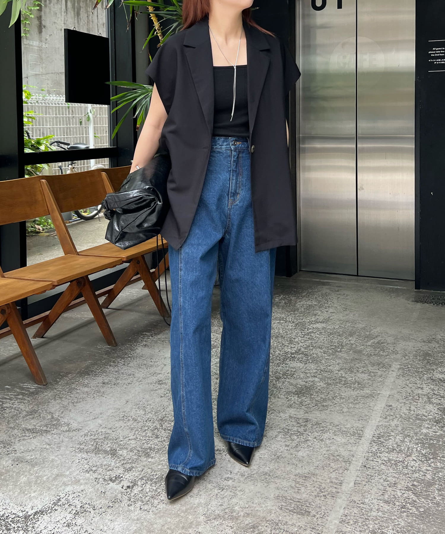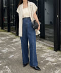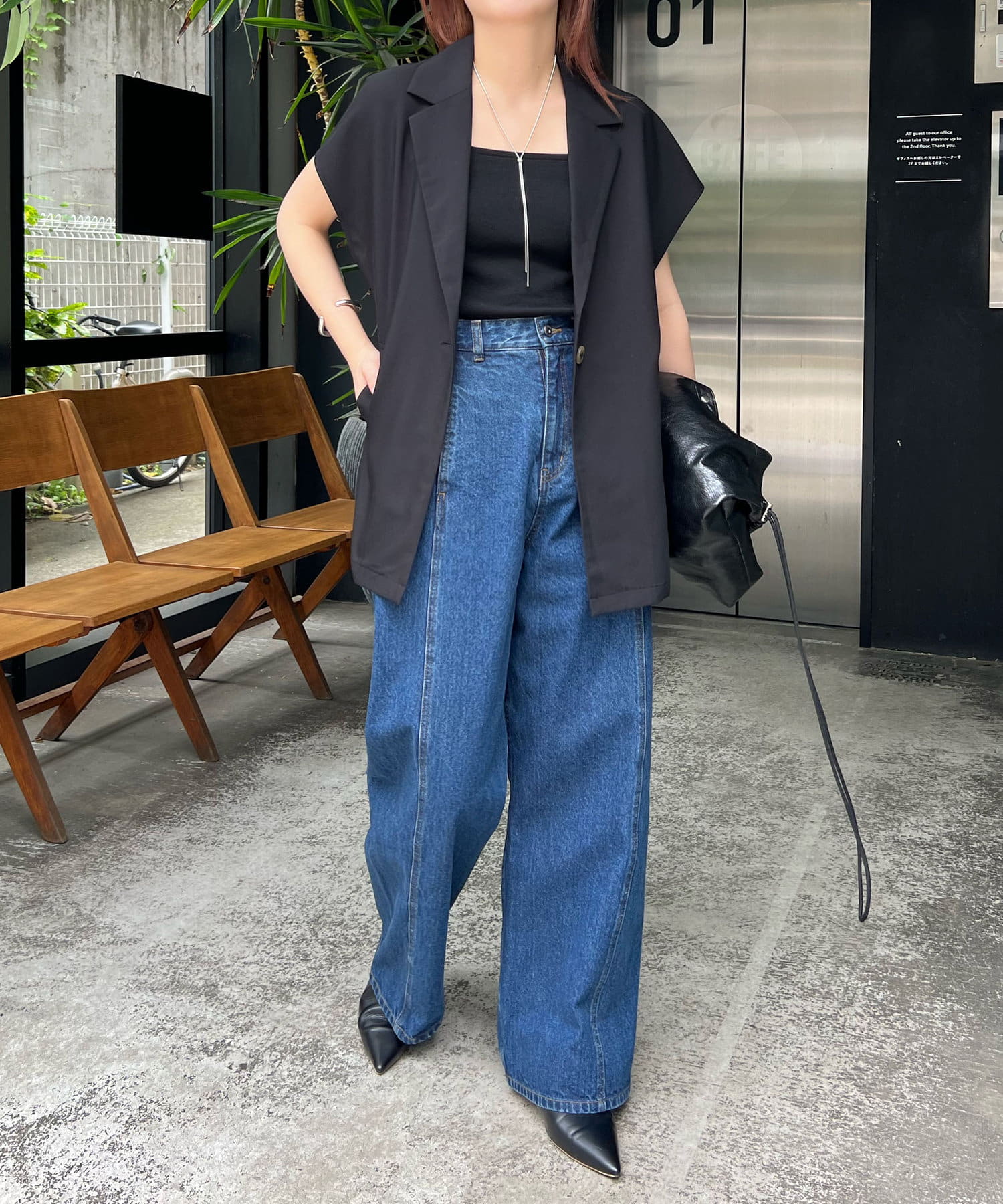 ・ギャザー切替ワンピース、切替ワイドストレートデニムとの合わせも
