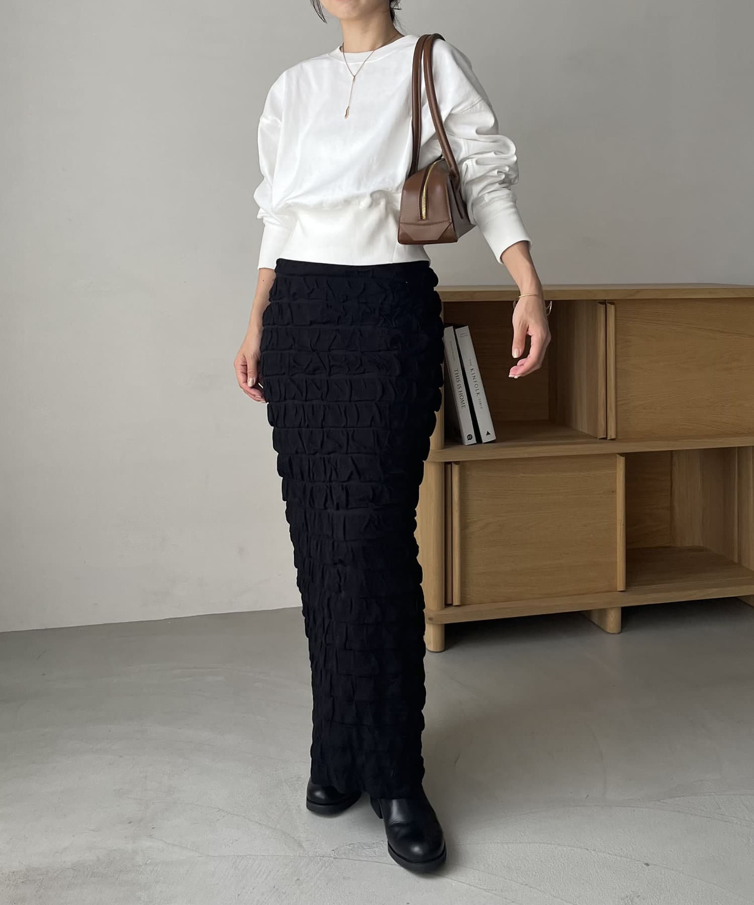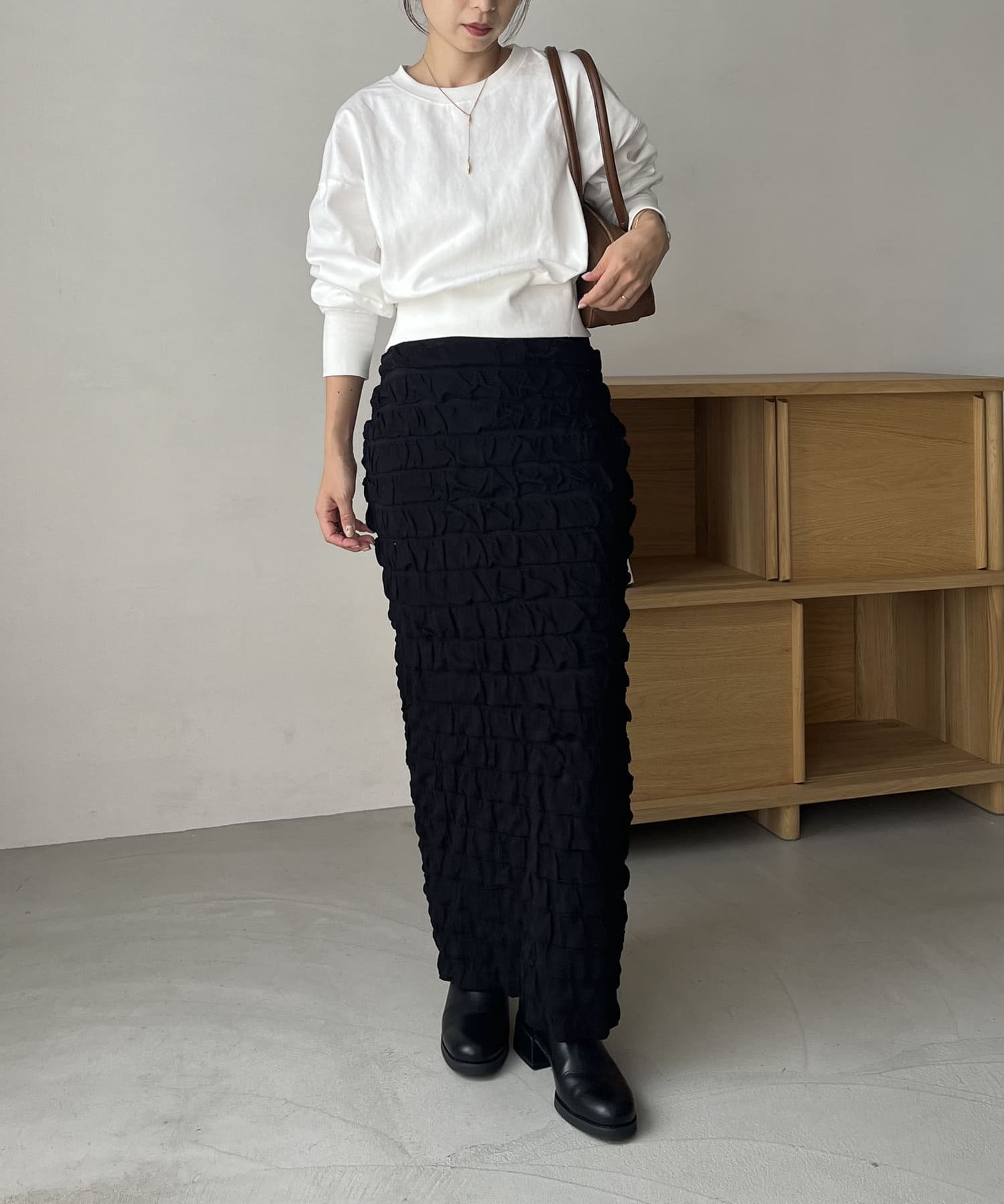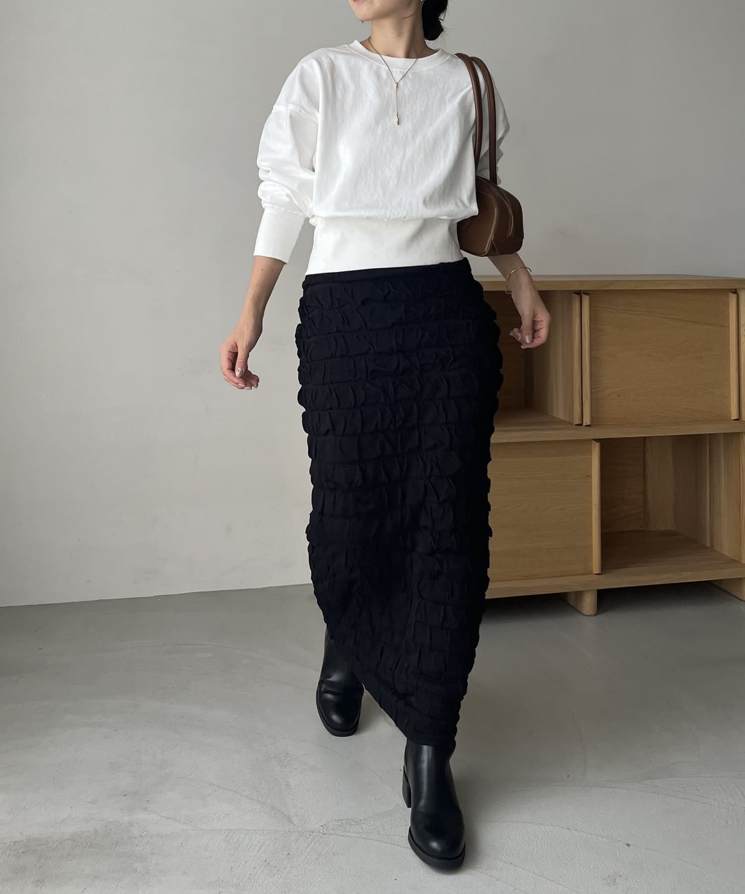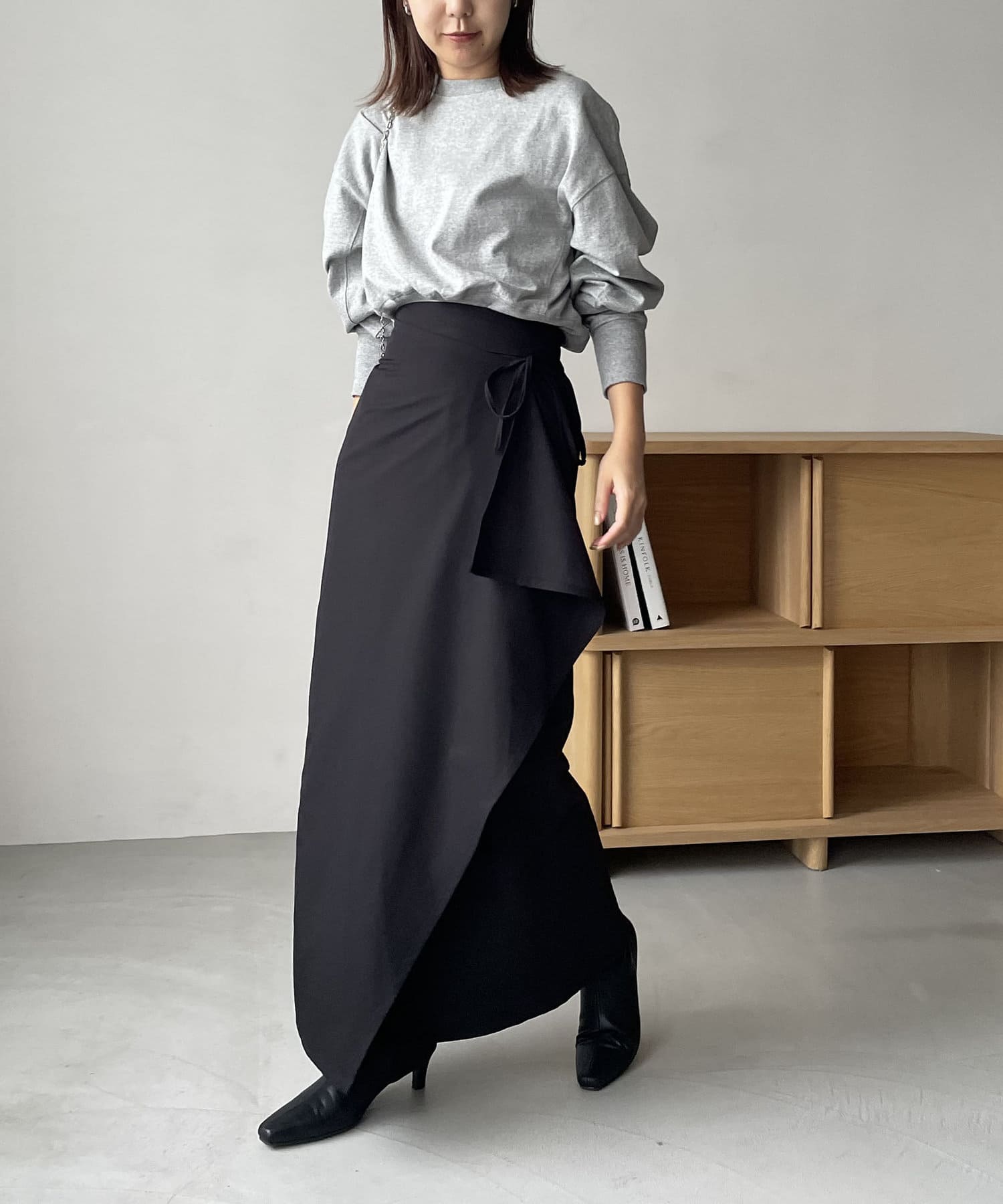 ・カジュアルなアイテムなのでマキシスカートやスラックスなどに合わせるのがおすすめ