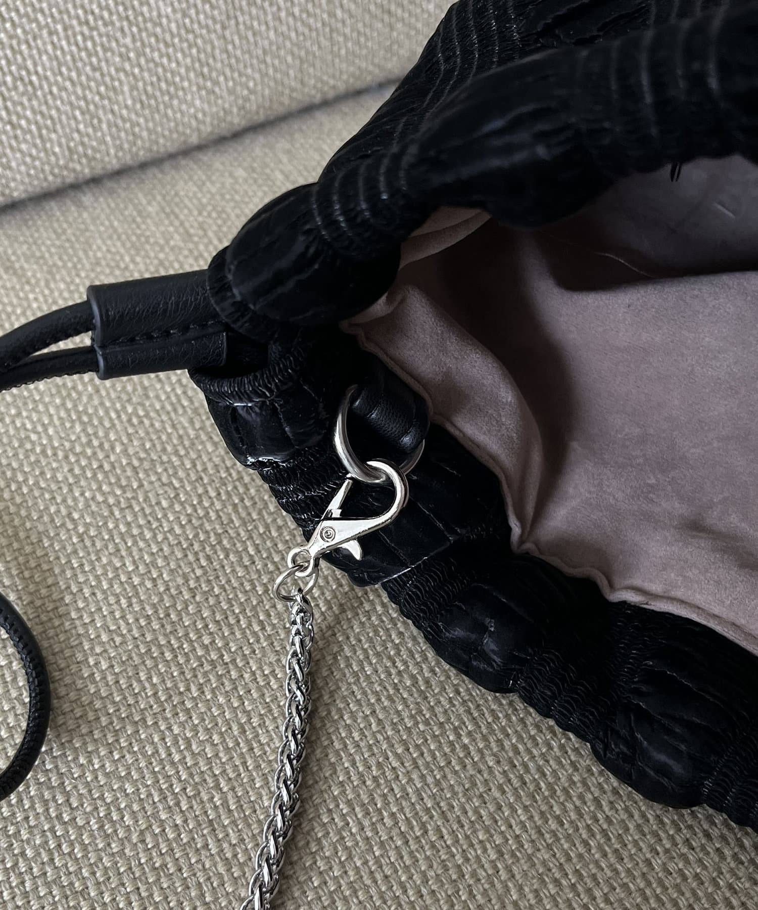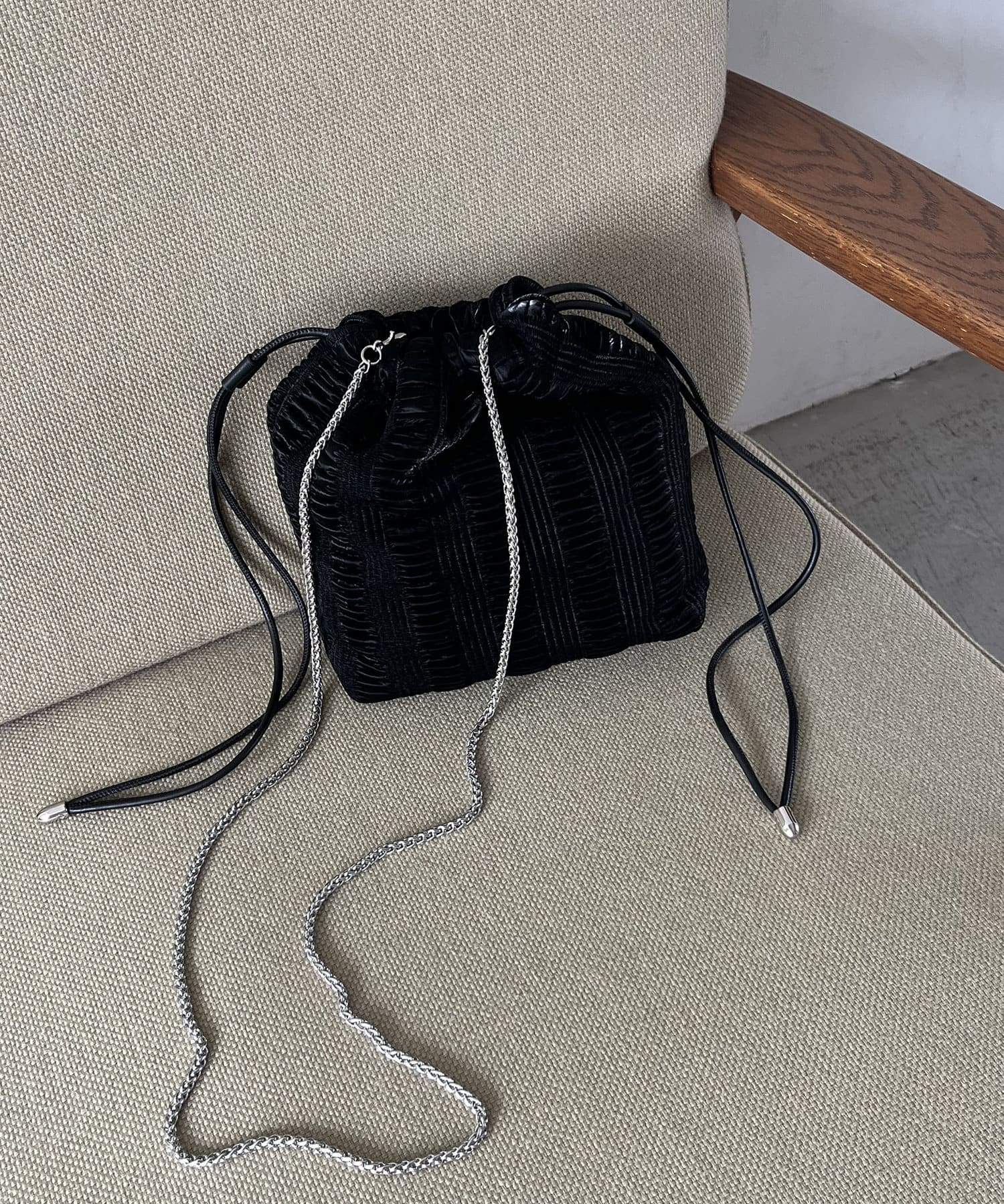 ・カジュアルな巾着にきれいめなチェーンショルダーがアクセントになり、幅広いシーンで持てる