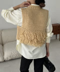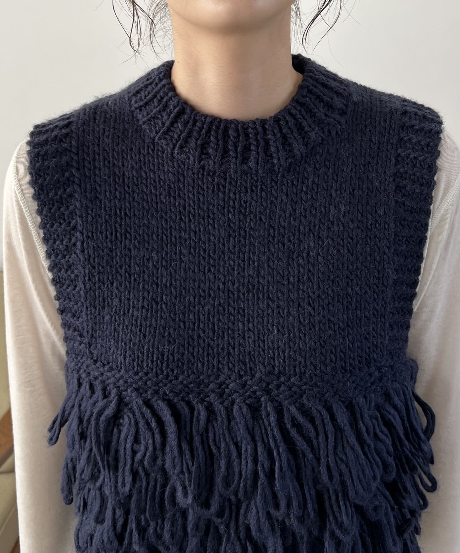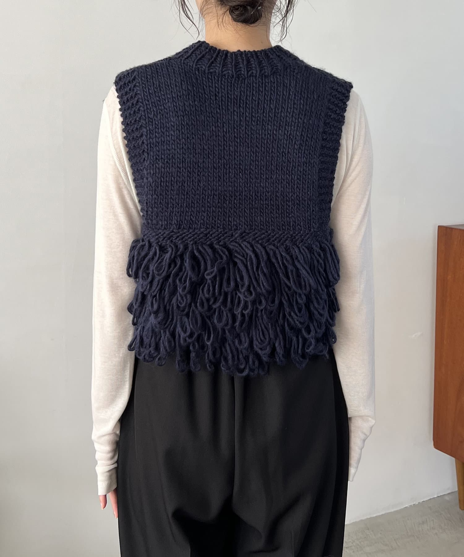 大胆なループ編みをポイントにした手編みニットベスト