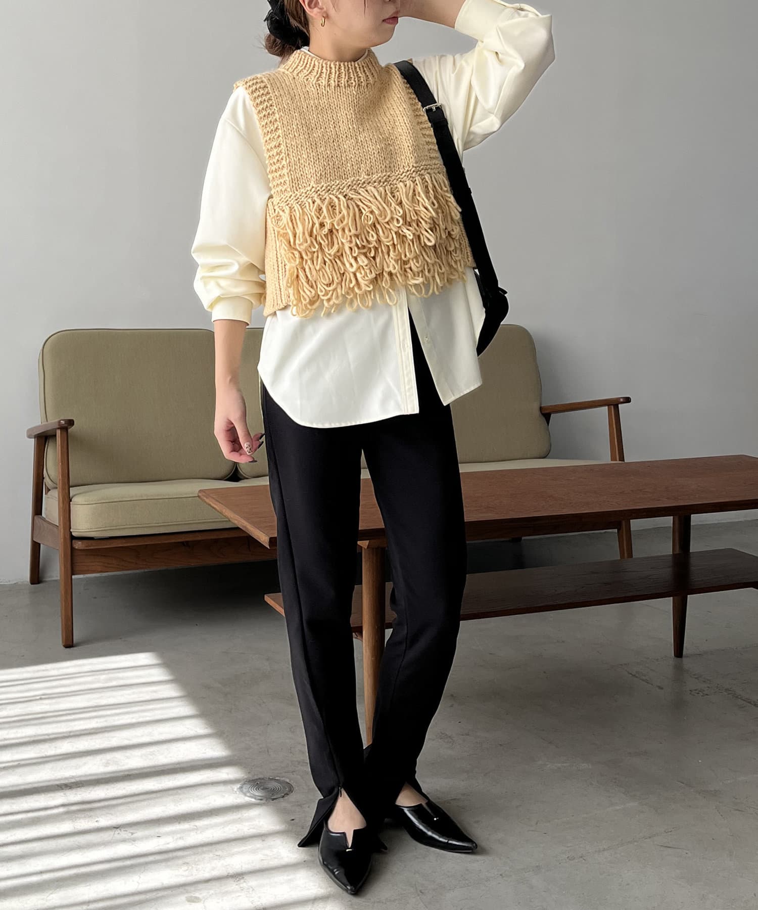 【ベージュ着用アイテム】インナー:クロスビスチェシャツ パンツ:<YENN>フロントスリットスリムパンツ