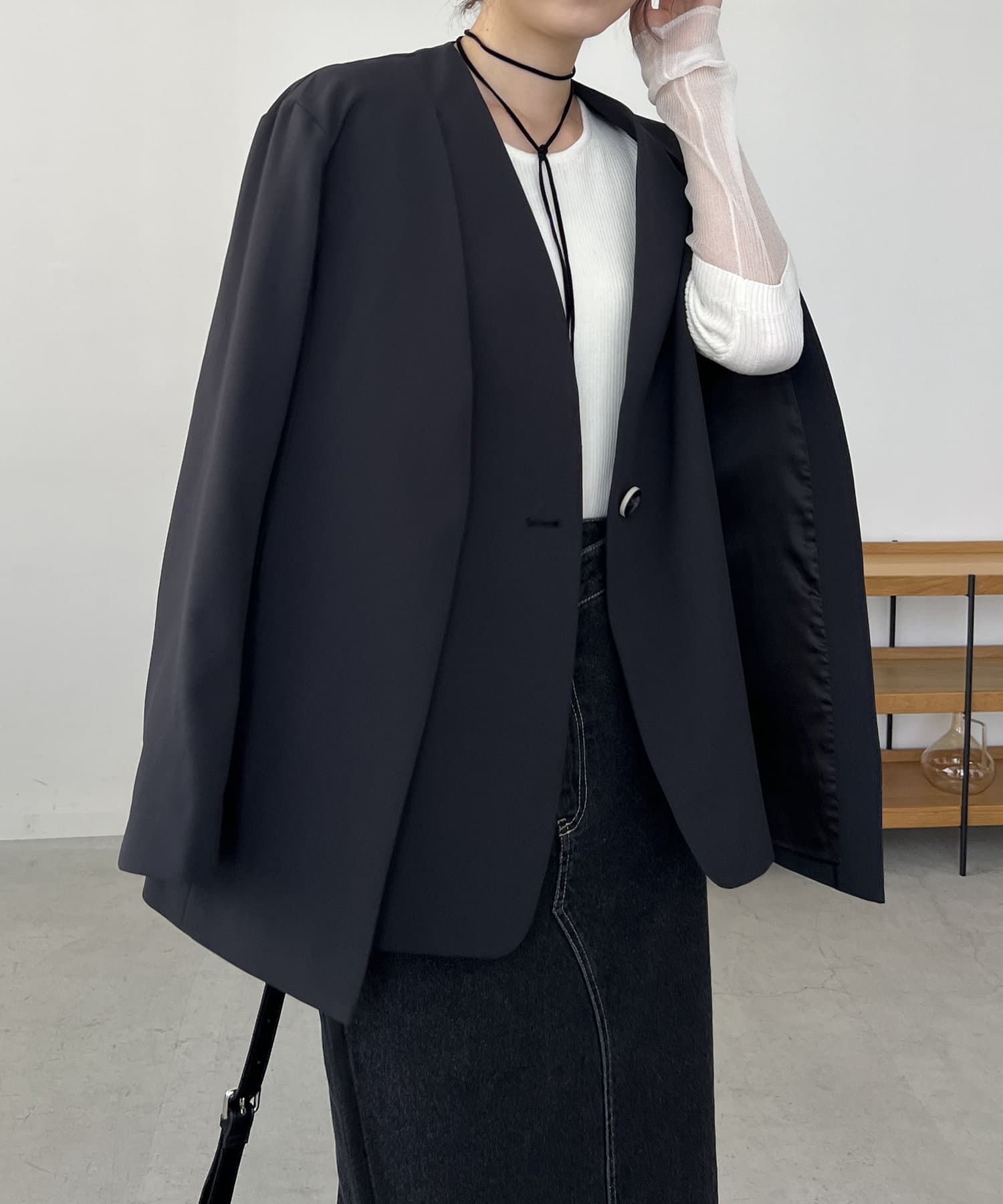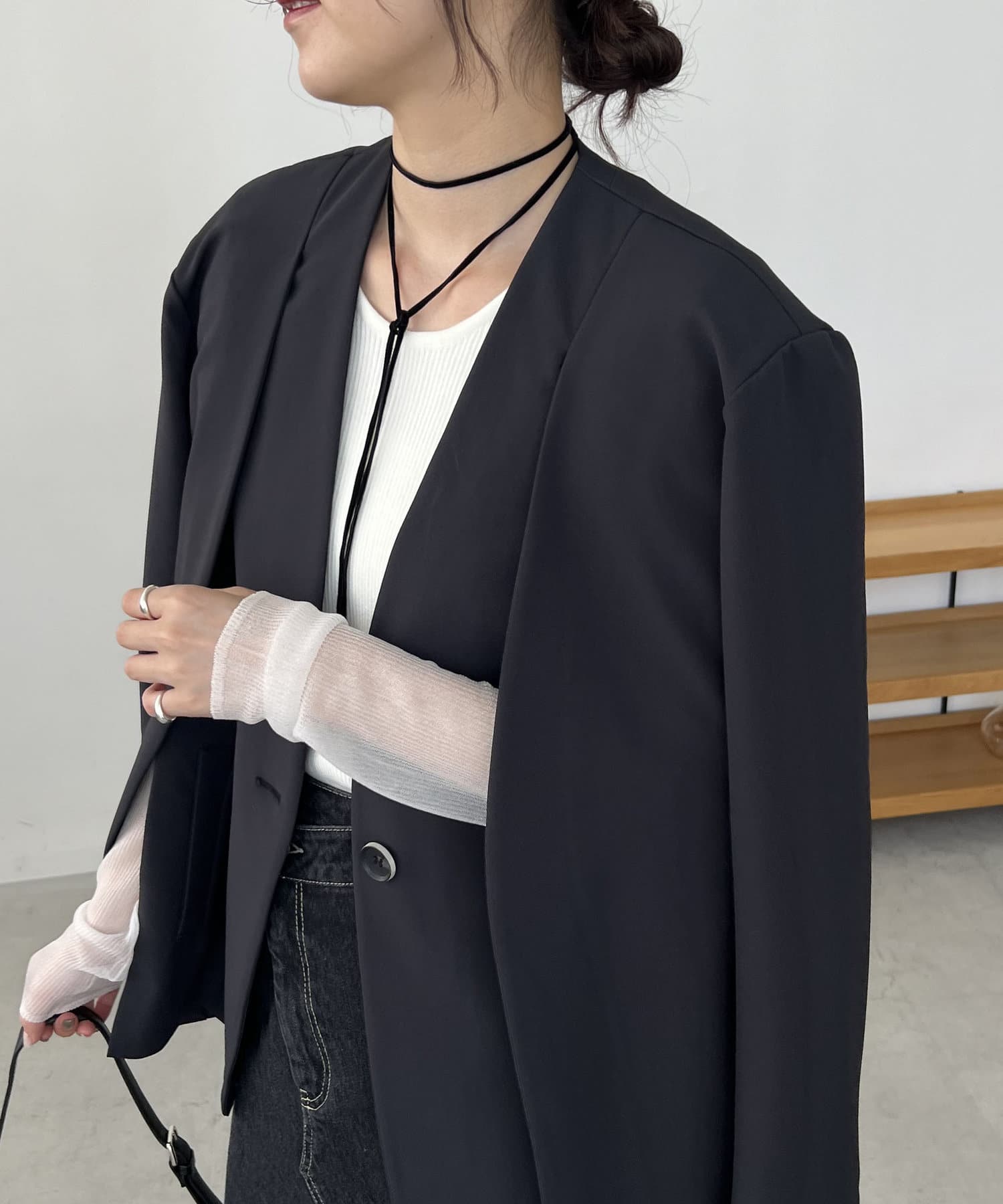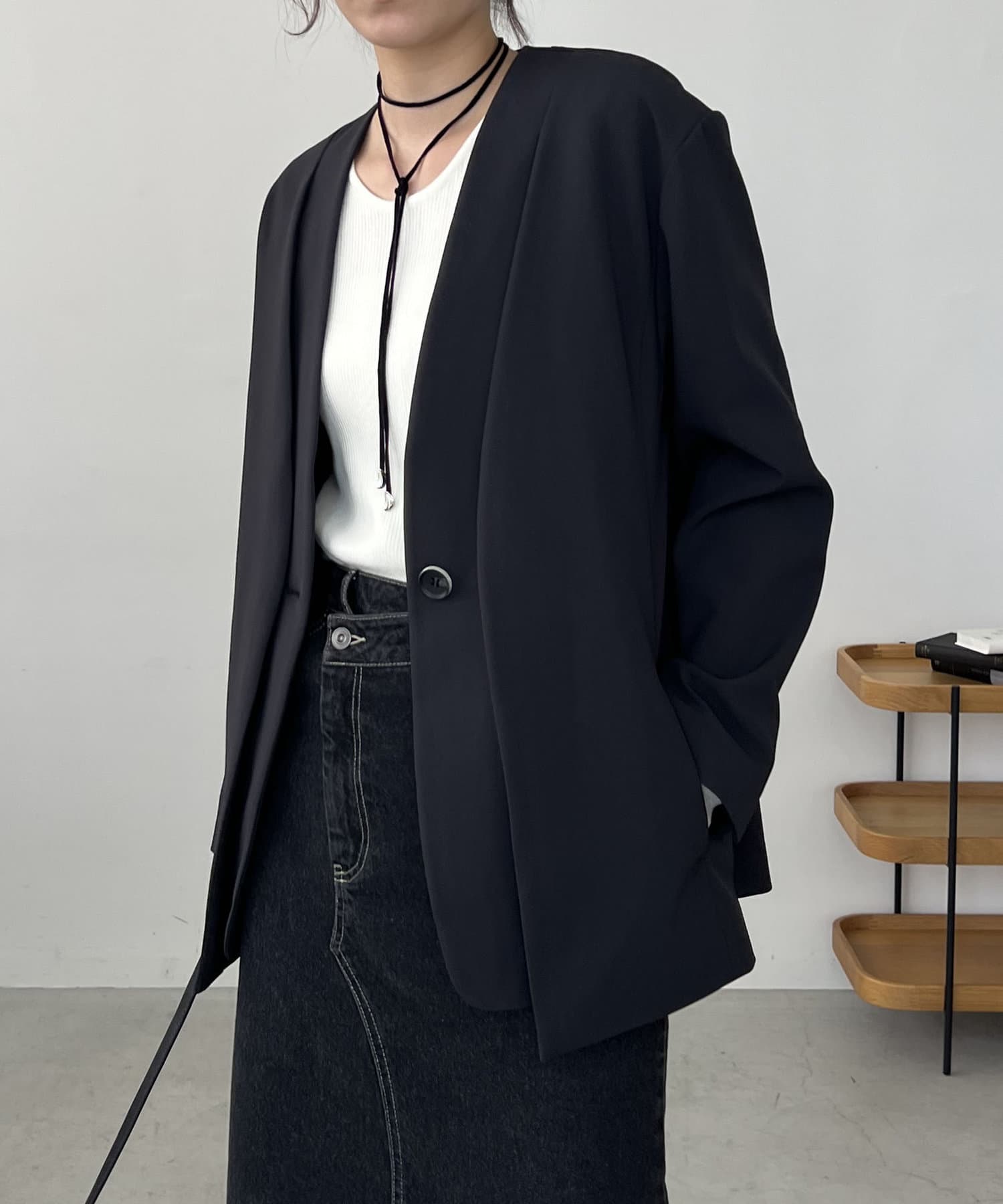 ・ジレをセットしたように見えるノーカラージャケットはベーシックで年代を問わず着られる