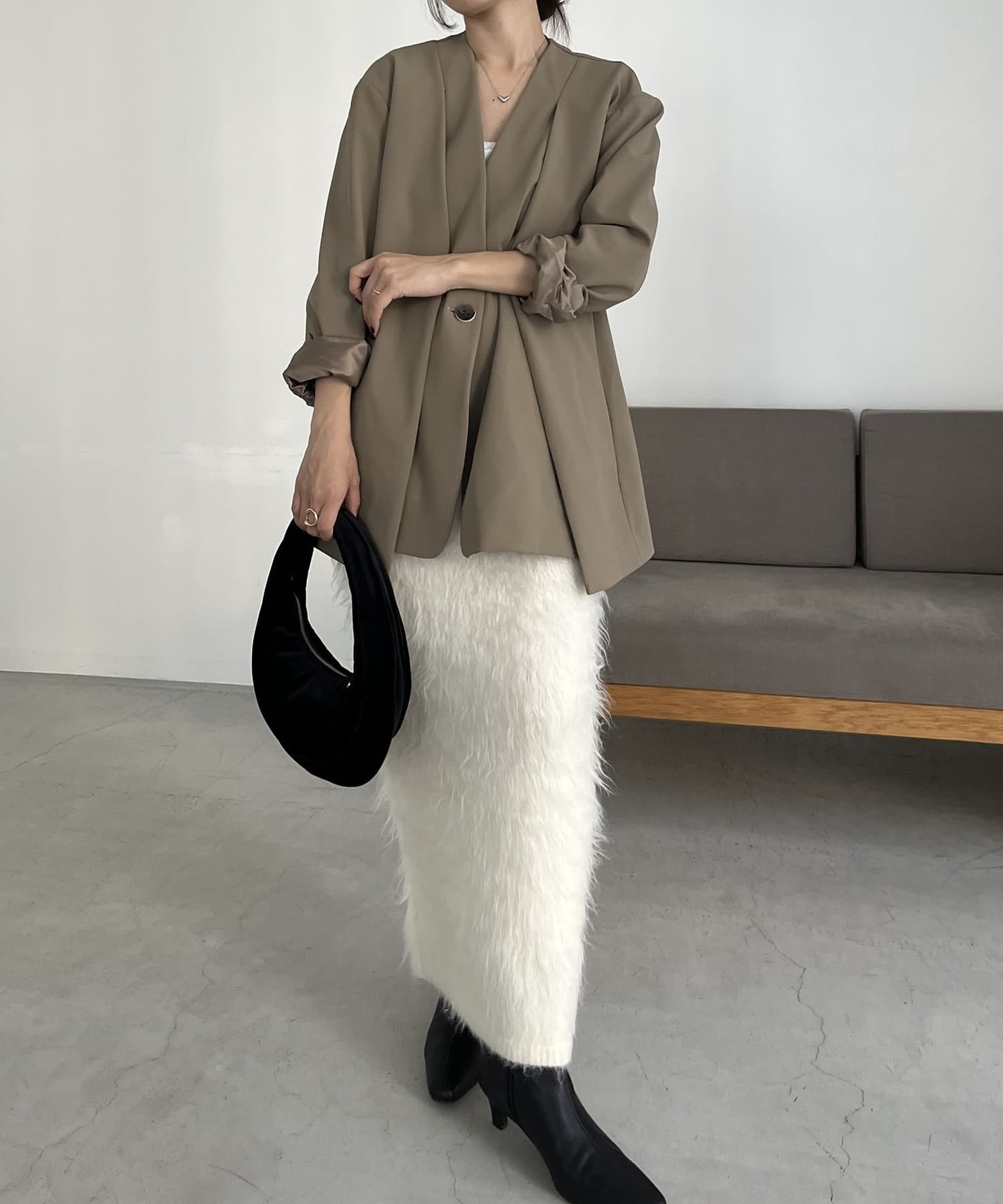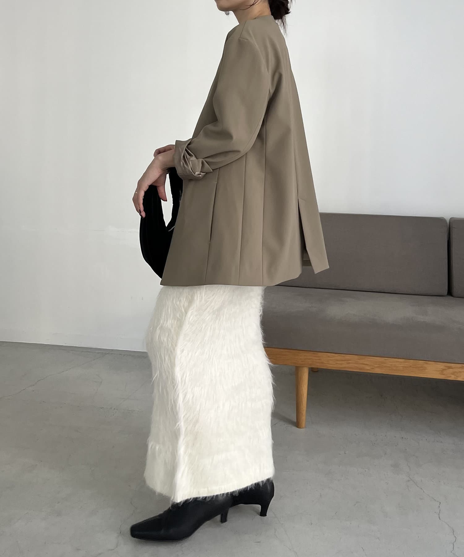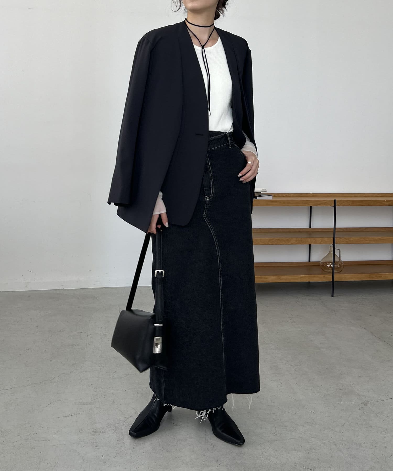 ・ジレをセットしたように見えるノーカラージャケットはベーシックで年代を問わず着られる
