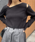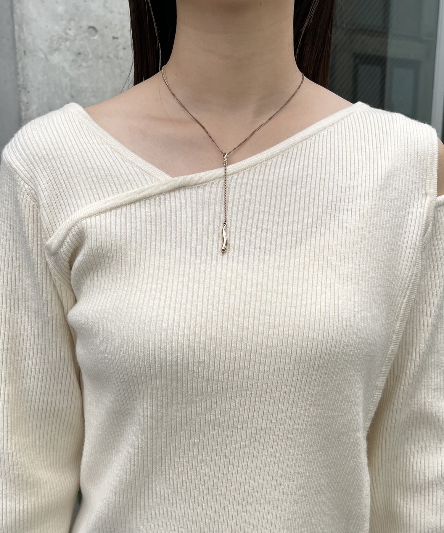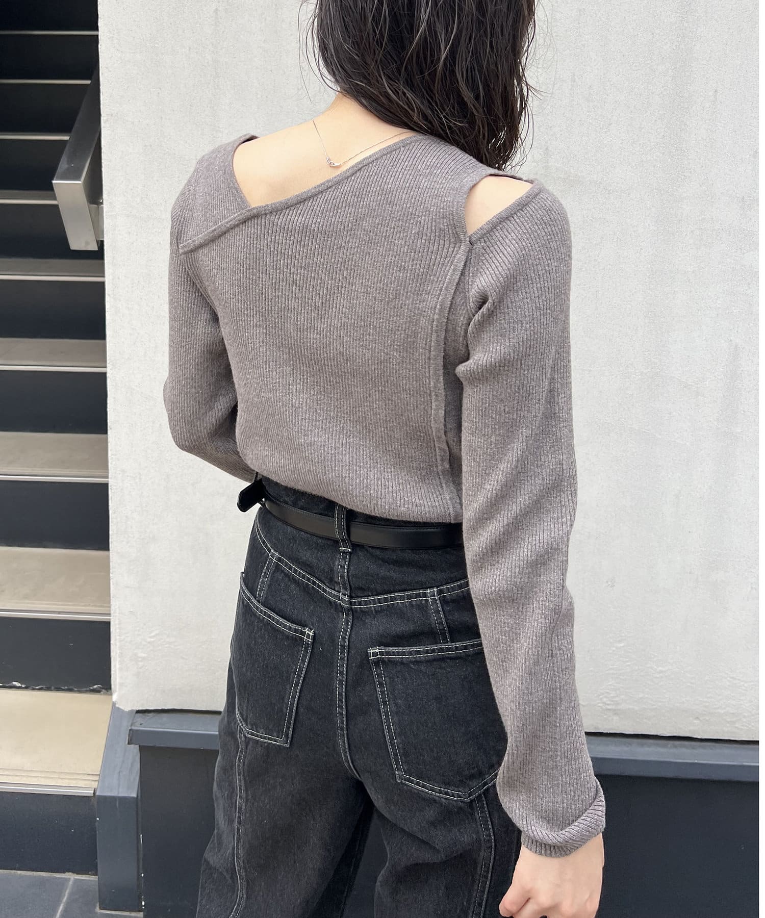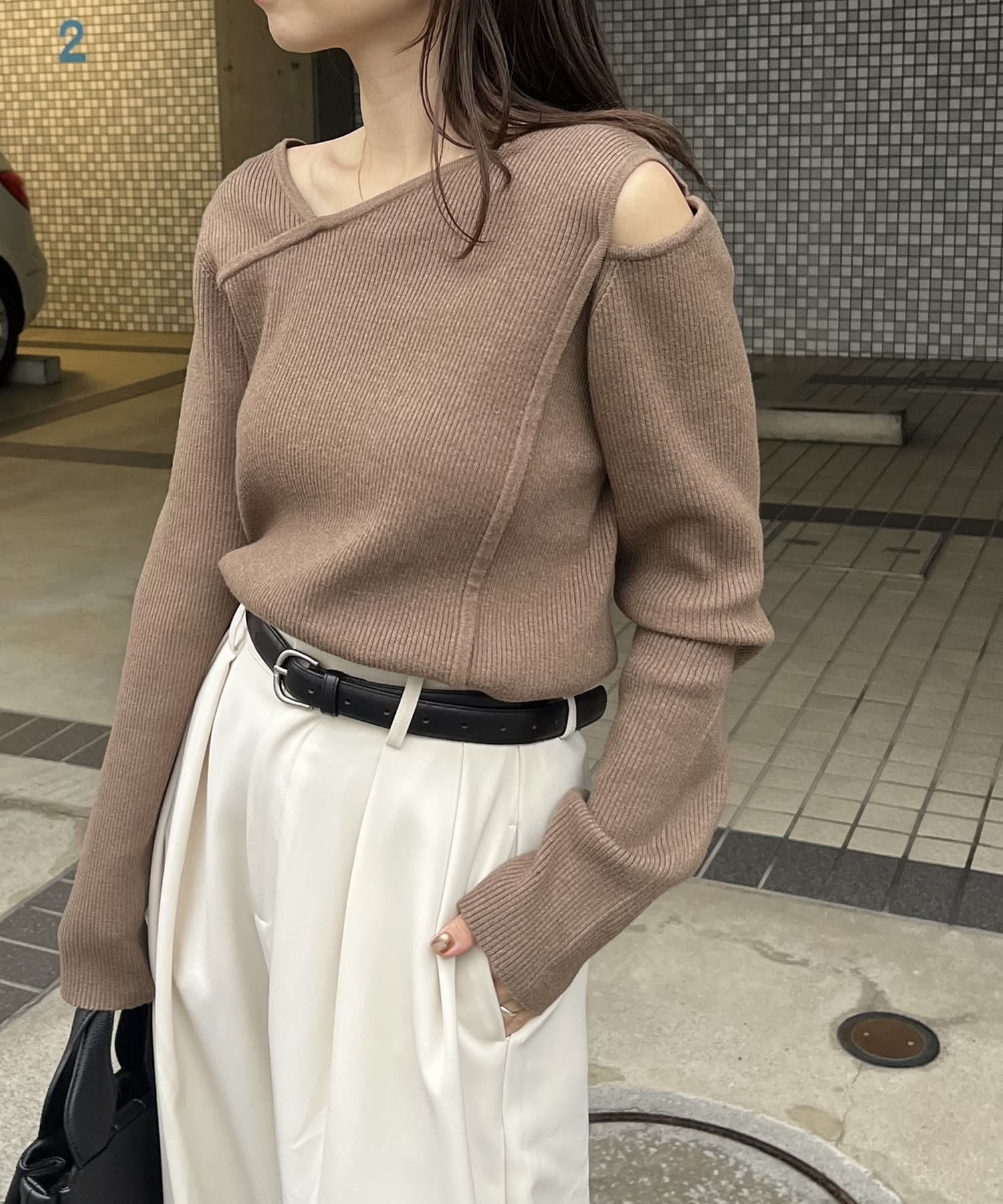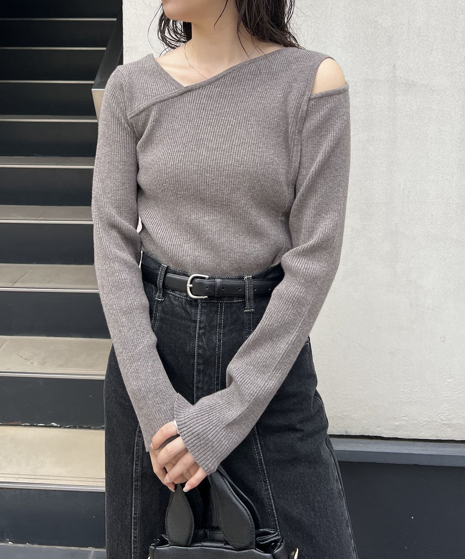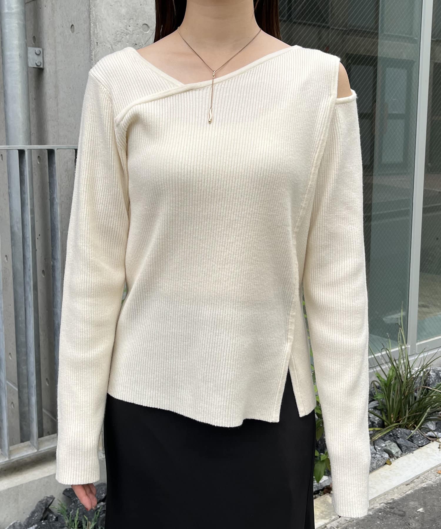 アシメVネックと肩開きのデザインが他にないデザインリブニット